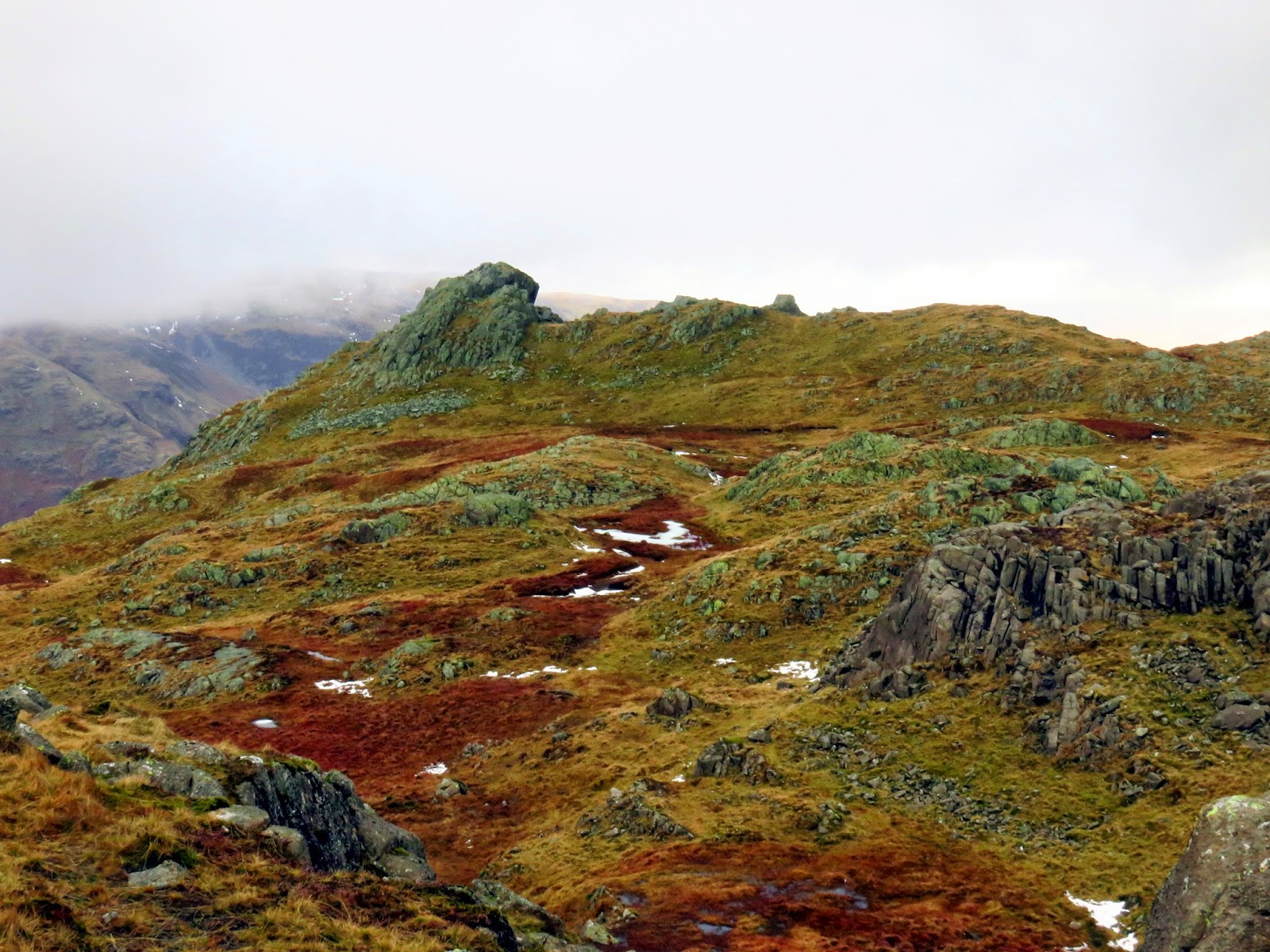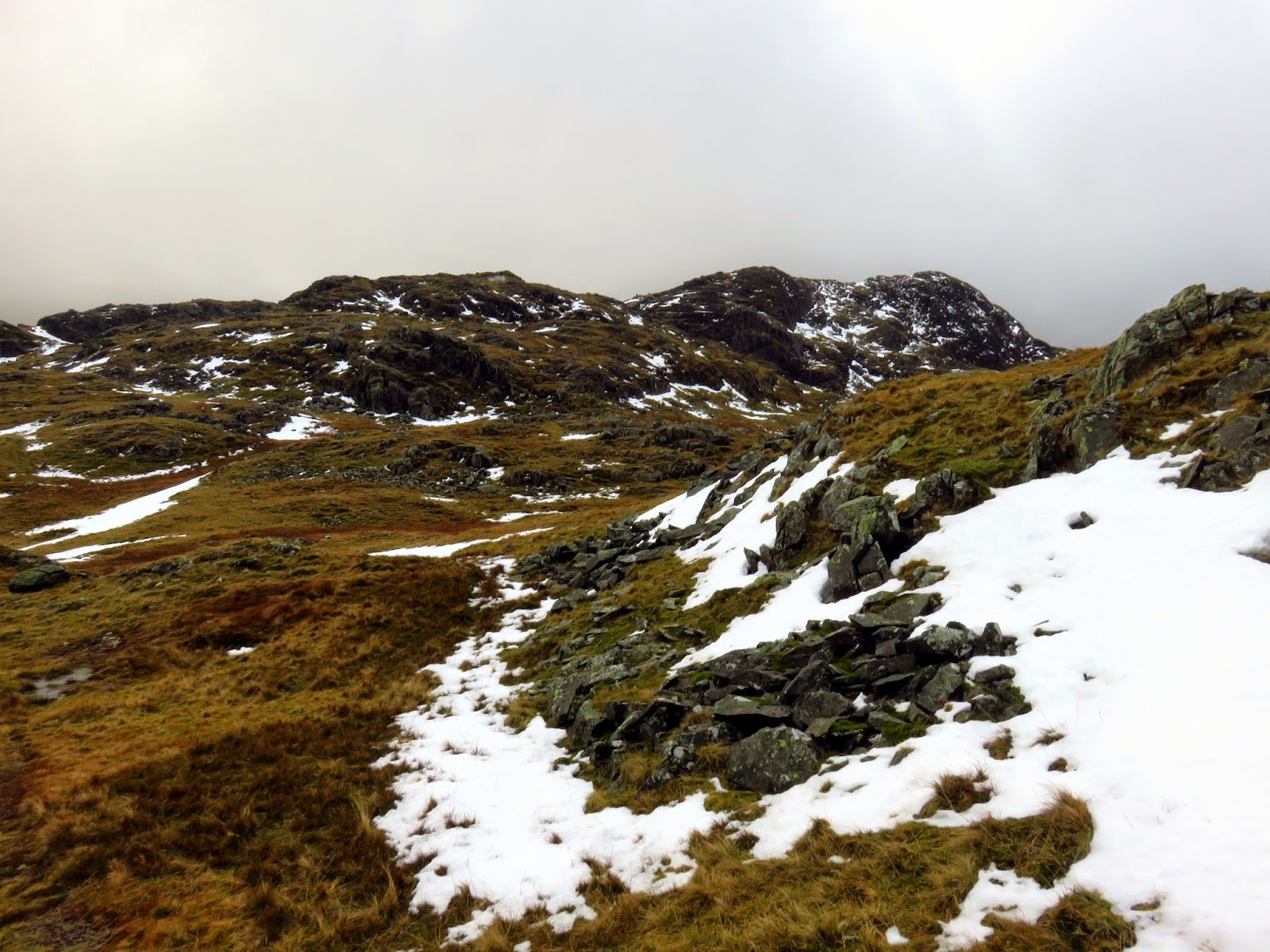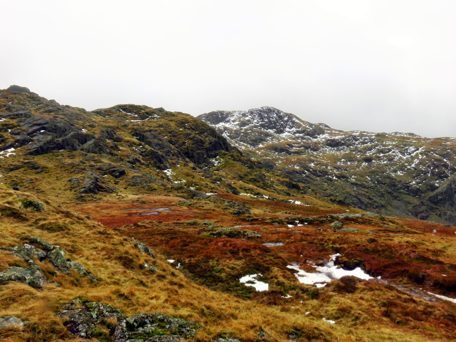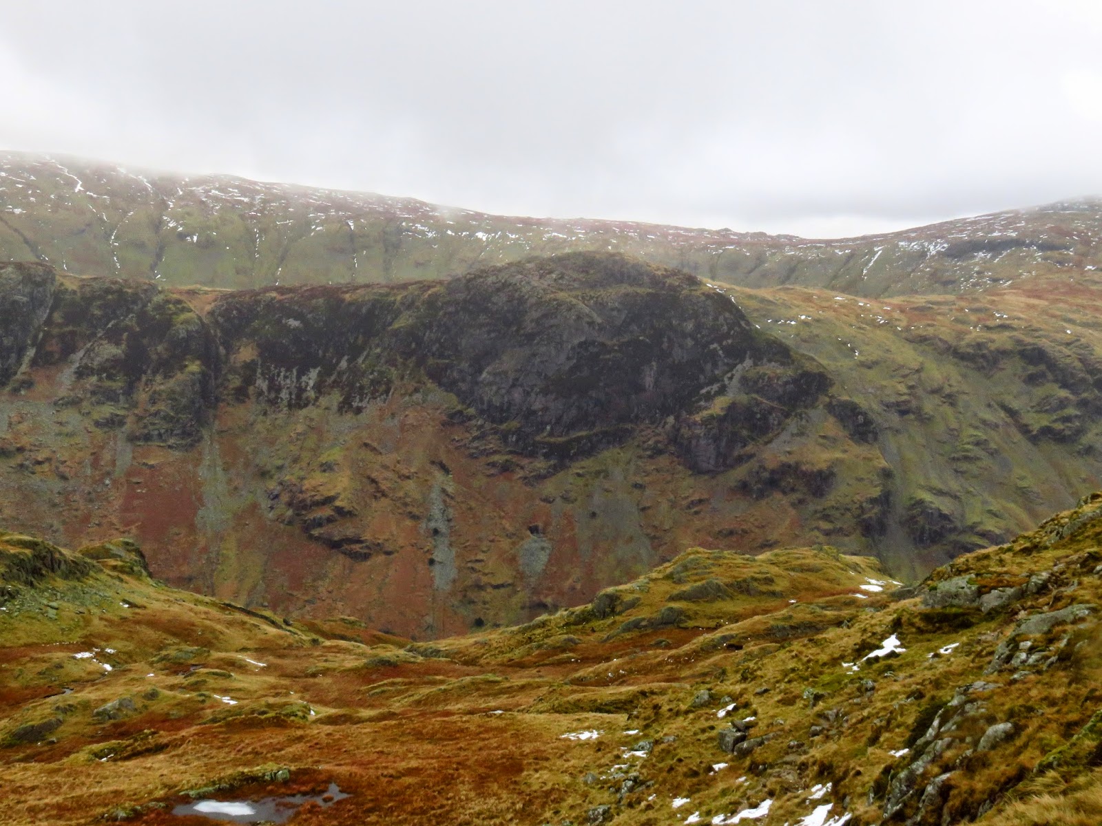 We crossed the top of Wool Gill which falls into Langstrath at an alarming rate before making our way south west, picking out a route that took us around Combe Door and to the rear of Combe Head. Glaramara (or what we could see of it) was in sight and still looked a long way away. Our route up to Combe Head had taken us into the realms of winter with a significant covering of snow impeding progress. Add a low cloud and a strengthening wind and it became a slightly more daunting prospect.