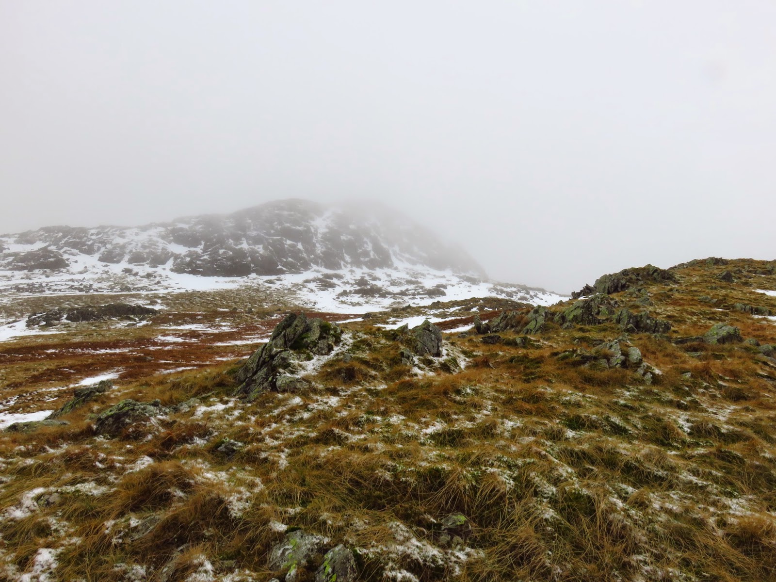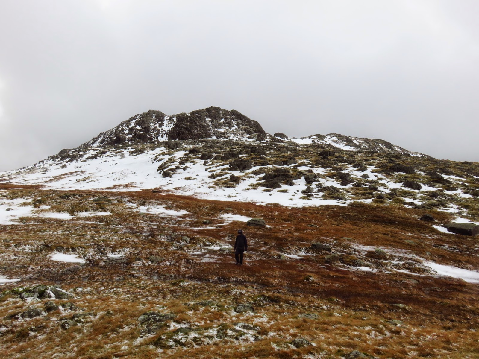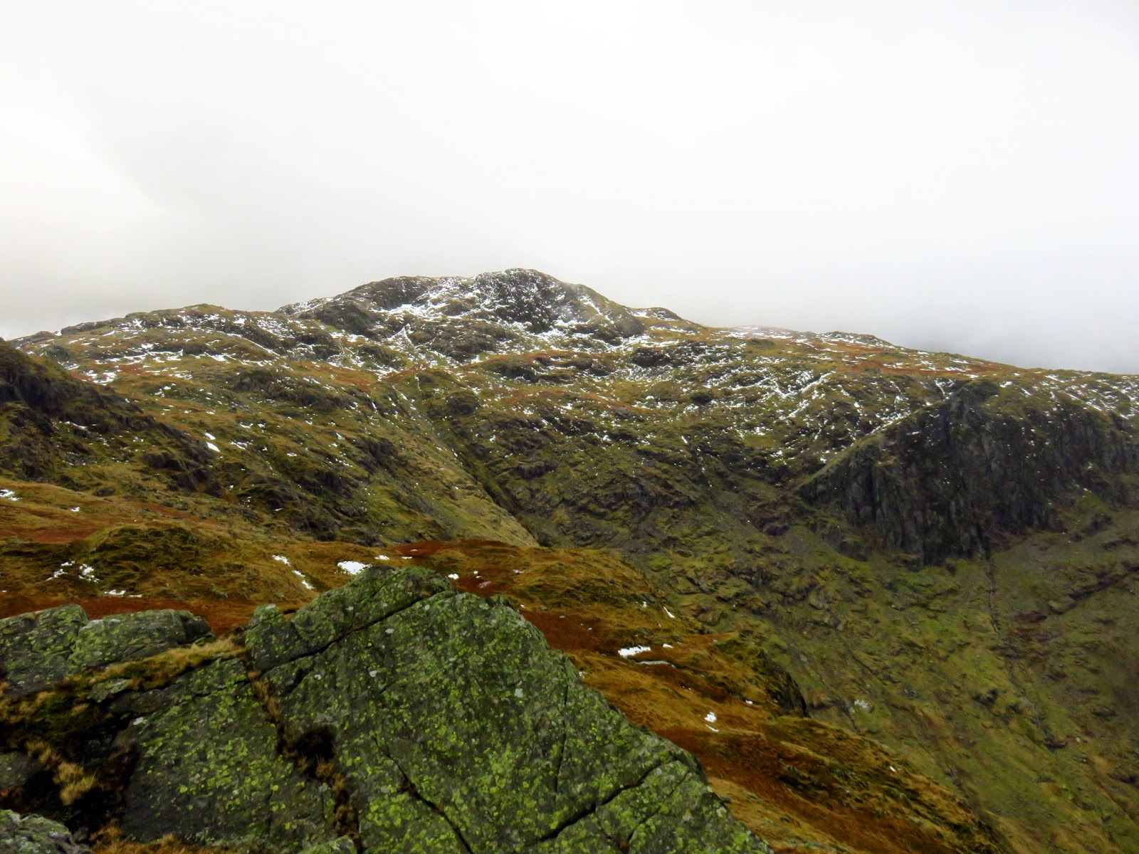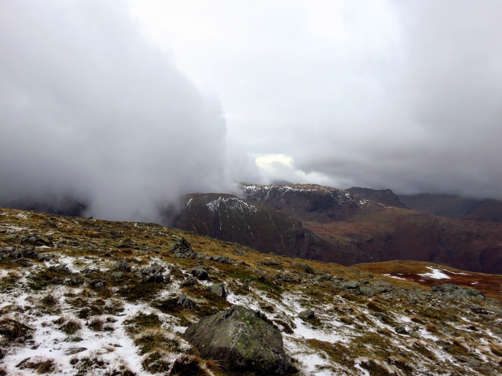 We crossed the top of Wool Gill which falls into Langstrath at an alarming rate before making our way south west, picking out a route that took us around Combe Door and to the rear of Combe Head. Glaramara (or what we could see of it) was in sight and still looked a long way away. Our route up to Combe Head had taken us into the realms of winter with a significant covering of snow impeding progress. Add a low cloud and a strengthening wind and it became a slightly more daunting prospect.