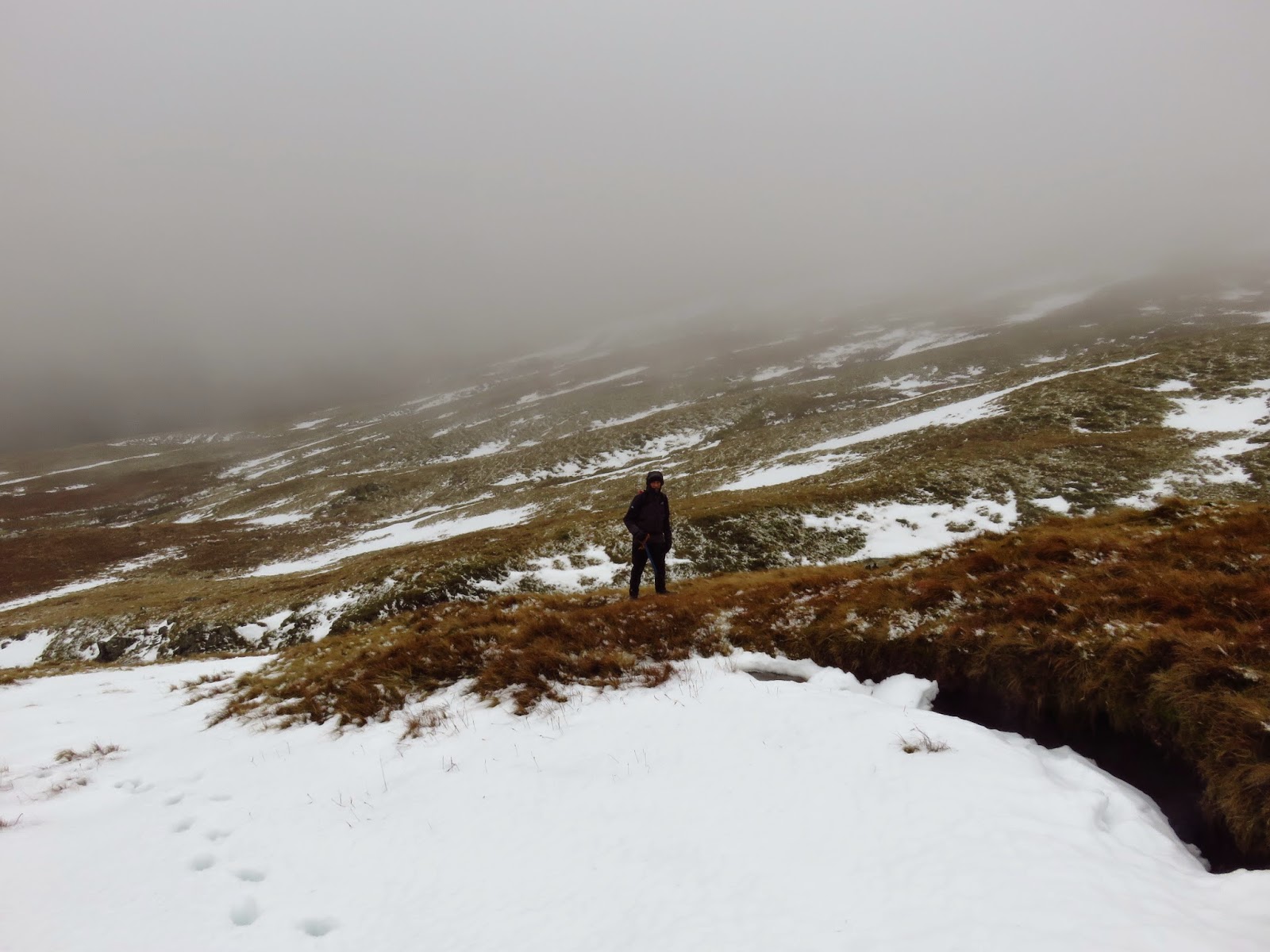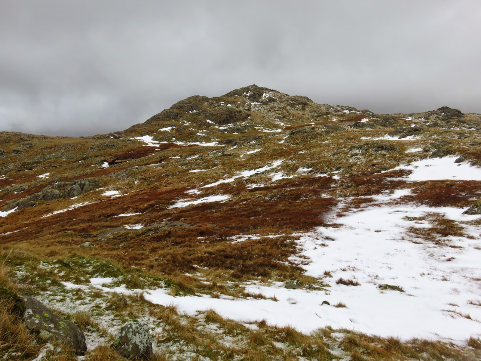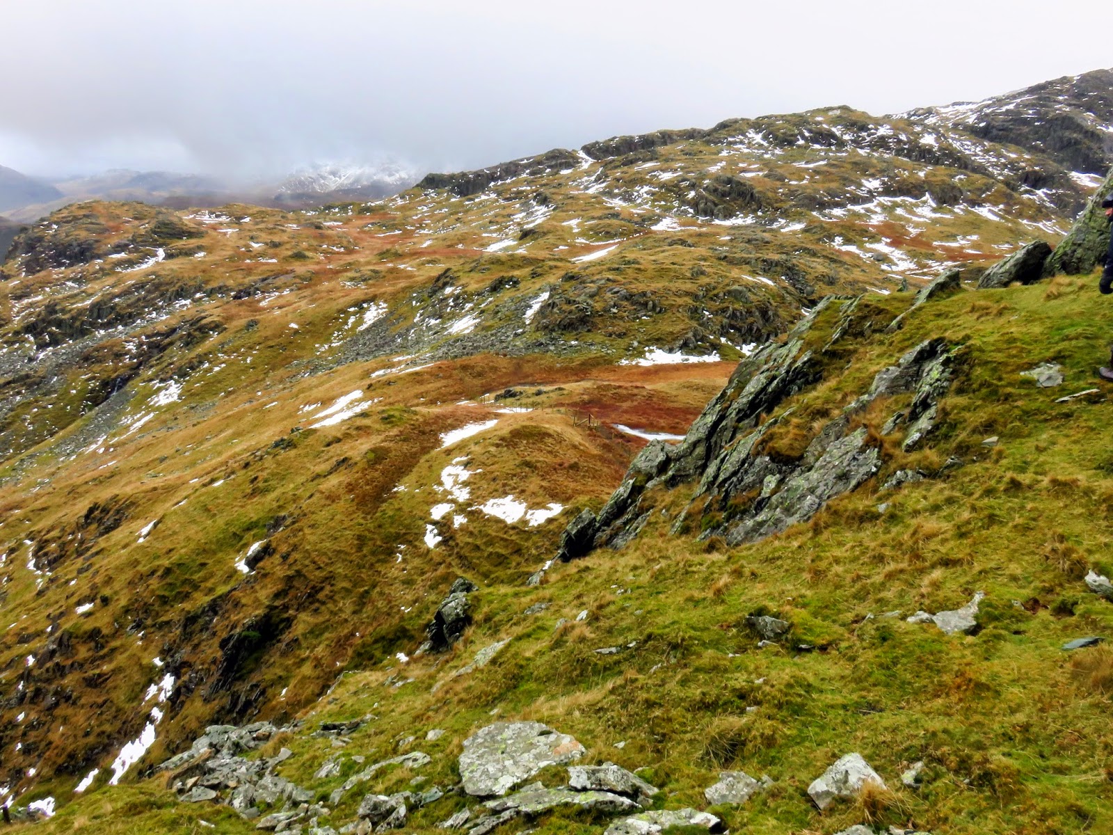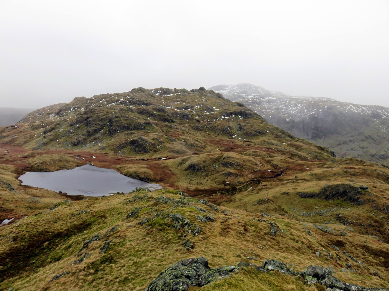 We crossed the top of Wool Gill which falls into Langstrath at an alarming rate before making our way south west, picking out a route that took us around Combe Door and to the rear of Combe Head. Glaramara (or what we could see of it) was in sight and still looked a long way away. Our route up to Combe Head had taken us into the realms of winter with a significant covering of snow impeding progress. Add a low cloud and a strengthening wind and it became a slightly more daunting prospect.