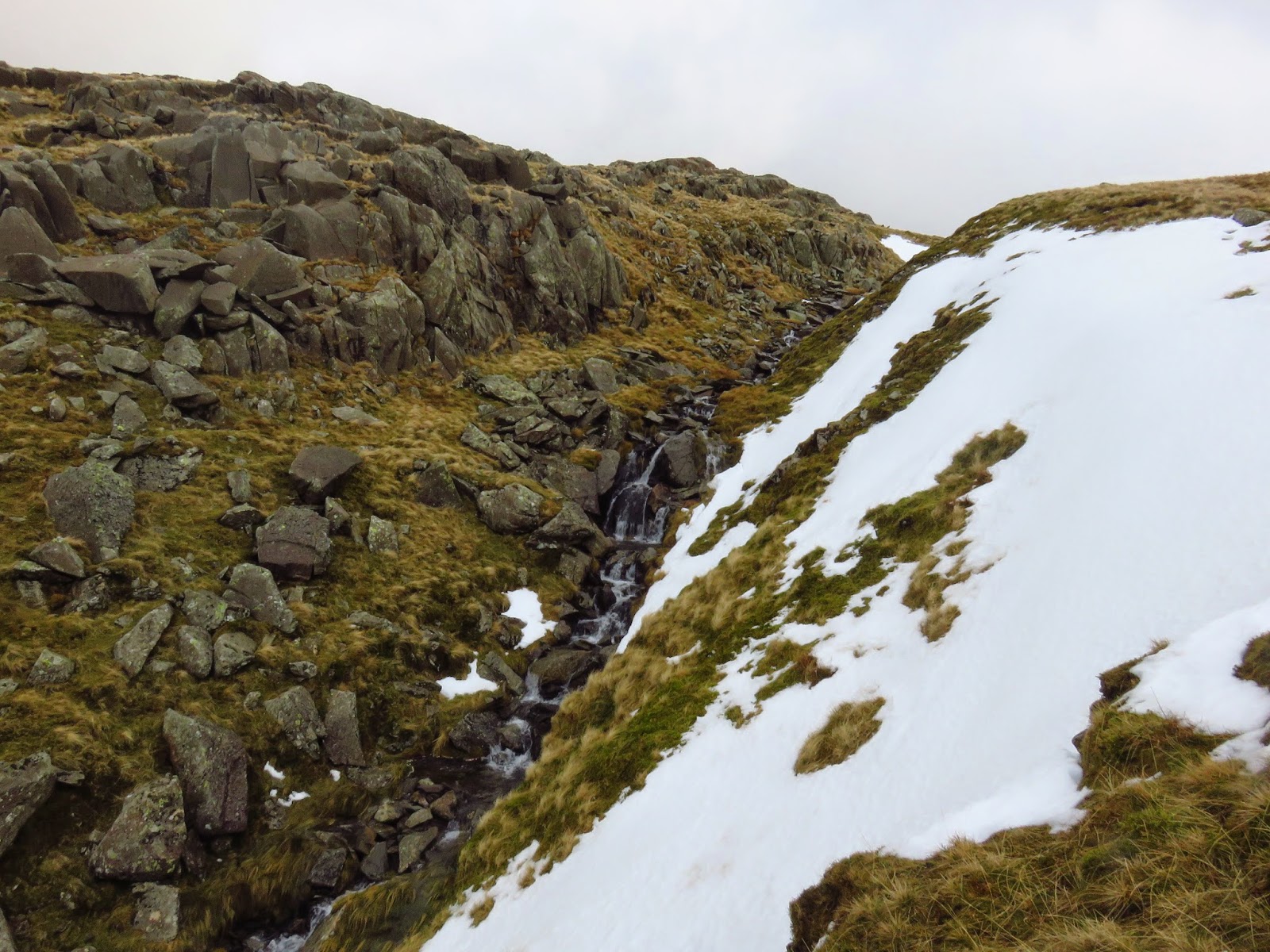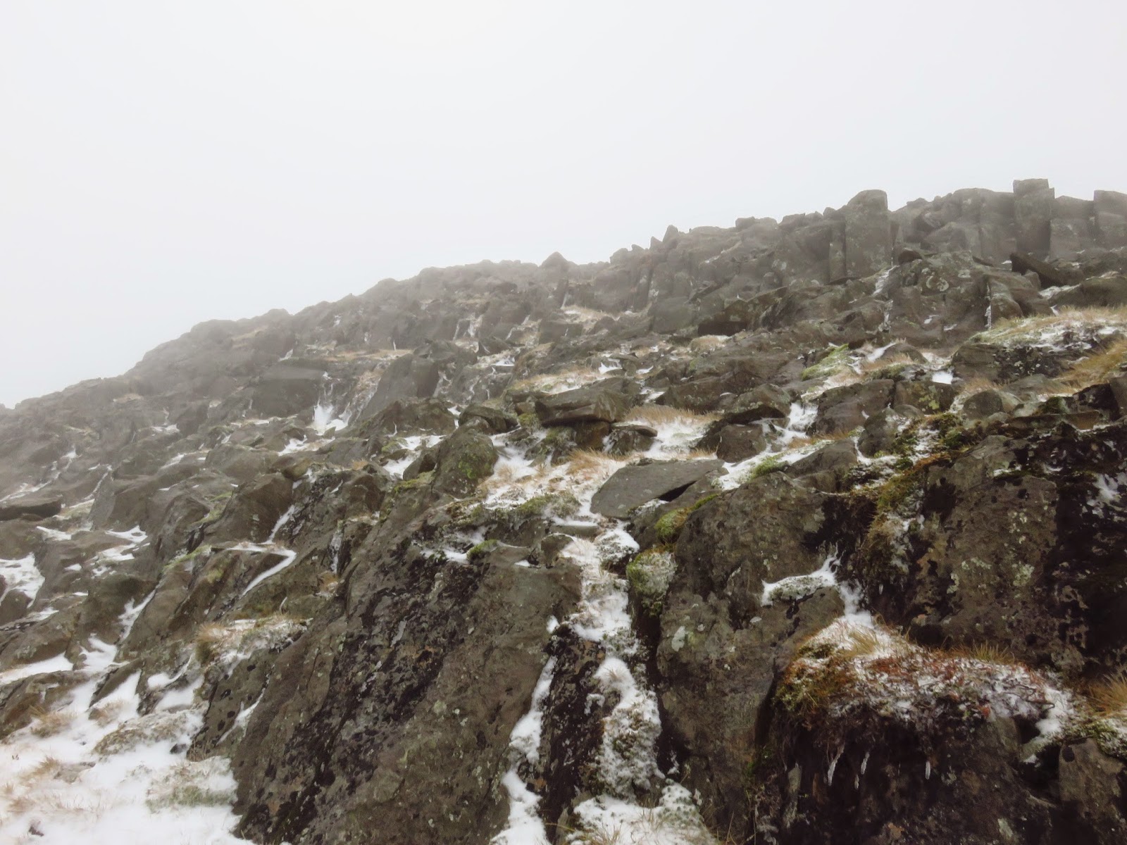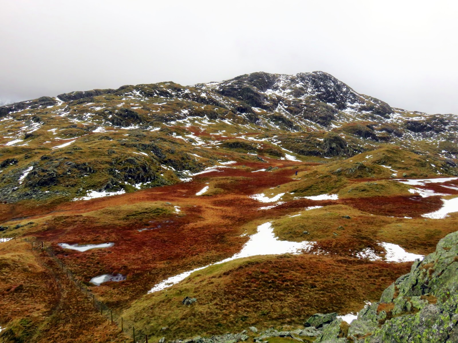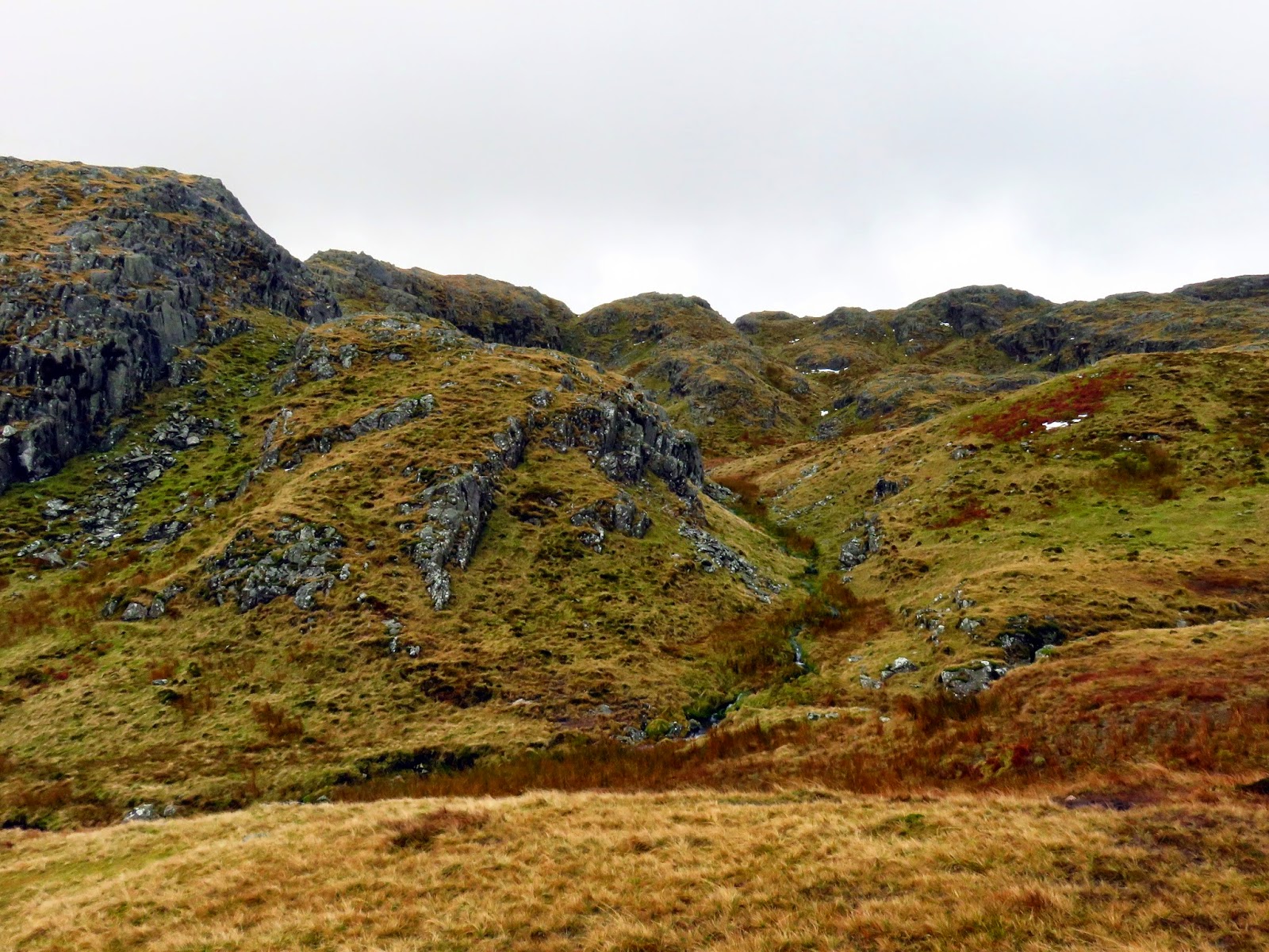 We crossed the top of Wool Gill which falls into Langstrath at an alarming rate before making our way south west, picking out a route that took us around Combe Door and to the rear of Combe Head. Glaramara (or what we could see of it) was in sight and still looked a long way away. Our route up to Combe Head had taken us into the realms of winter with a significant covering of snow impeding progress. Add a low cloud and a strengthening wind and it became a slightly more daunting prospect.