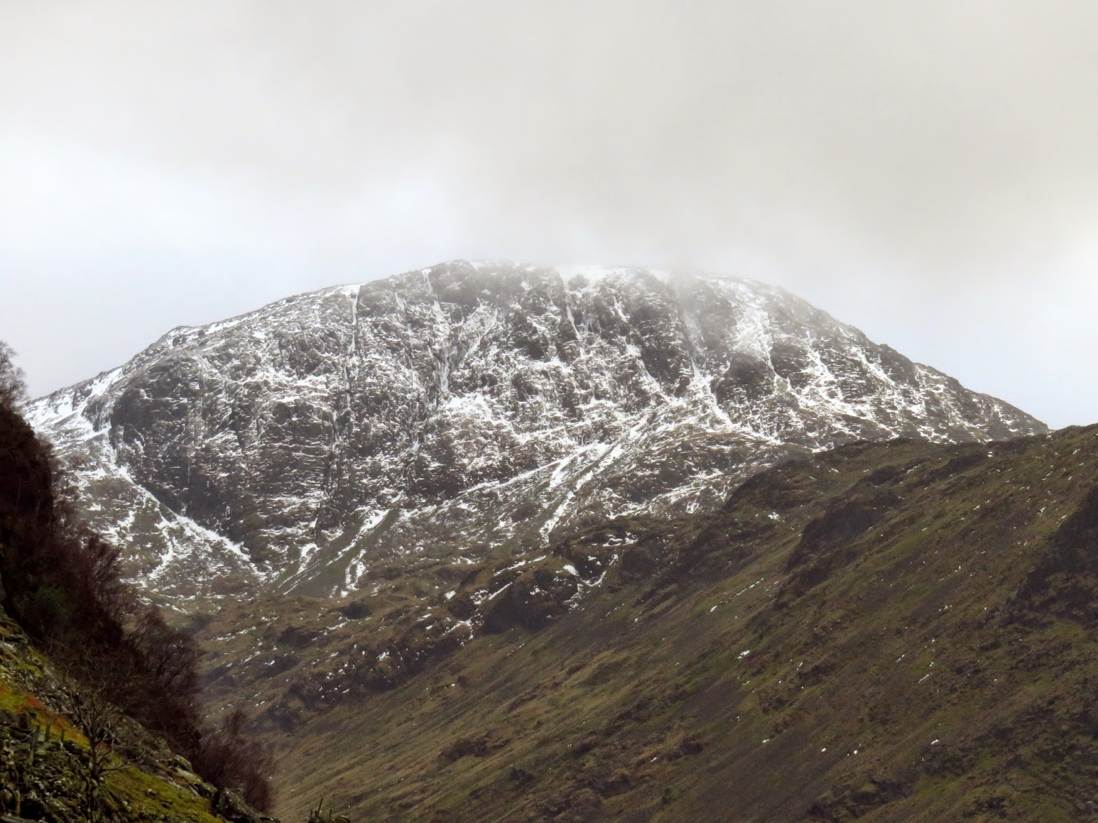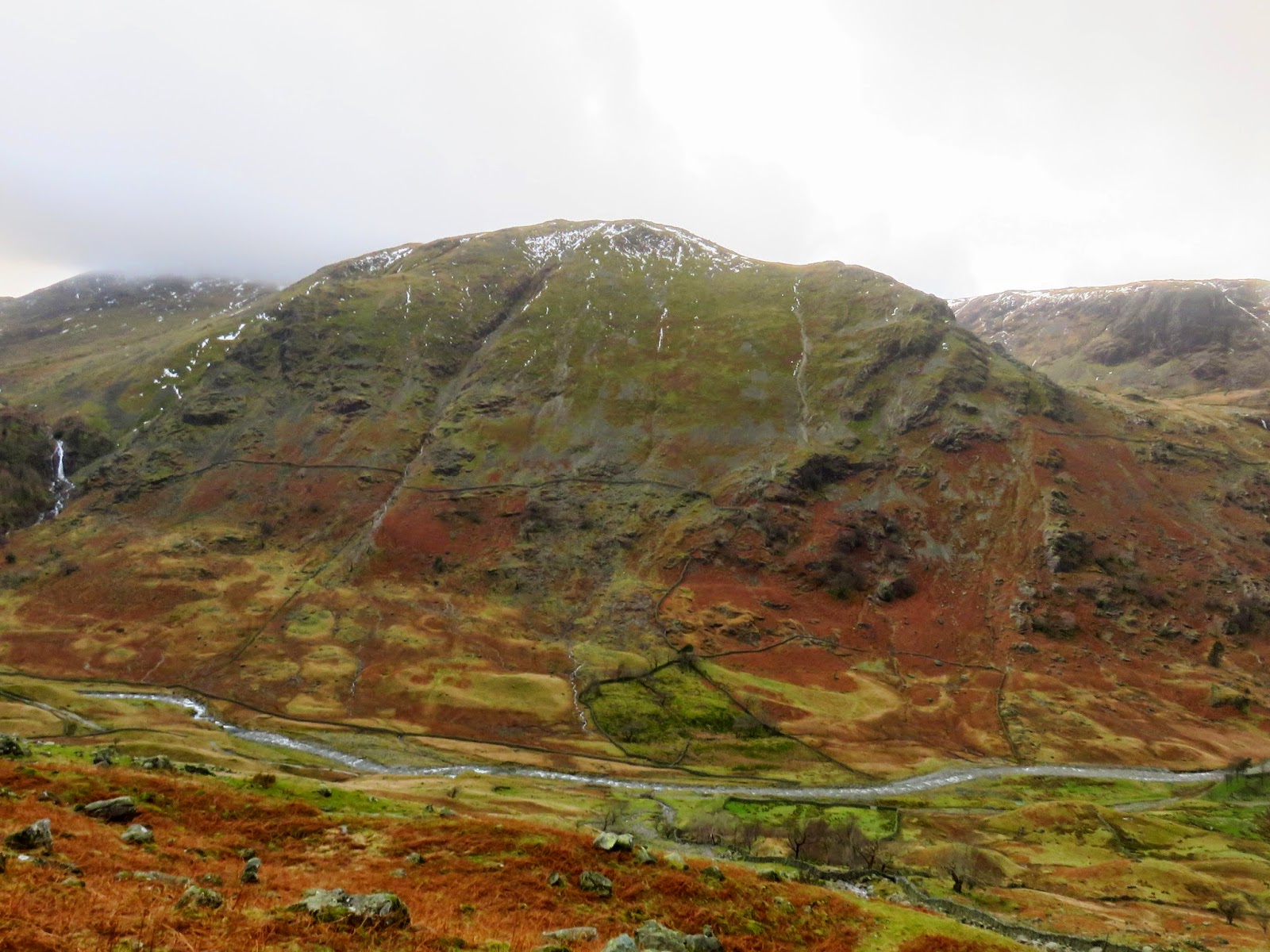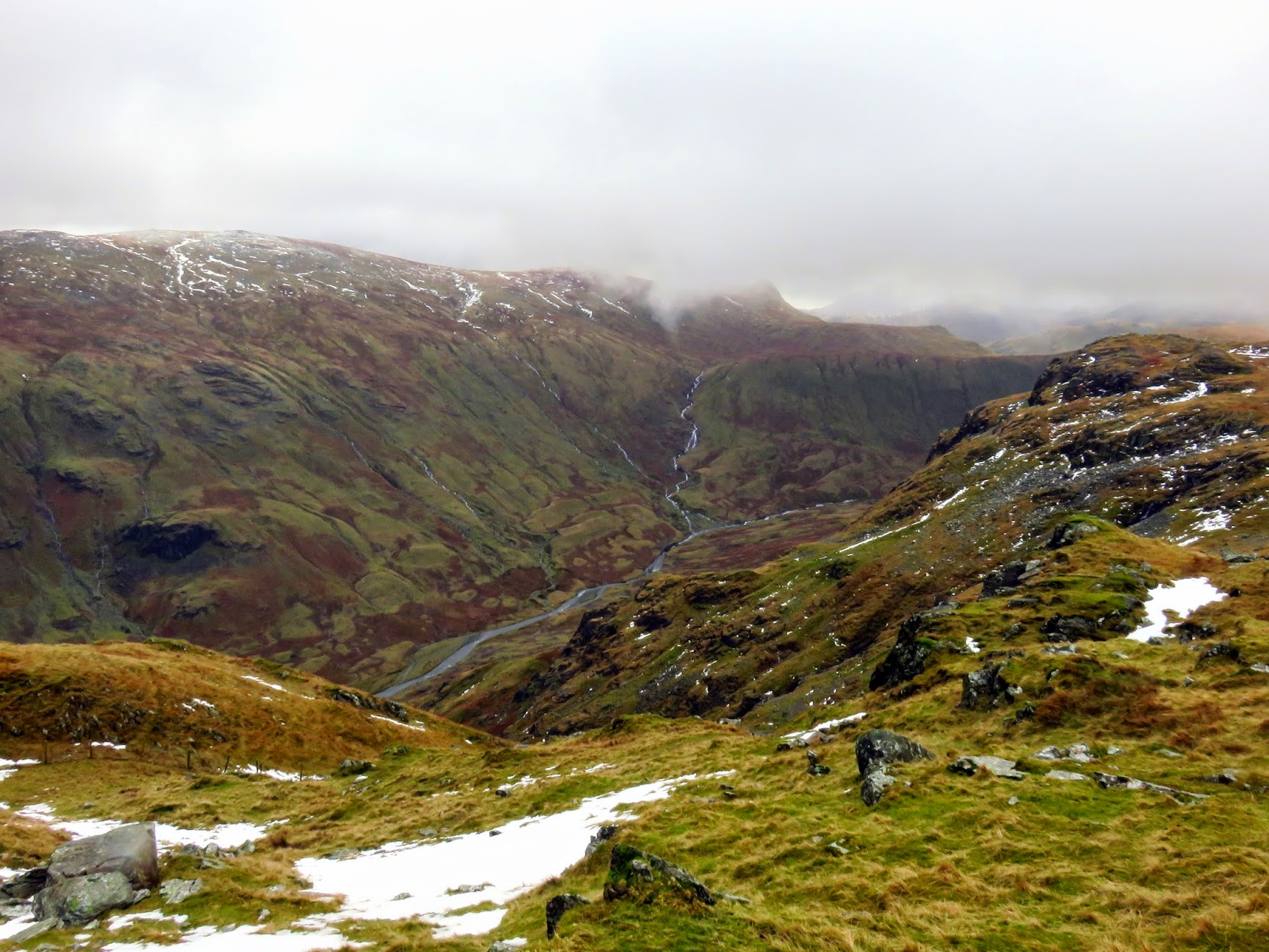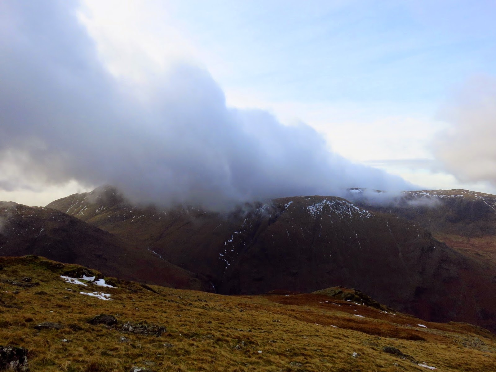 The quickest and most direct route back to the car in Seathwaite was down the path adjacent to Hind Gill which falls with a startling urgency. As soon as we’d made it a few contours lower, the wind began to ease and the clouds broke up slightly. It seemed that the direction of the wind combined with the temperature was conspiring to form a narrow band of cloud from the top of Pillar, completely smothering Glaramara. It was quite an odd sight.
