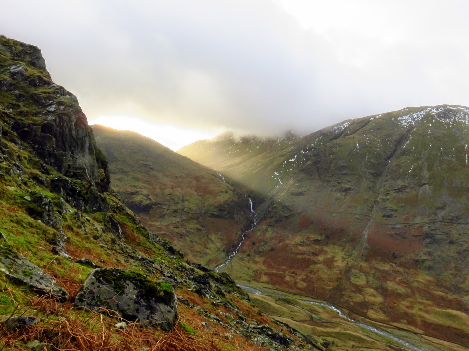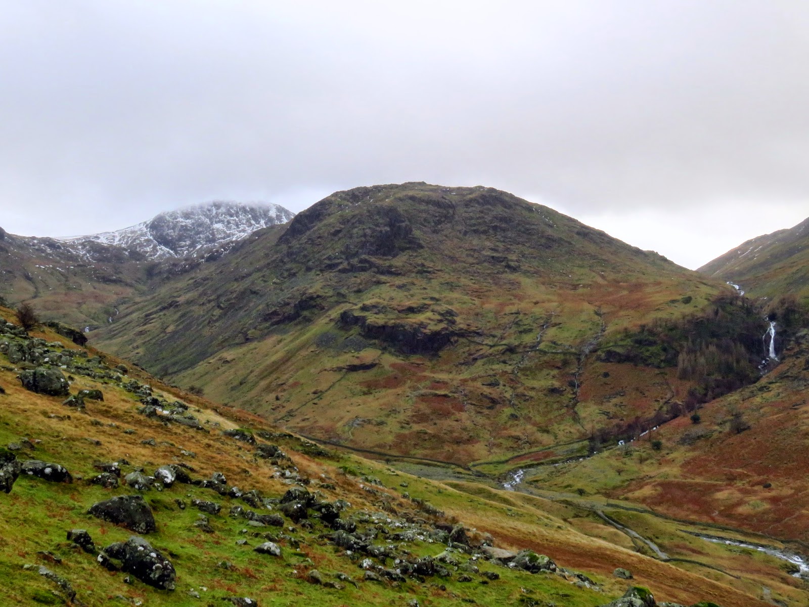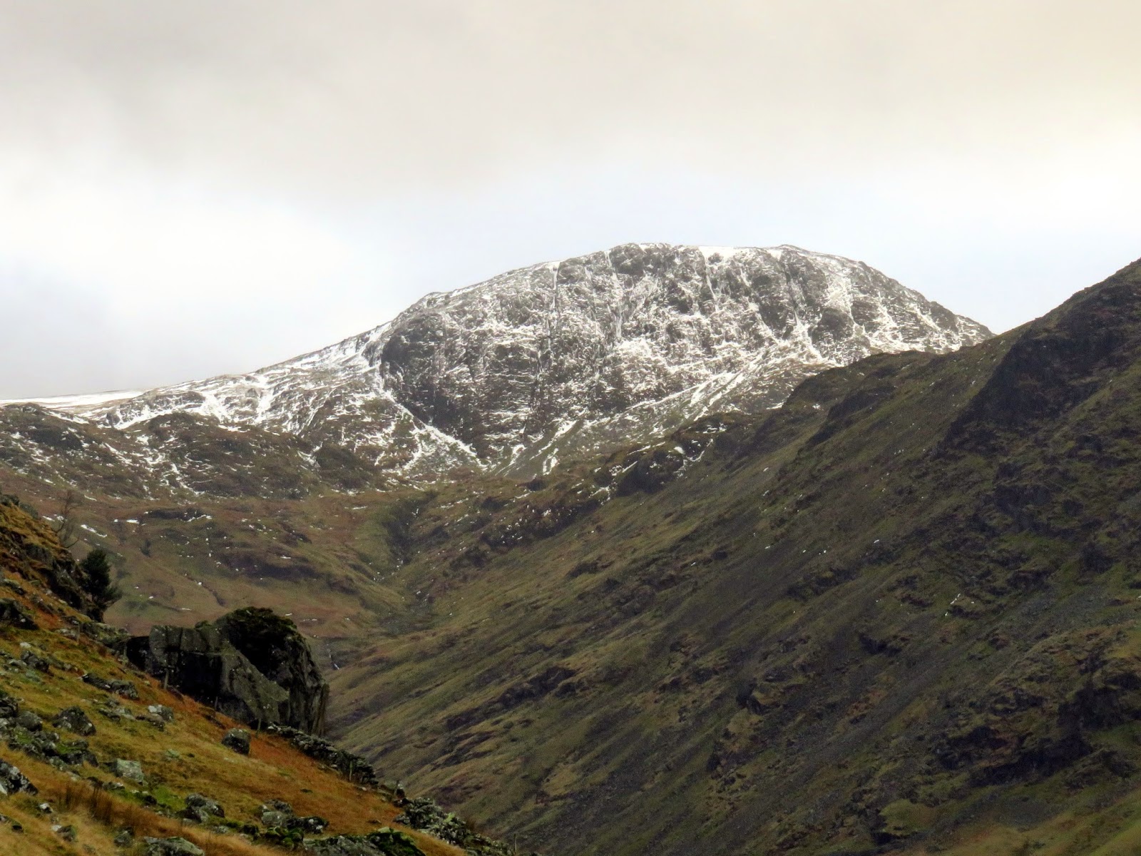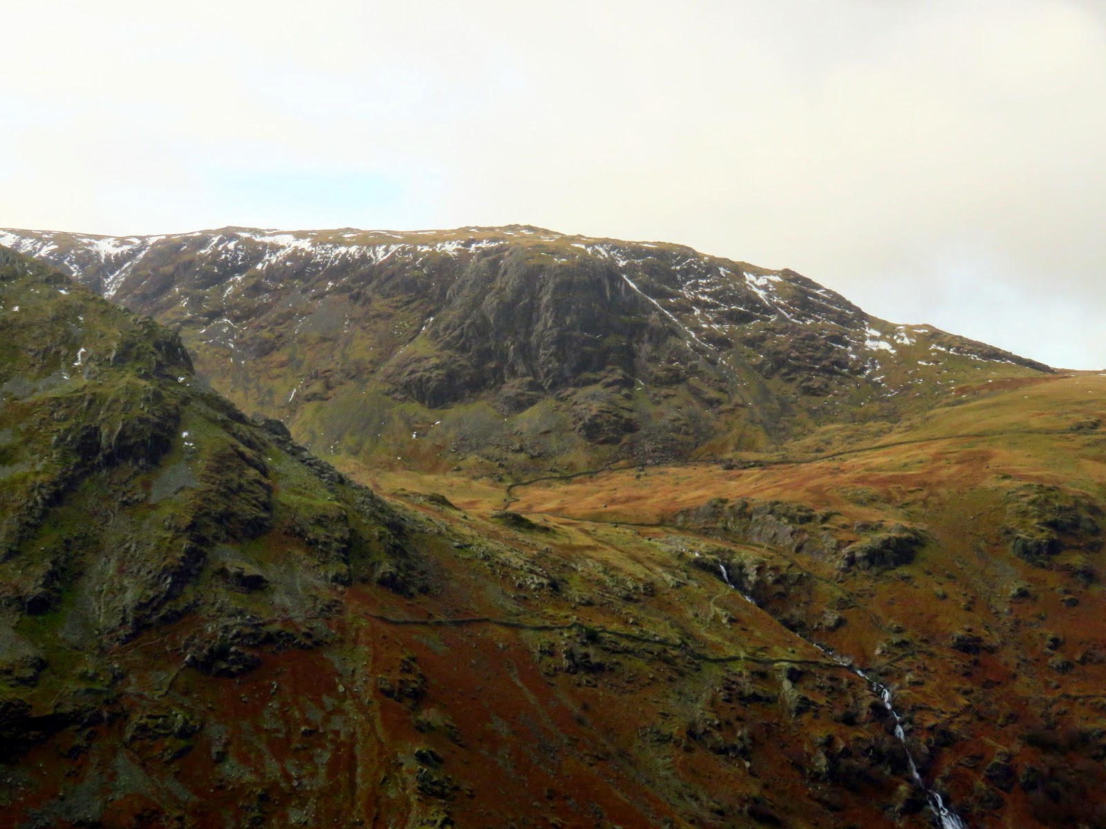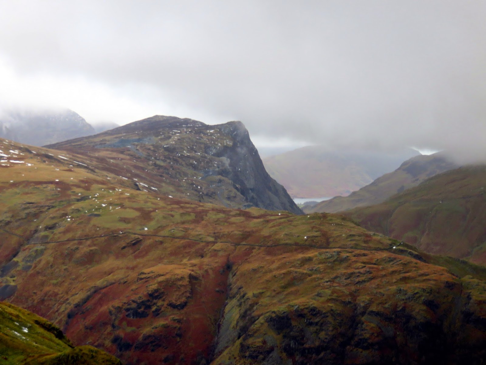 The quickest and most direct route back to the car in Seathwaite was down the path adjacent to Hind Gill which falls with a startling urgency. As soon as we’d made it a few contours lower, the wind began to ease and the clouds broke up slightly. It seemed that the direction of the wind combined with the temperature was conspiring to form a narrow band of cloud from the top of Pillar, completely smothering Glaramara. It was quite an odd sight.