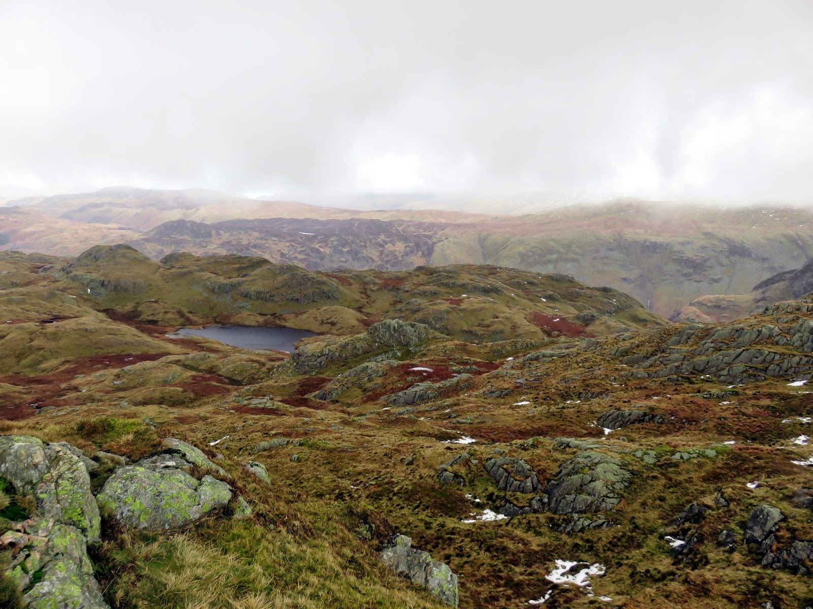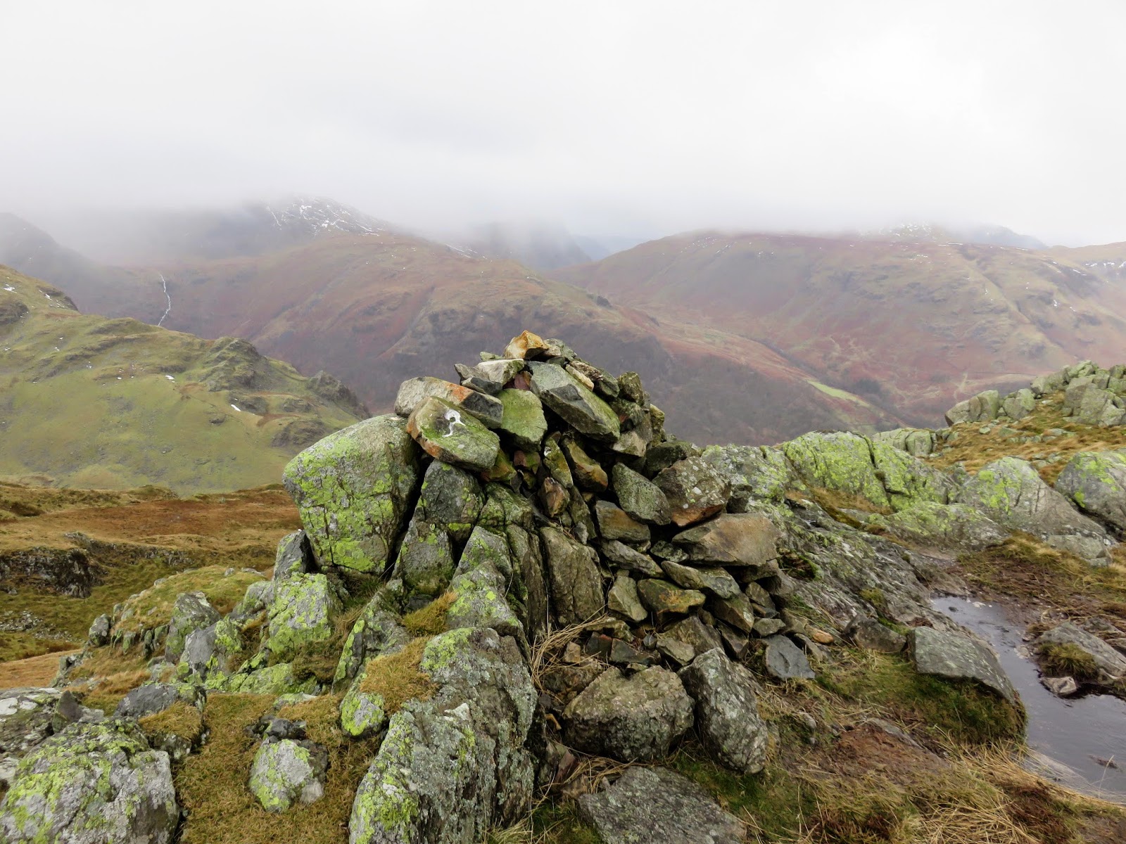 We made our way to Rosthwaite Cam, rounding Tarn at Leaves in the process. Tarn at Leaves is a delight, nestled amongst the confusion of rocks that litter Rosthwaite Fell. Despite the unusual name, its meaning or origin seem to be lost. It’s a fair climb to Rosthwaite Cam and the going was slow as a result of some awkward patches of snow that were beginning to become more and more frequent though we made it to the cairn which can be found astride a tall rock.