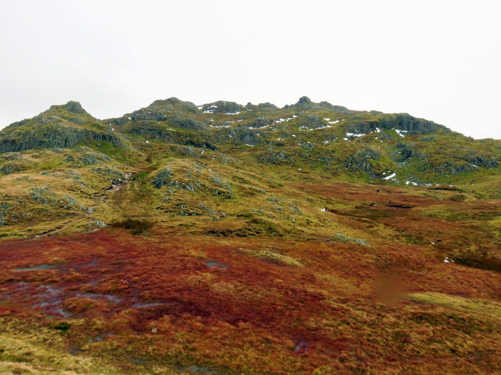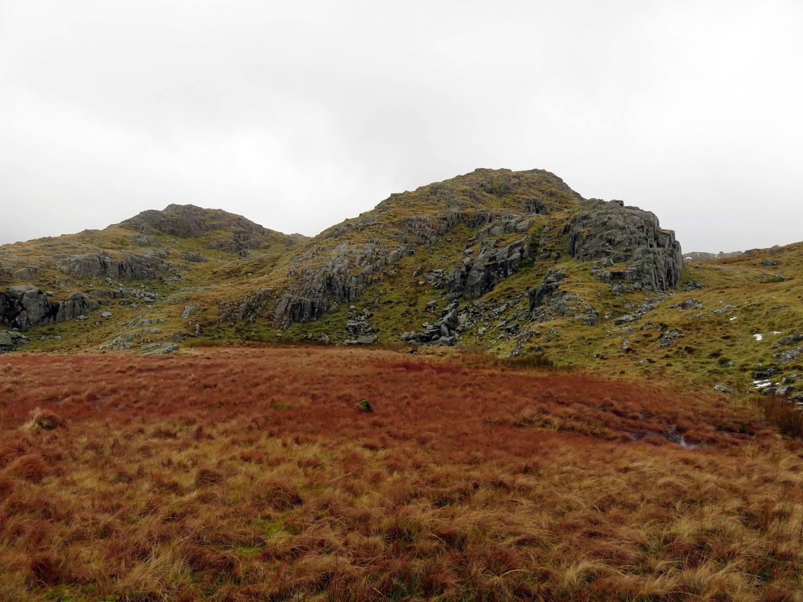 The plateau above Stonethwaite is an interesting and equally confusing place with a number of rocky outcrops drawing the attention. There is a difficulty in determining exactly which one is Bessyboot though this becomes clearer as you continue on. I had read that Bessyboot was easier to tackle from the south, or the rear as we approached it, and it certainly looked quite formidable from where we were standing. We followed the base of the slopes around towards Tarn at Leaves where the rocky defences ease slightly and a quick climb reaches the summit.