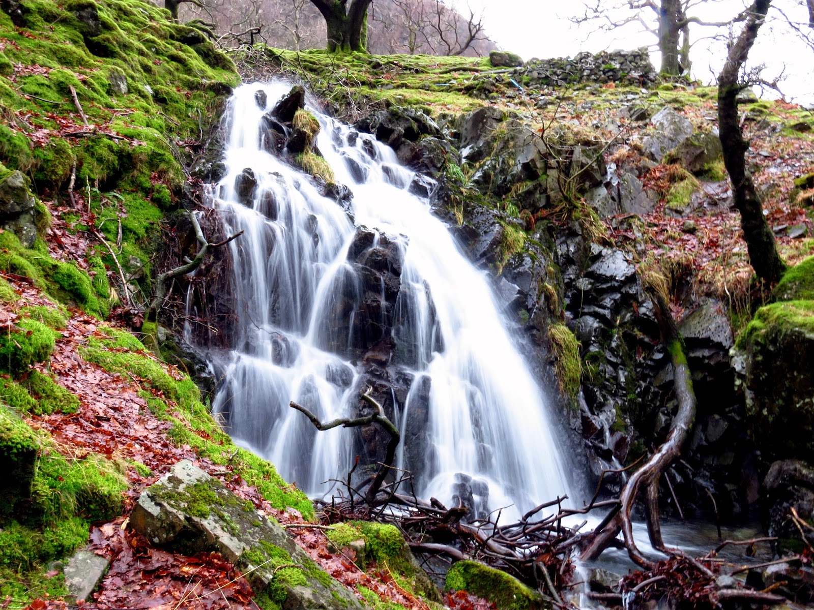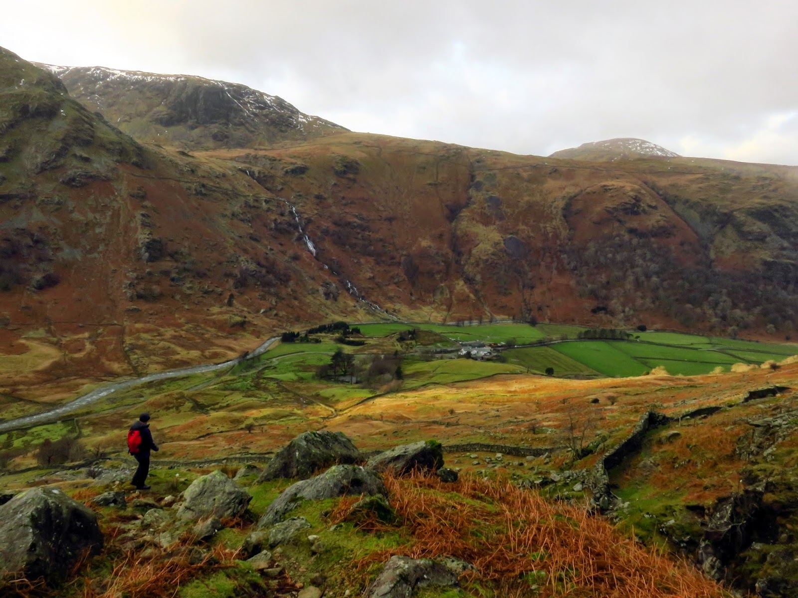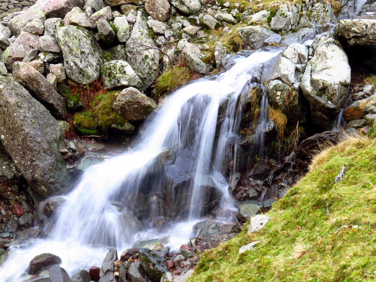 The path steepens as Hind Gill enters a deep ravine and we had to be careful not to take a slip on the wet rocks, the result of which would have been a nasty fall. Down the route continues until it reaches the intake wall of the valley and the steepness begins to abate. Ultimately the path joins the popular Grains route to and from Scafell Pike. Here, it’s a flat walk back along the valley to the farm where our second car was waiting.