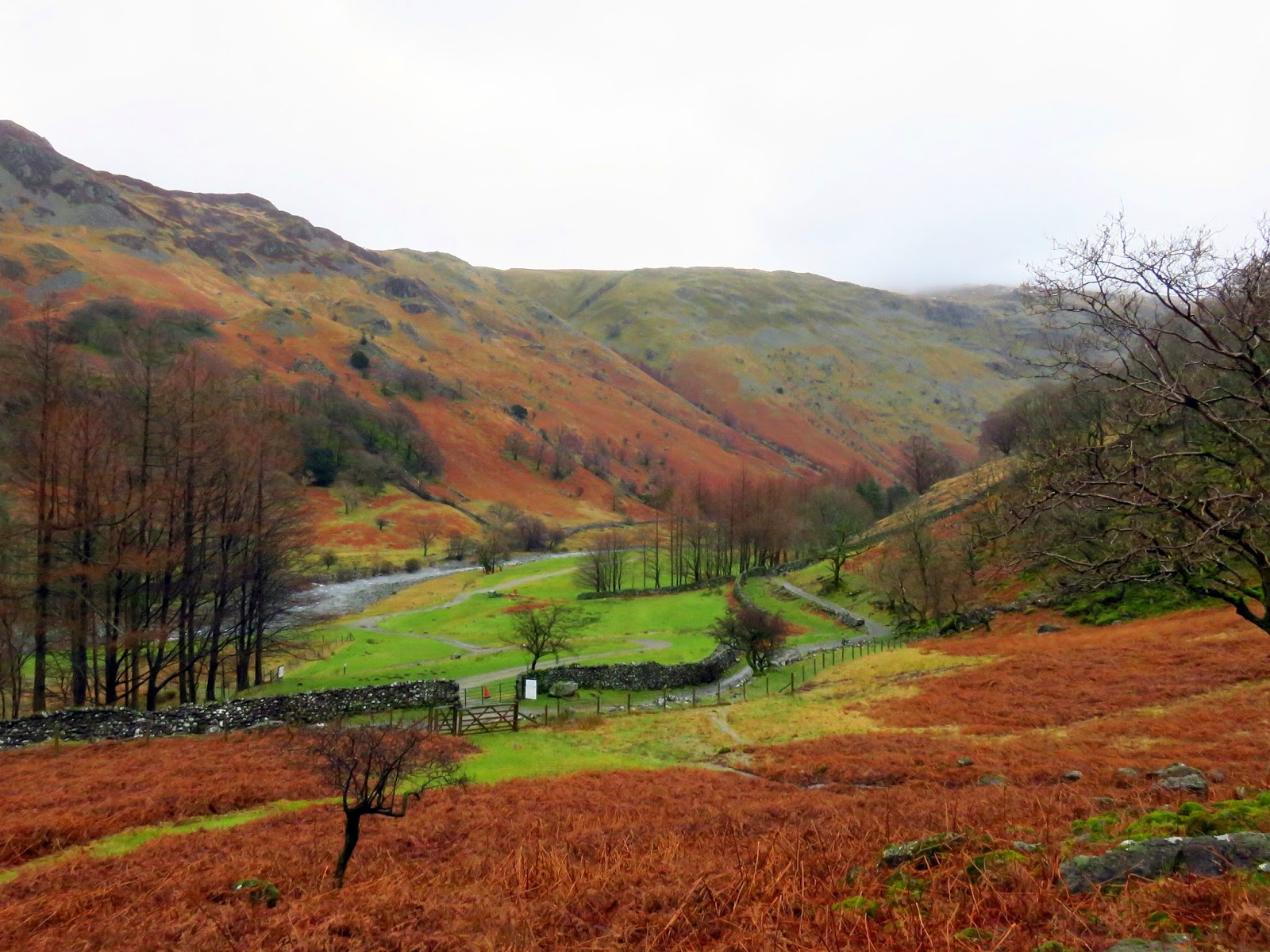 As is quite common with a lot of my walks, we had access to two cars so we left on near to Seathwaite Farm to save us a few miles of road walking at the end of the day. The other we drove around to Stonethwaite, leaving it in a small collection of spaces next to the telephone box, a perk of being out on a weekday during the winter. The forecast had promised intermittent showers but a torrent of rain accompanied our short walk towards Stonethwaite Campsite.