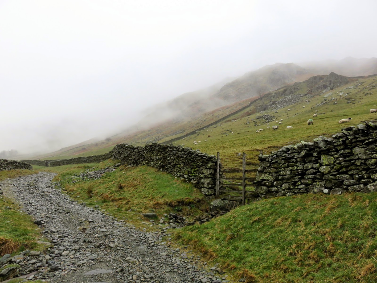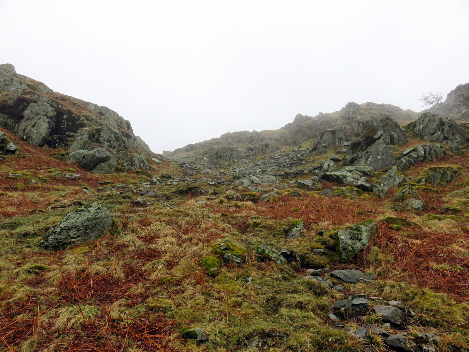 We began from Sadgill, a farm at the end of the long road through Long Sleddale. There’s room enough for a few cars but little in the way of alternatives if it’s full. No such problem today. The clouds were low and it was raining on and off as we started, making our way through a gate onto the open fellside, aiming for the Easy Gully that climbs up to Great Howe. I had started the walk with the waterproof off, confident that the light rain wouldn’t cause too many problems, especially during the initial climb. This didn’t last long however, the rain becoming heavy enough to make the decision for me.