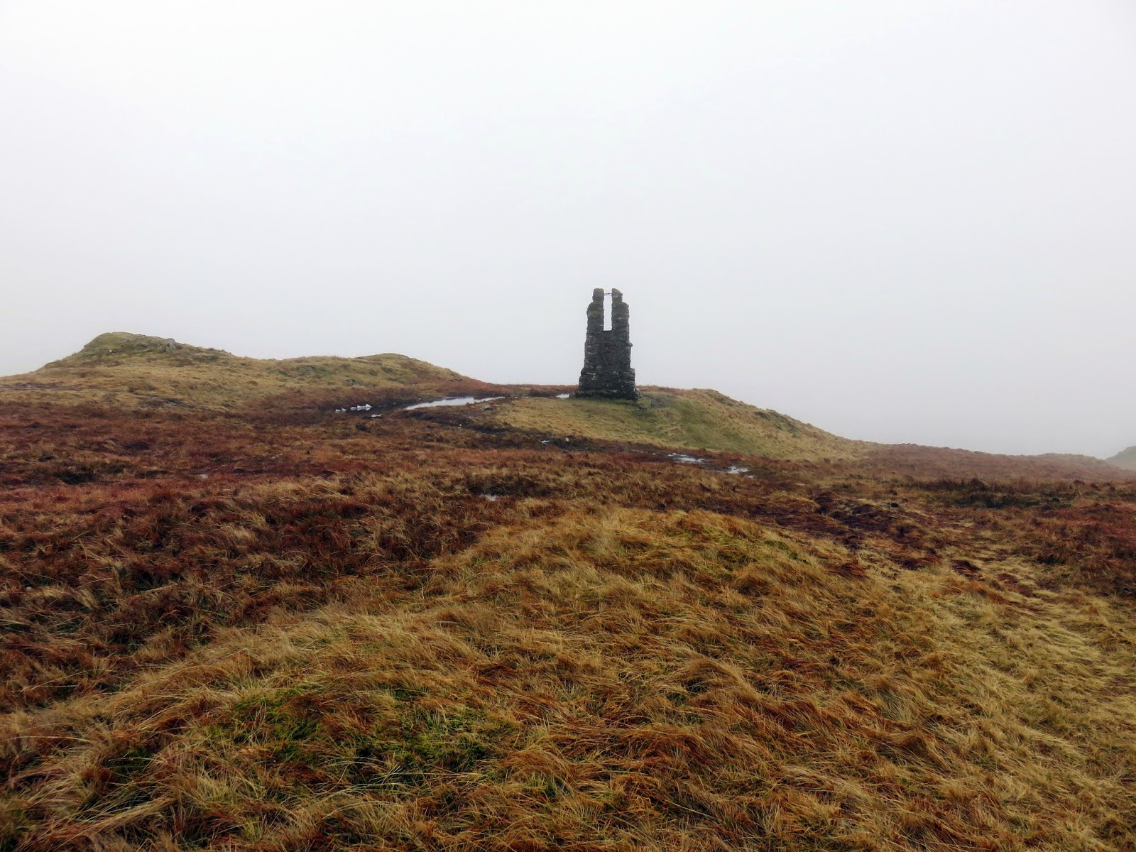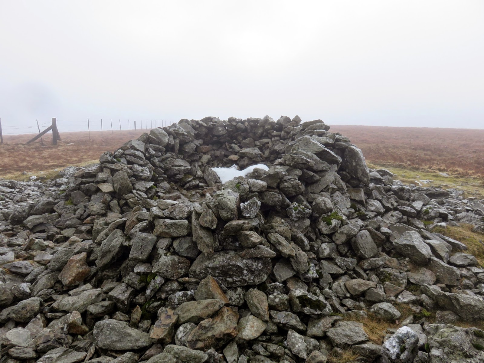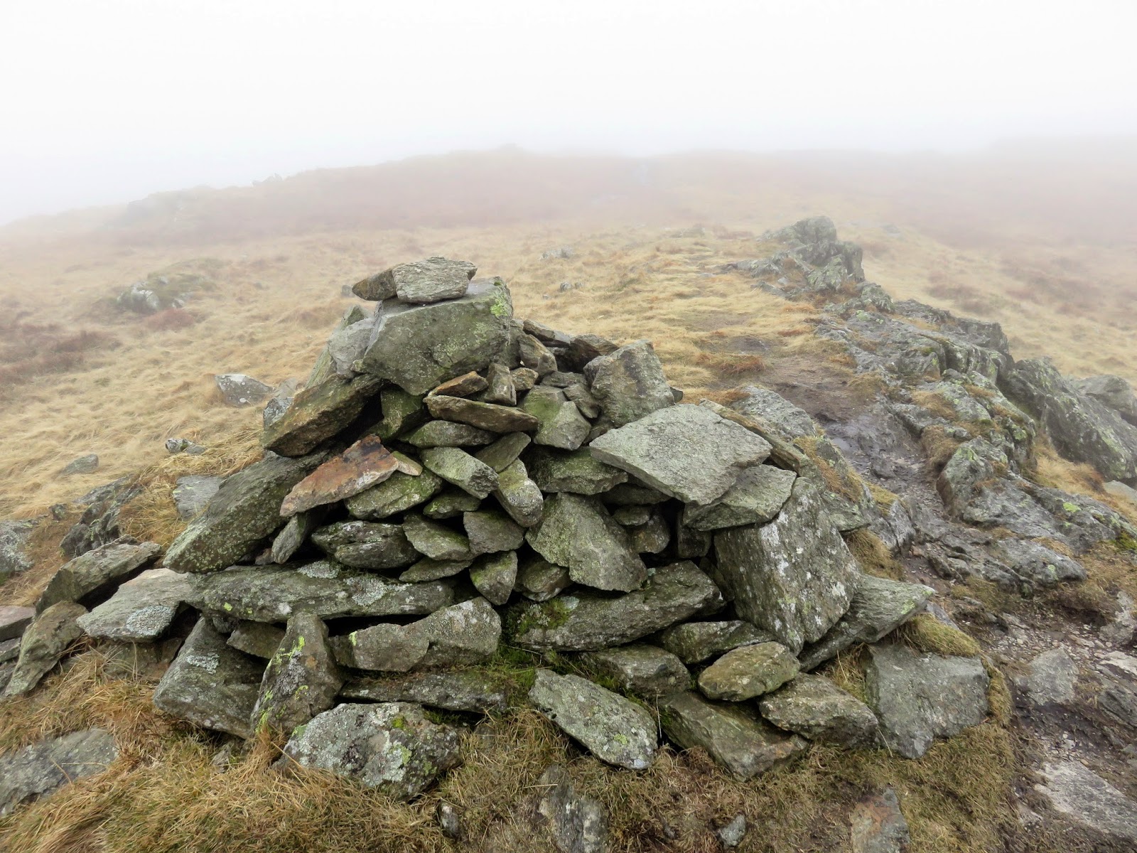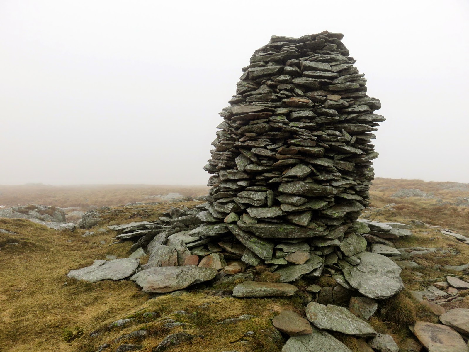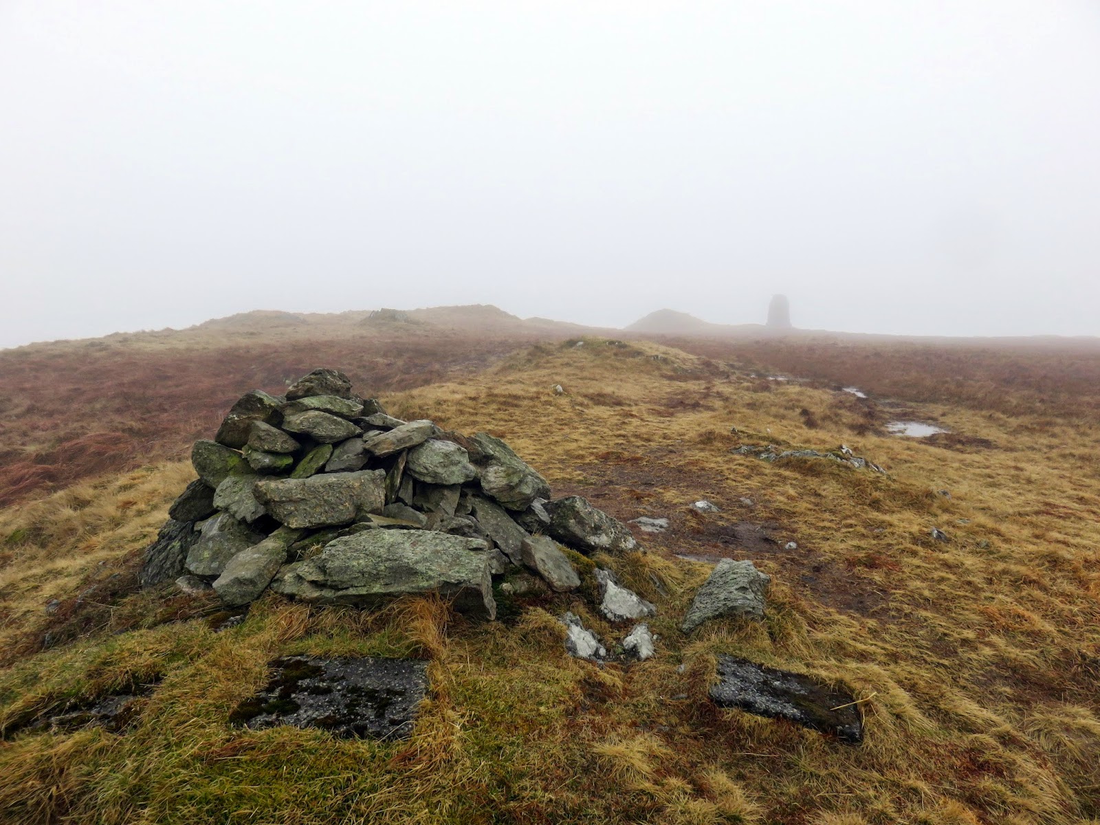 There is little to see from the summit of Branstree, even on a fine day, so we weren’t really missing much. This is due to the broadness of the summit area, limiting the views in all directions. Today was not a fine day so we passed the summit by fairly quickly, following the path north east to Artle Crag where a fine pair of cairns mark the way.