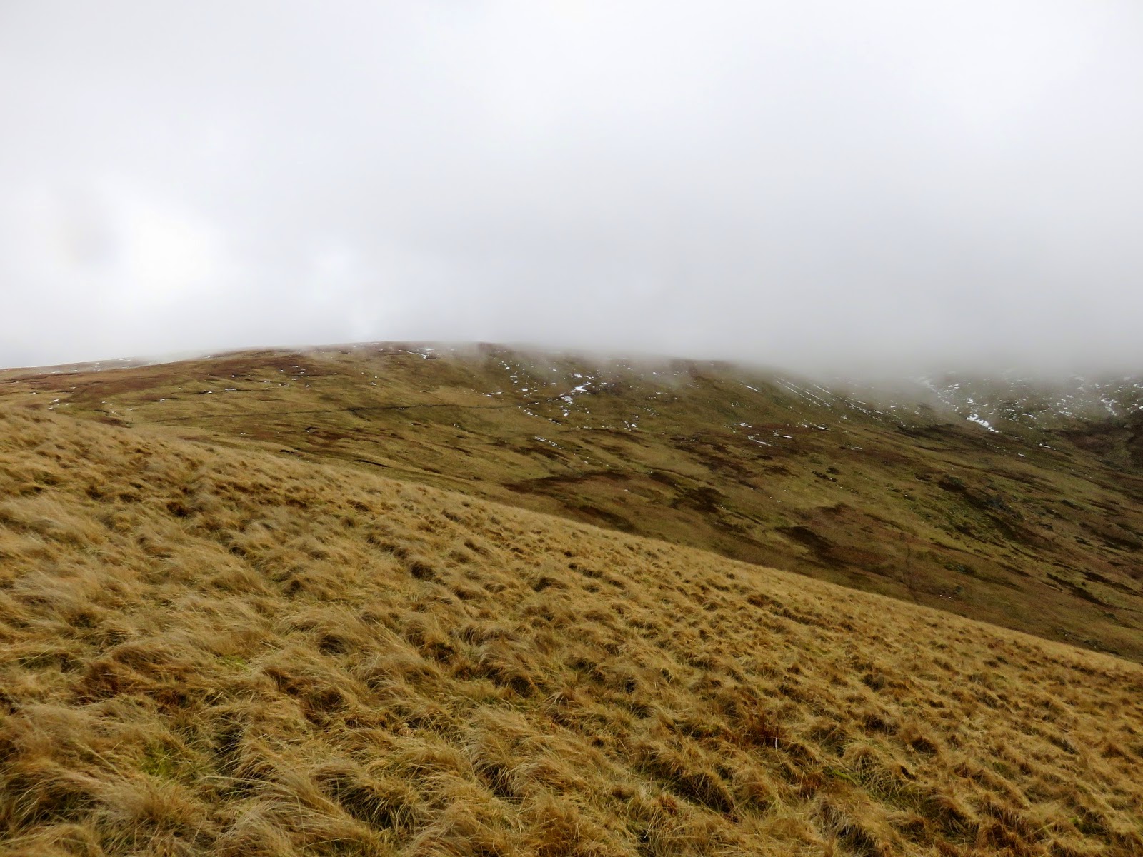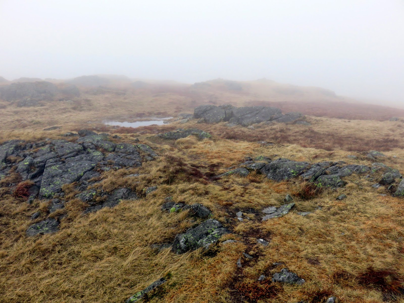The weather began to ease slightly as we began the descent to the col that separates Tarn Crag from Branstree, enough to warrant stopping for lunch before the climb up Branstree. This pause gave the weather ample time to deteriorate again and it was raining steadily by the time we began the long, grassy climb to the summit of Branstree.