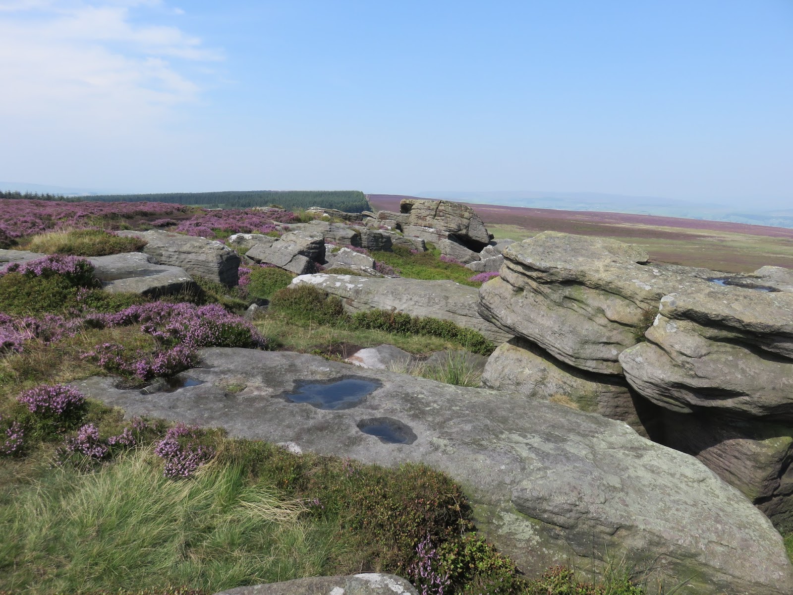 We doubled back from the trig pillar heading along the gently undulating path alongside the windy woods of High Moor, being careful to avoid the worst of the boggy bits as we went. This ended up being a dismal failure but is one of the trade offs of wearing trainers out for a walk. We reached the Buck Stones and used their shelter to stop for lunch as the wind was pretty chilly, despite it being mid-August. The Buck Stones (both East and West varieties) are millstone grit outcrops, reminiscent of those found on Kinder Scout.