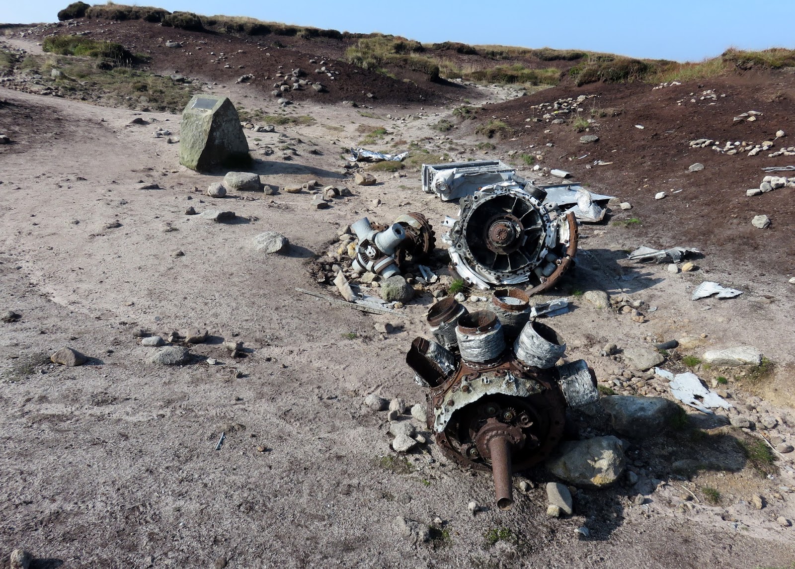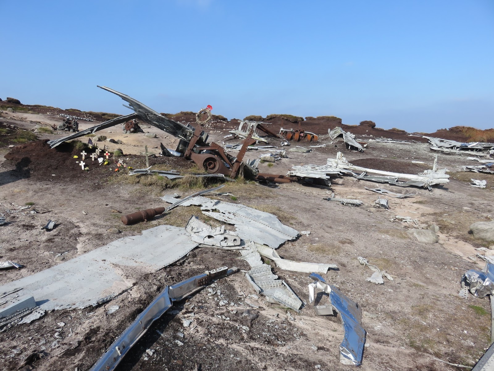 The circumstances of the aircraft’s demise follow a depressingly similar pattern that can be shared among numerous wrecks in the Peak District; a combination of poor weather and navigational error proving fatal to the 13 crew on board. A vast amount of wreckage remains strewn across the moor including large discernible pieces such as the nose wheel, wing spars and all four engines. It’s a quietly moving place with a small memorial dedicated to the crew.