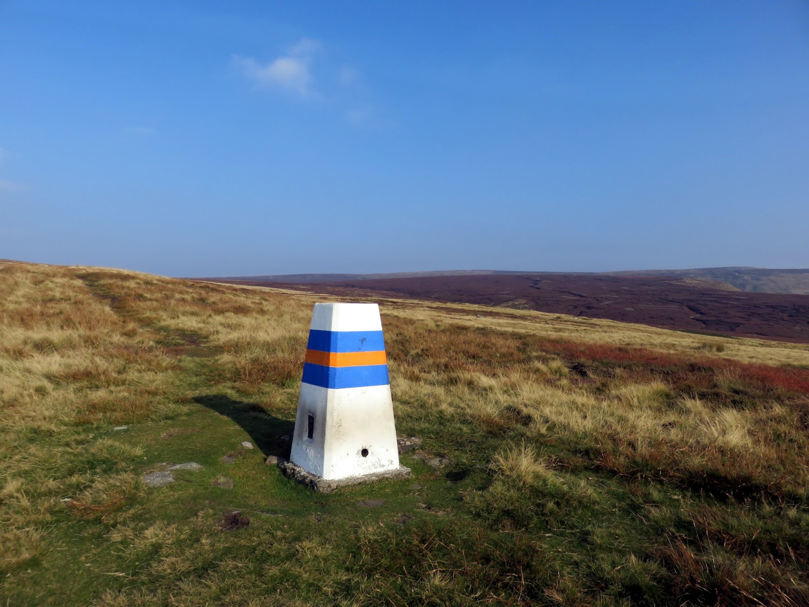 We had another short stop atop Glossop Low, in amongst the remains of a pair of buildings, old shooting huts perhaps? Away to the south west is Cock Hill (snigger) and its elaborately painted trig pillar. Cock Hill is home to a rather large (though now disused) quarry and the unnatural undulations are a result of this turbulent history. While totally man-made, they are impressive and form the centrepiece of some nice photos.