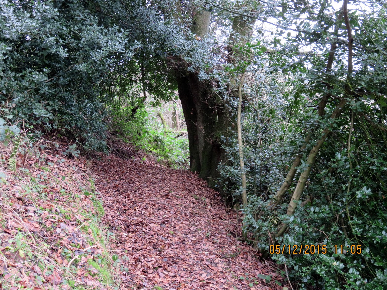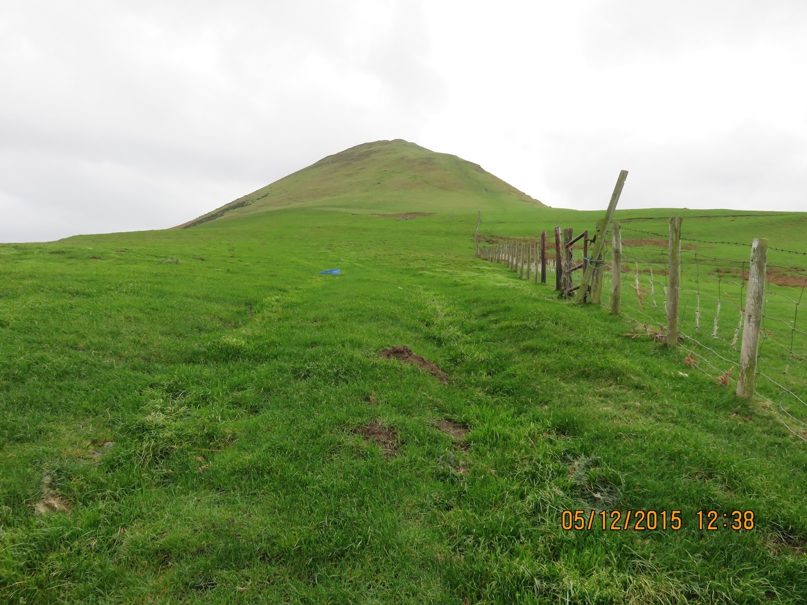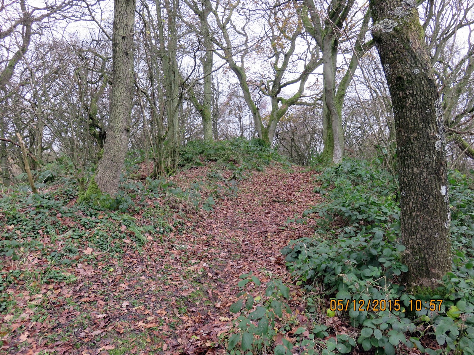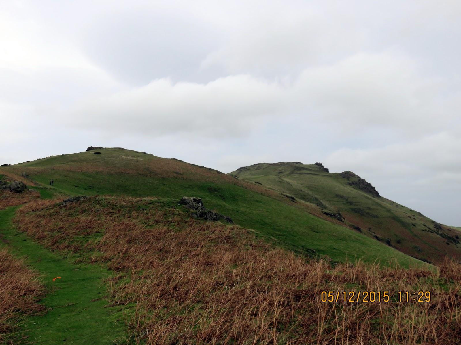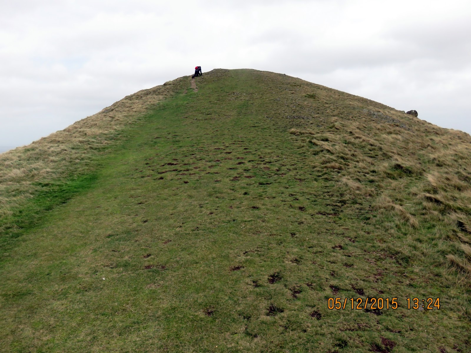 | Looking back along the ridge – the hump in the centre of the photo is one of the ancient ramparts |