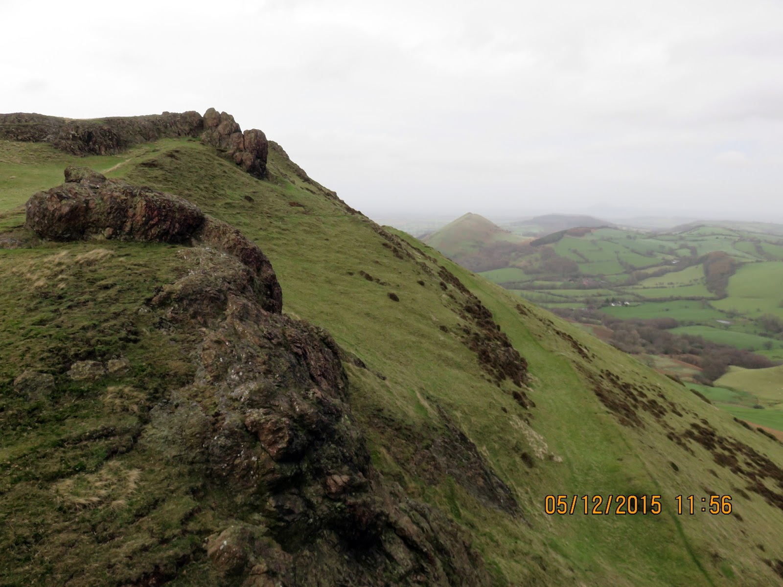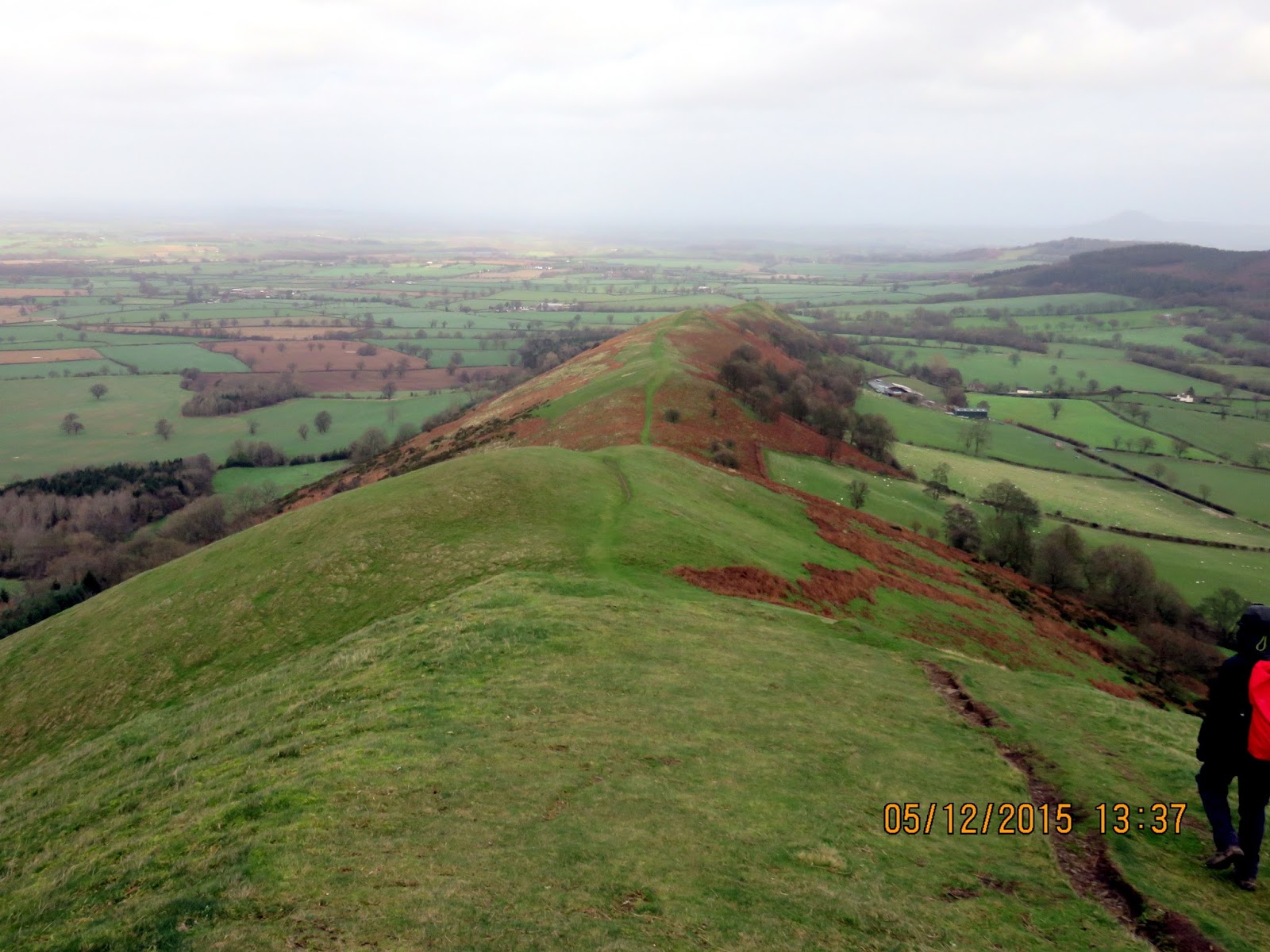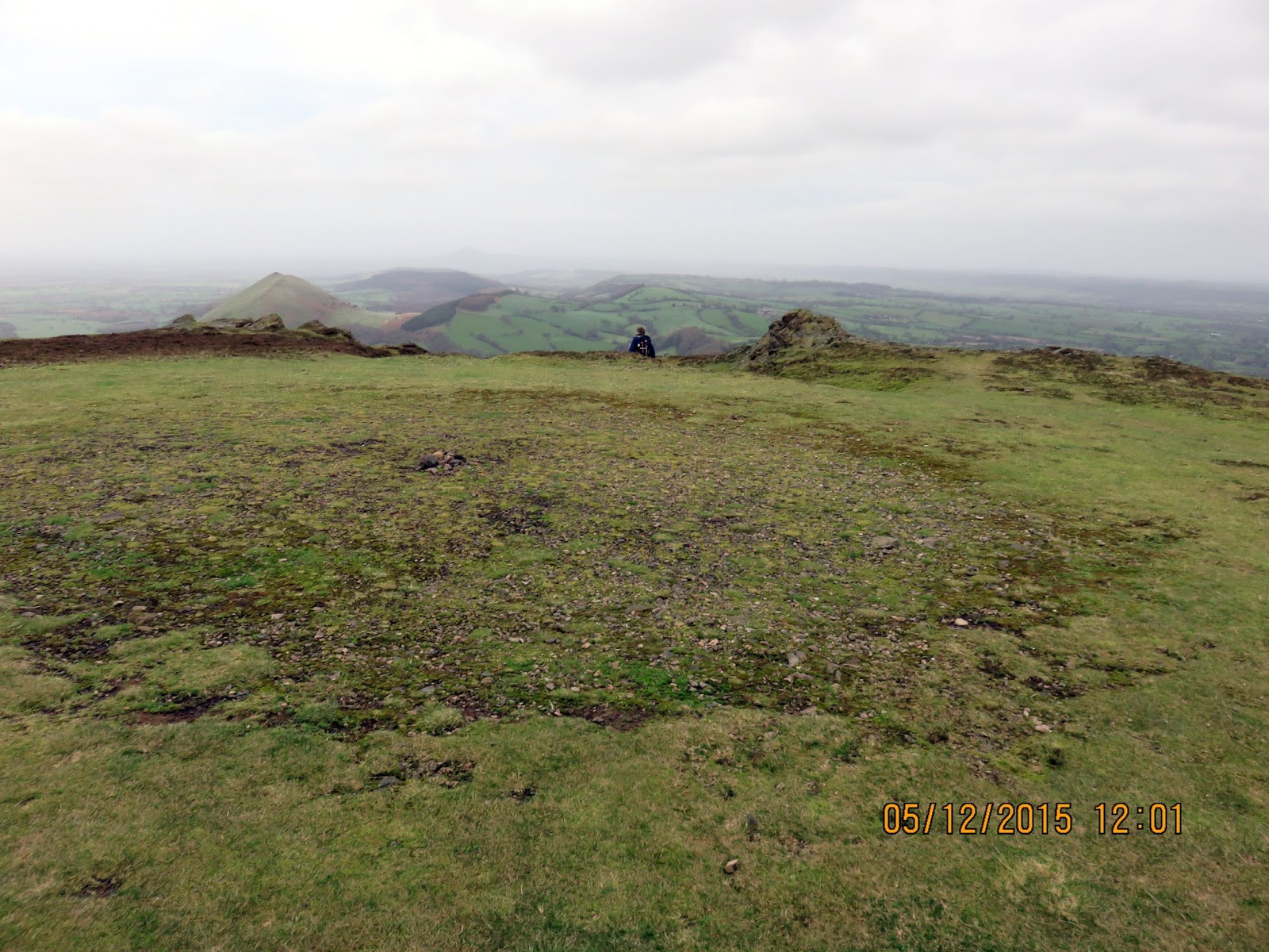 The top of Caer Caradoc undulates along, past the mounds of ancient hill fort before rising once again to the flat top. The wind here was strong to say the least though and didn;t give us much of a chance to stop and have a look around. I can say, however, that the views from all of Caer Caradoc are superb in all directions; not one aspect looks the same and all are interesting. The Wrekin was even visible some 20 miles distant, despite the gloomy day.