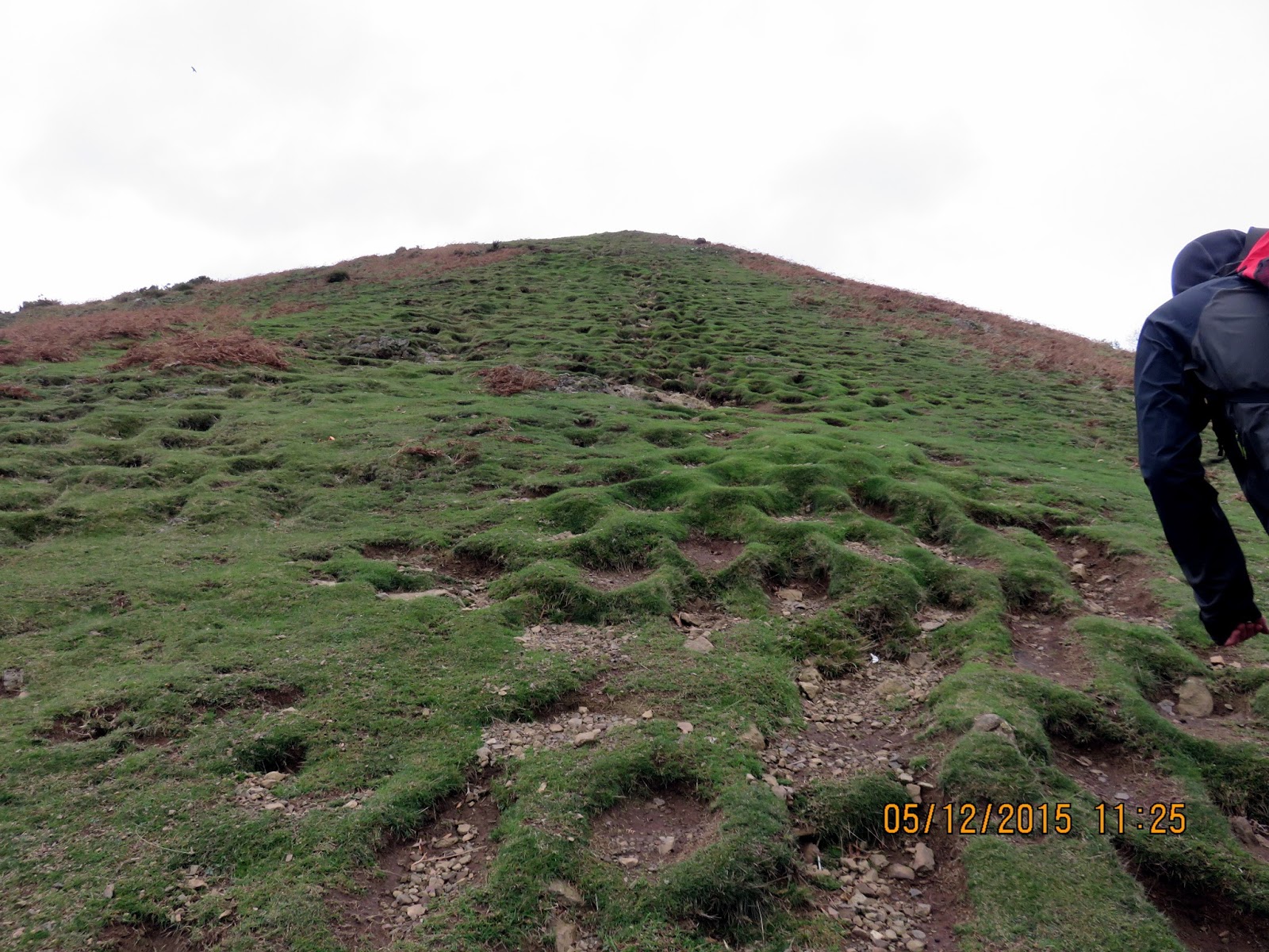 Caer Caradoc is defended on all sides by very steep slopes which, coupled with the strong wind, made for a tough climb. The initial ascent is very steep but it does ease slightly once you pass through a gate and fence around half way up. It was so windy I suspect you could have opened your jacket up and used it as a sail. We passed a couple of guys marking out a fell race for the following day though they had unwisely chosen to walk into the wind and seemed none-too-impressed by this fact.