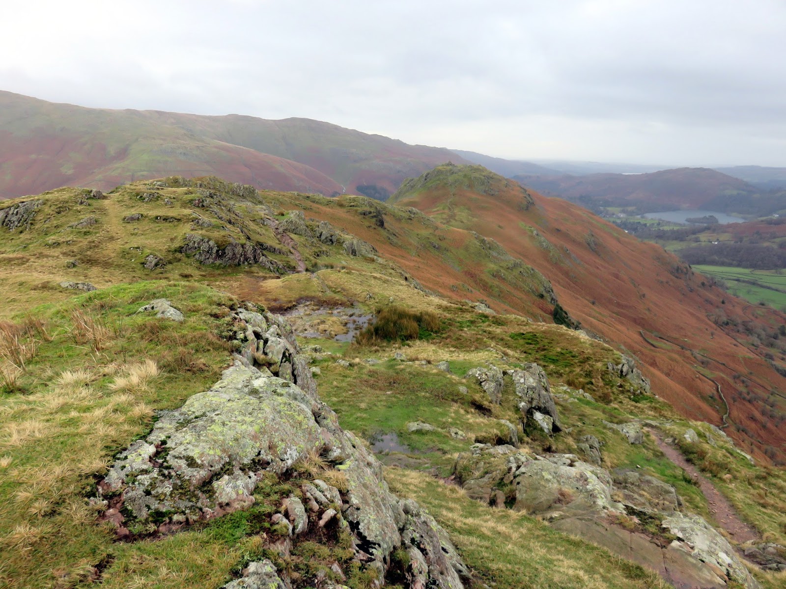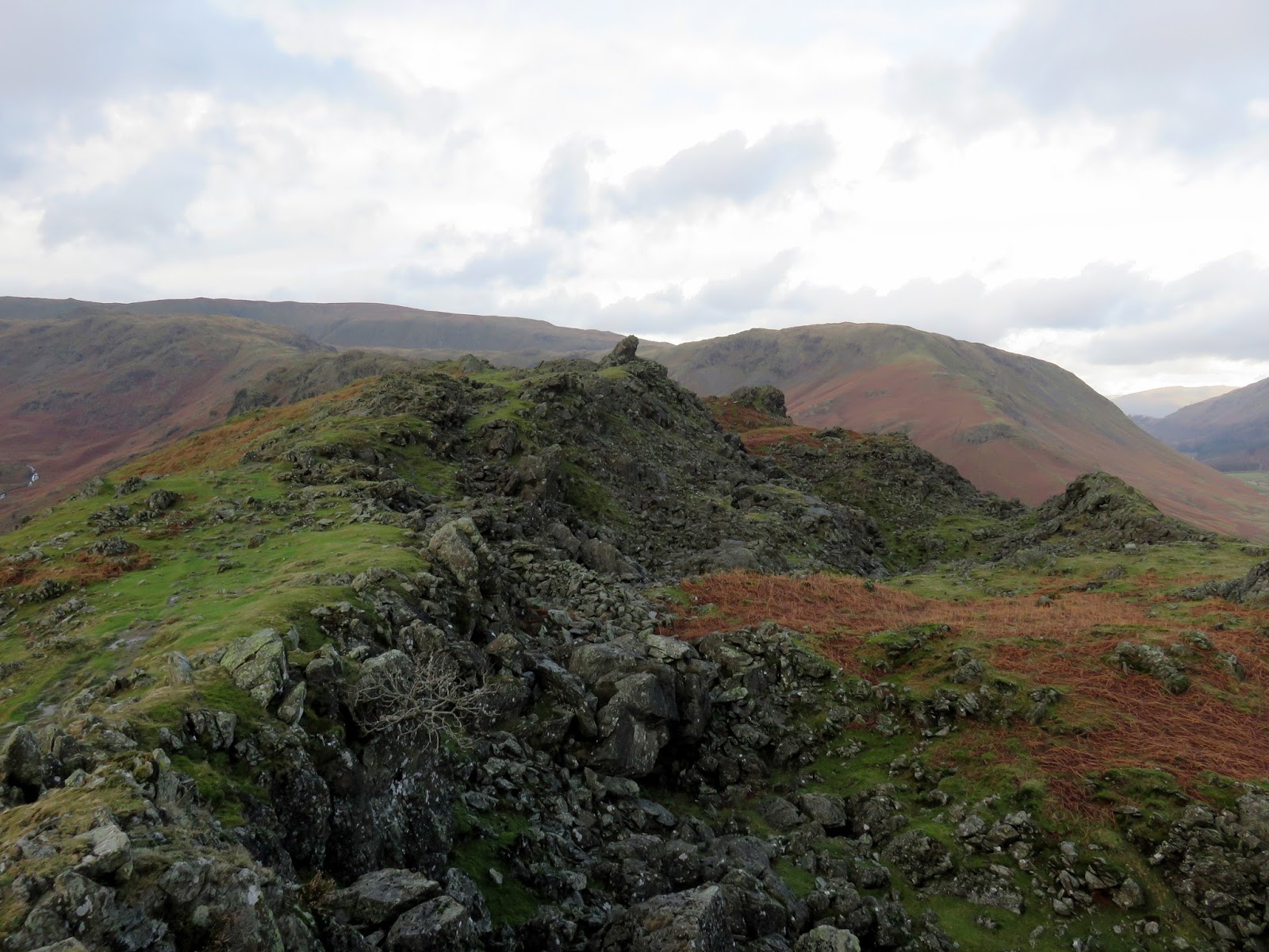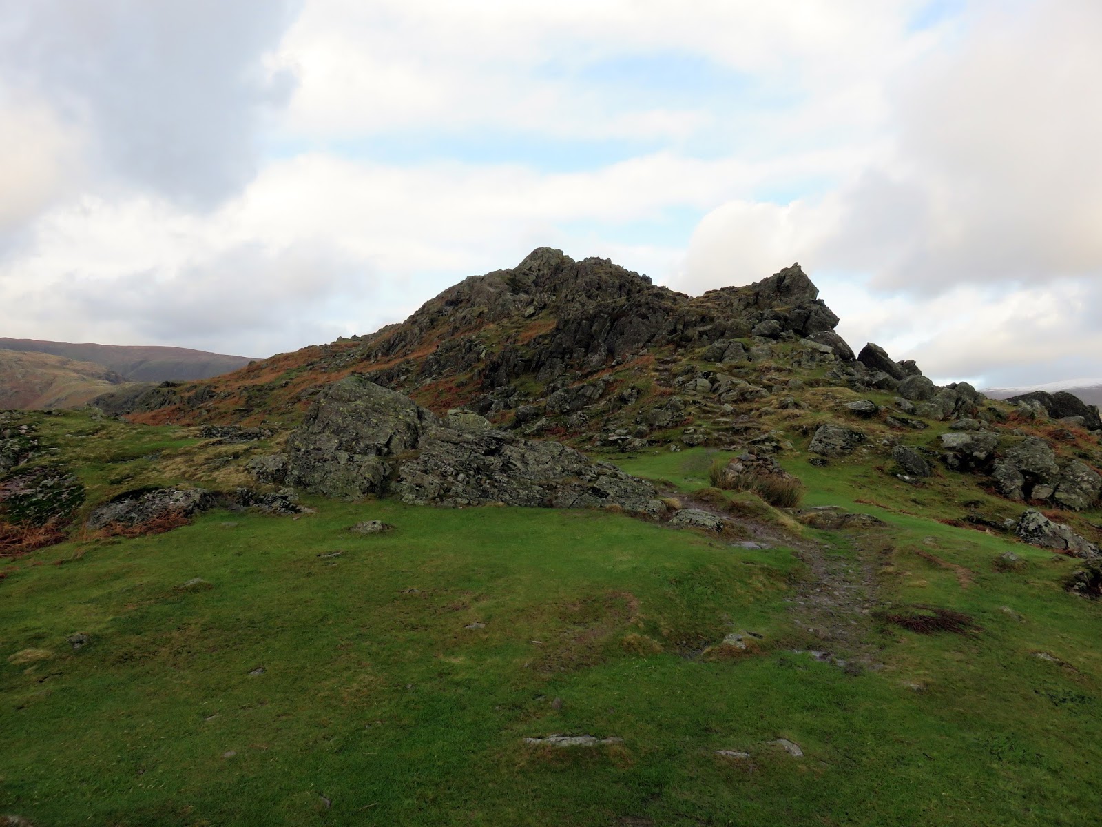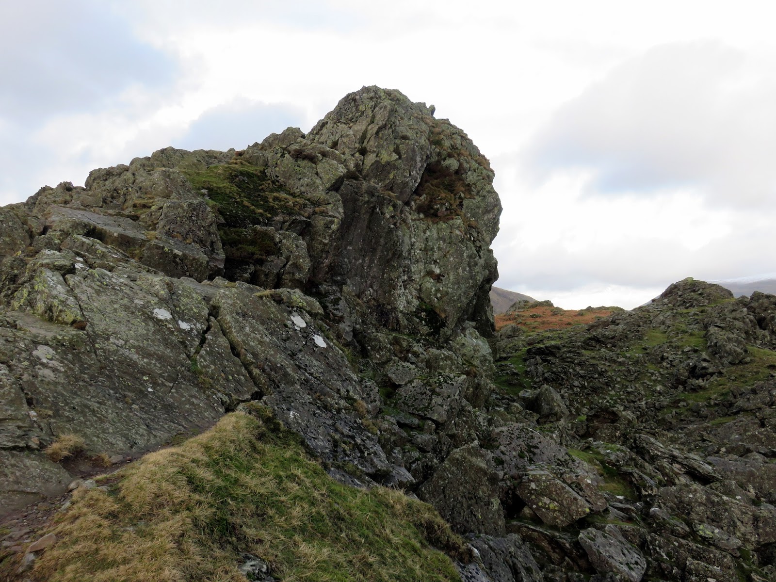 Bracken Hause separates Helm Crag from the neighbouring Gibson Knott and provides a quick way back down to the valley below if required. Up ahead is a short climb up onto Gibson Knott, a knobbly section of the ridge that is classed as a fell in its own right. During this time, clouds had shuffled across the sun, casting a familiar dull grey light across the fells and the odd speckle of water threatened rain. A passing shower perhaps? That assumption would turn out to be wrong.