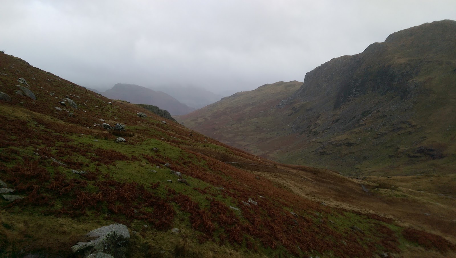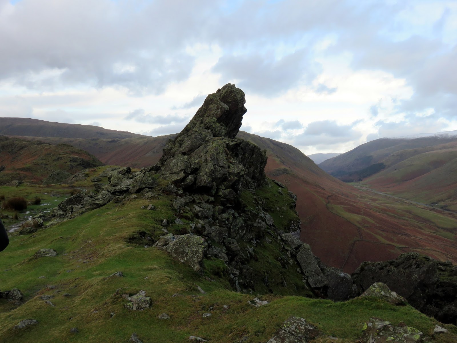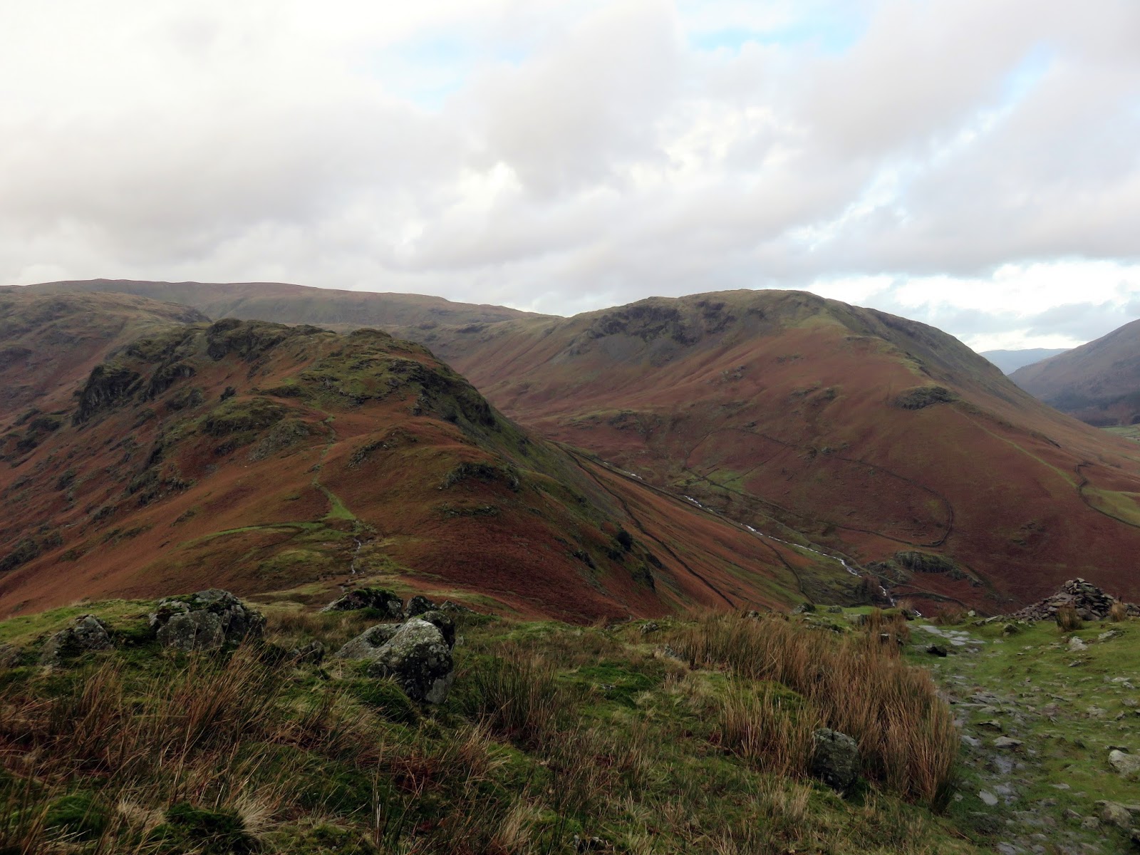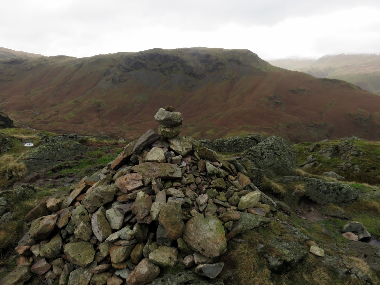 Bracken Hause separates Helm Crag from the neighbouring Gibson Knott and provides a quick way back down to the valley below if required. Up ahead is a short climb up onto Gibson Knott, a knobbly section of the ridge that is classed as a fell in its own right. During this time, clouds had shuffled across the sun, casting a familiar dull grey light across the fells and the odd speckle of water threatened rain. A passing shower perhaps? That assumption would turn out to be wrong.