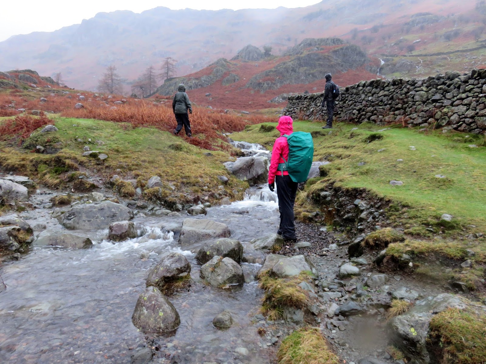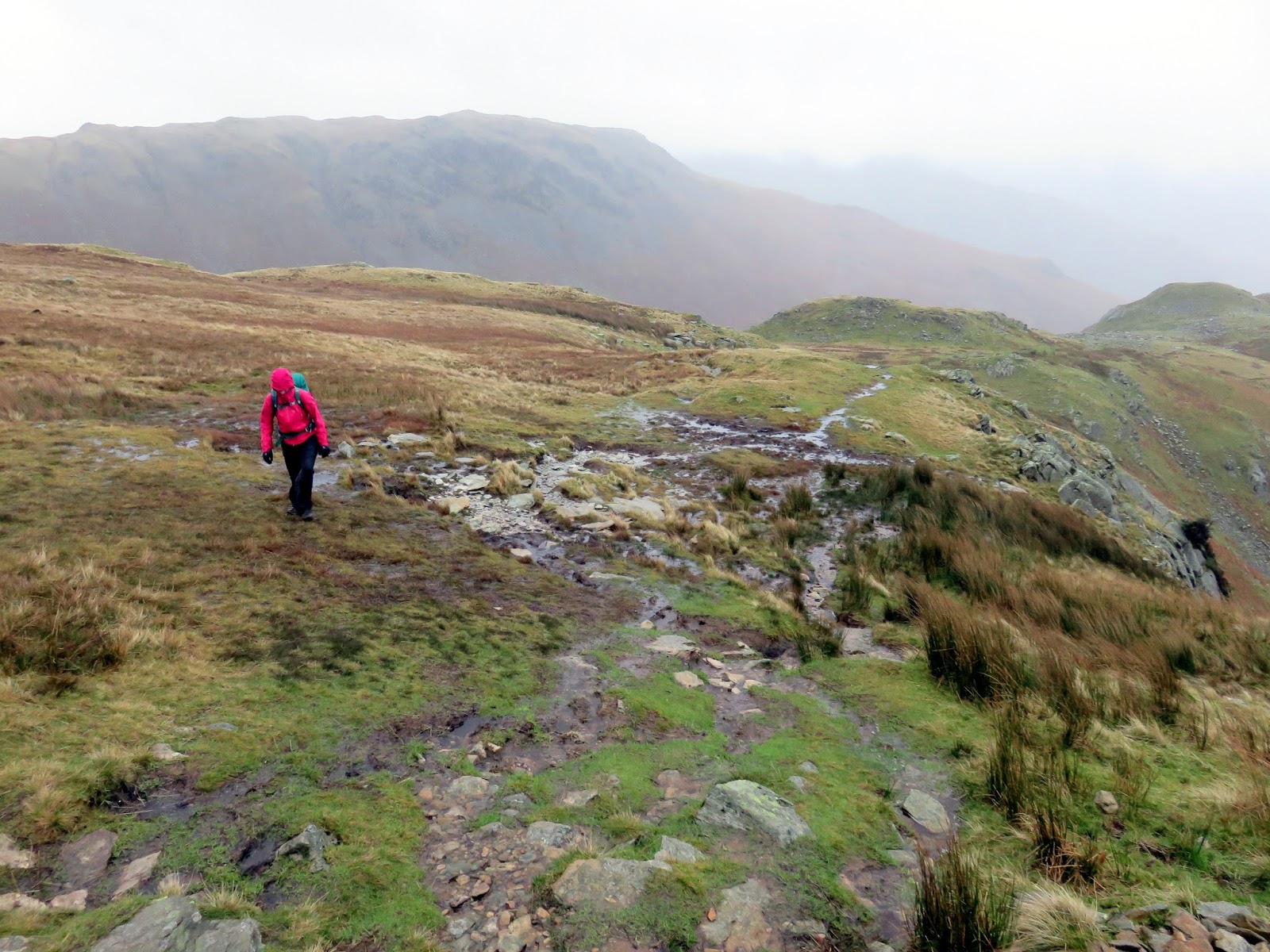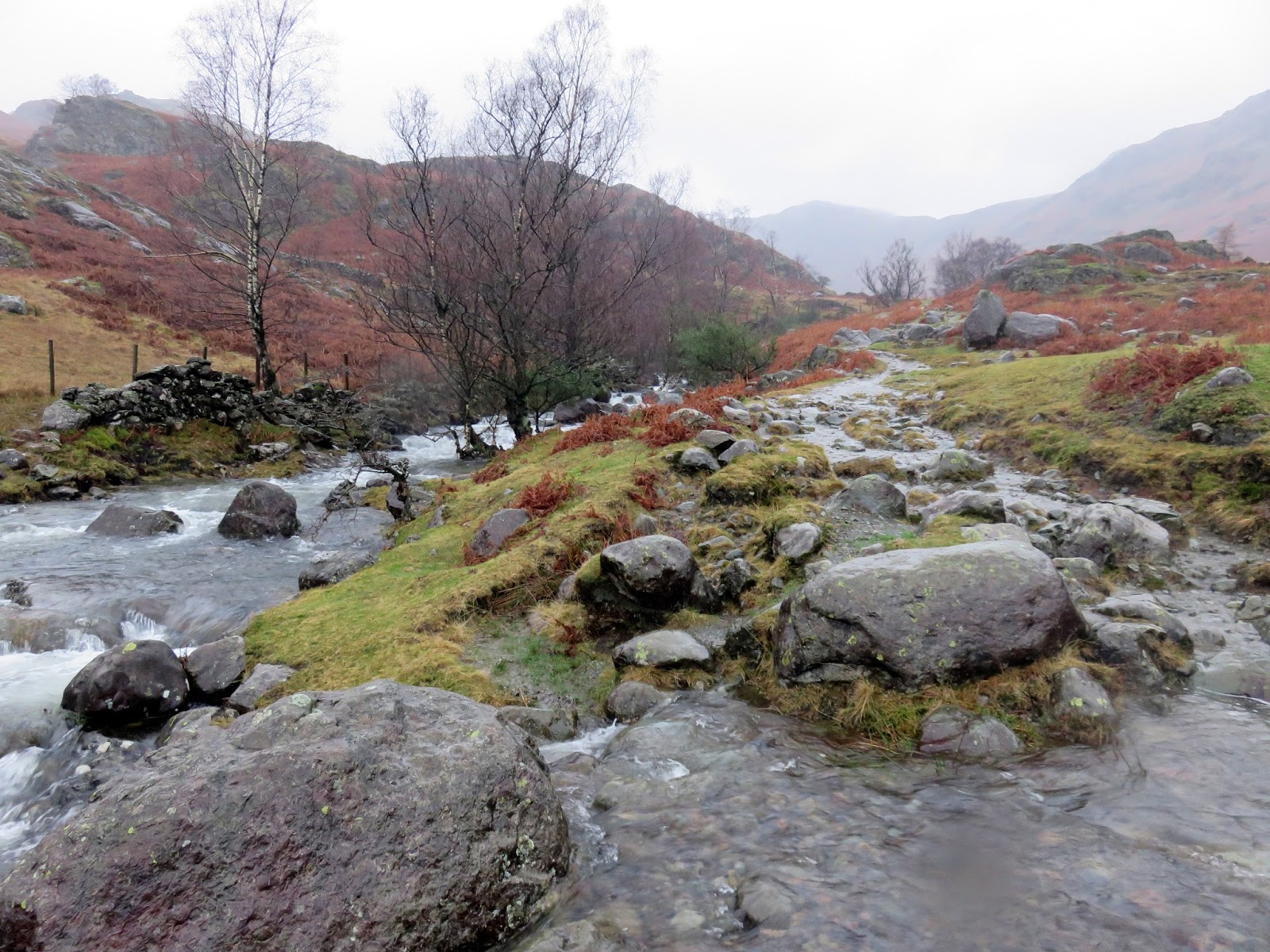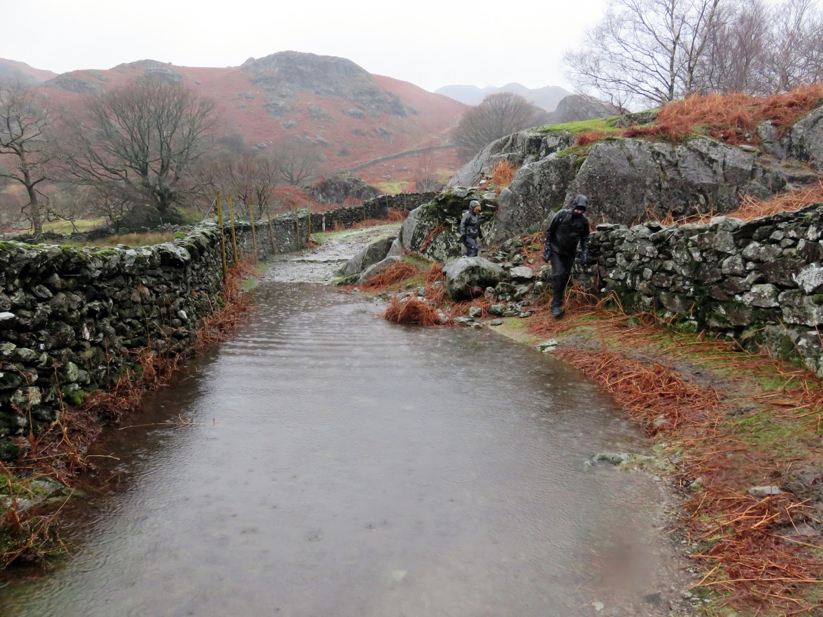 We found the path within the valley, the path the carries the Coast to Coast route through into Grasmere. Ahead was a long, sodden trudge all the way back to the village. Did I say that it was wet? Gentle streams had become raging rivers and the paths had taken up the mantle of being the streams. There was a remarkable amount of water flowing down from the fells above and the rain showed no sign of stopping. So much for passing showers.