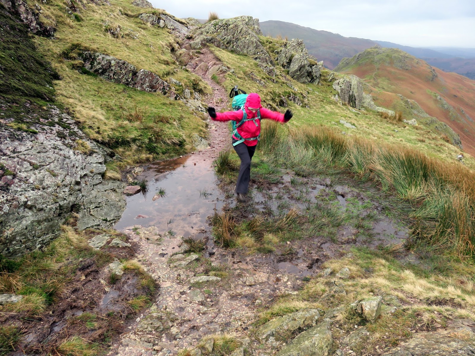 The path rises over Pike of Carrs to reach the top of Calf Crag, the highest point on the Helm Crag ridge. Sadly it hadn’t stopped raining and things only seemed to be getting worse so we abandoned any hopes of reaching Steel Fell, instead setting our sights on the sanctuary of Far Easedale below.