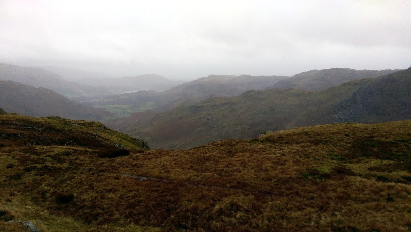 Above Moment Crag the rain started to fall. Lightly at first before becoming heavier and more persistent. With the forecast in mind we lived in hope that it was just as passing shower but the evidence in front of us suggested differently. With the wind picking up and things quickly becoming more miserable, we took the decision to press on to Calf Crag and make a decision from there.