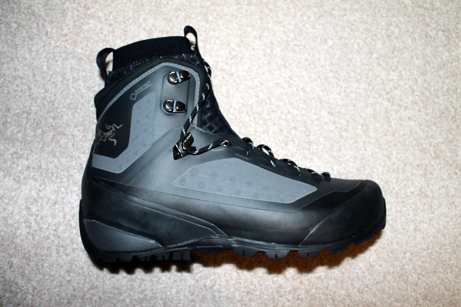 The water resistance of these boots is provided by a separate, stretchy liner made from air permeable foam and stretch Gore-Tex. On the top-end Bora2 boot, the Gore-Tex liner boot is removable – on this pair it is sewn in along the foot bed. This bootie, being stretchy, forms around the shape of your foot to provide a satisfying, sock-like fit. Arc’teryx refer to this as ‘Arc’teryx Adaptive Fit’.