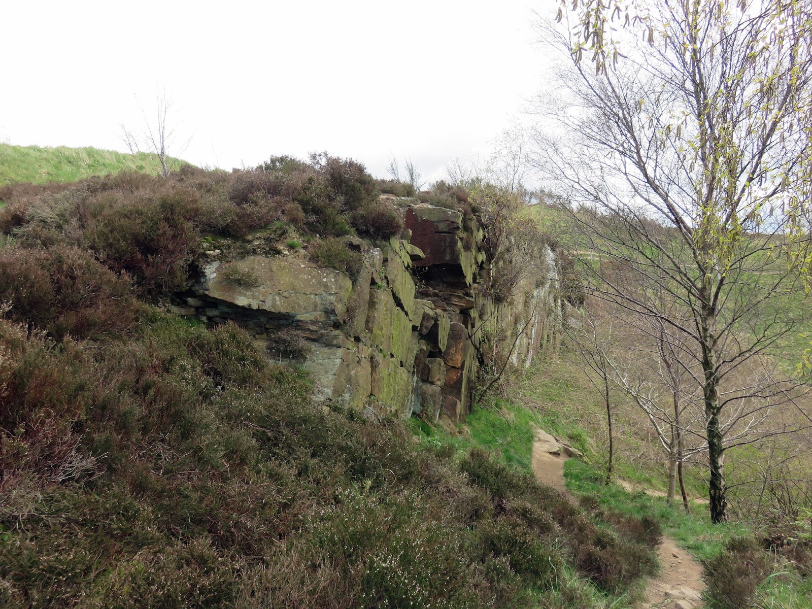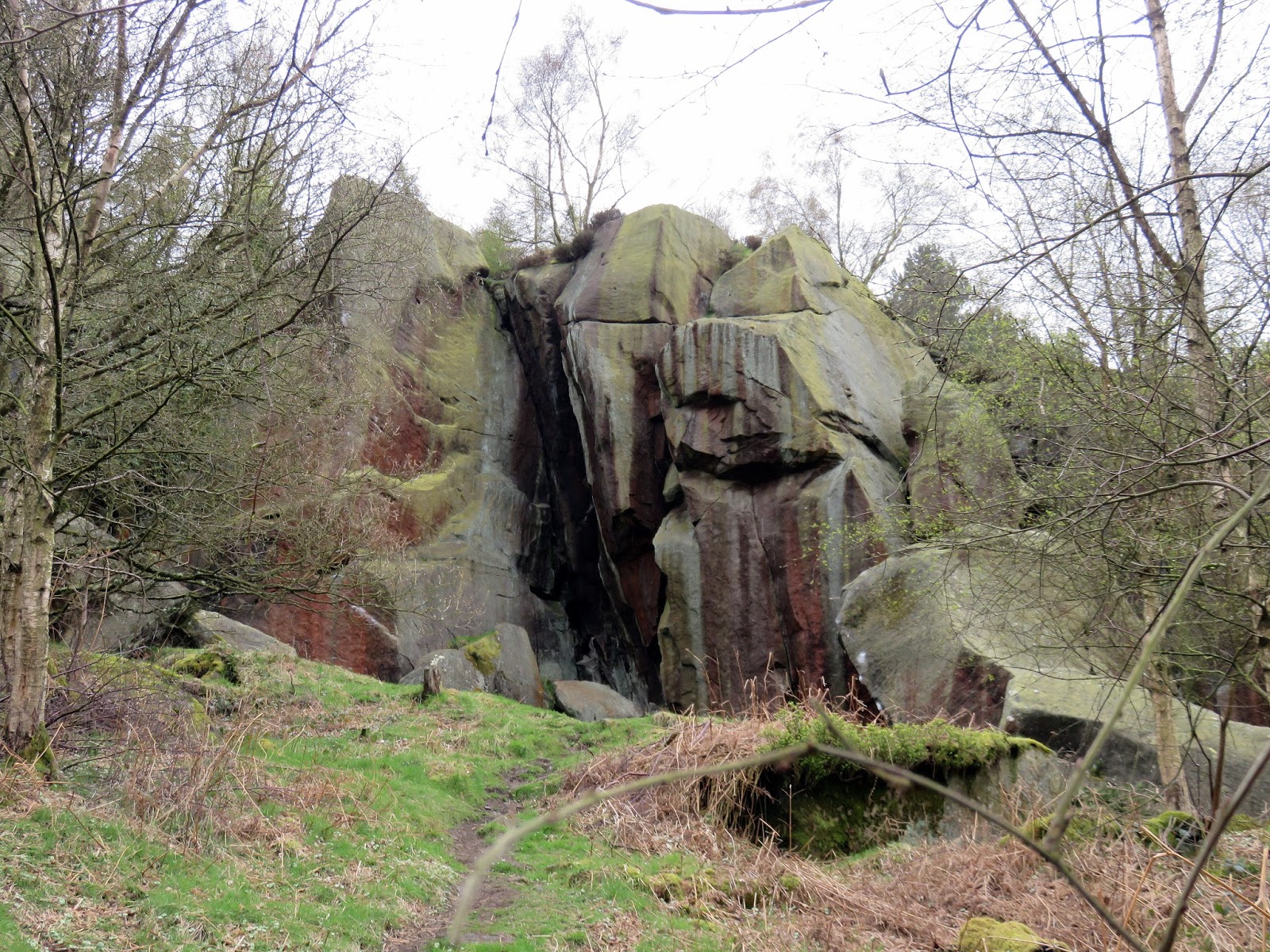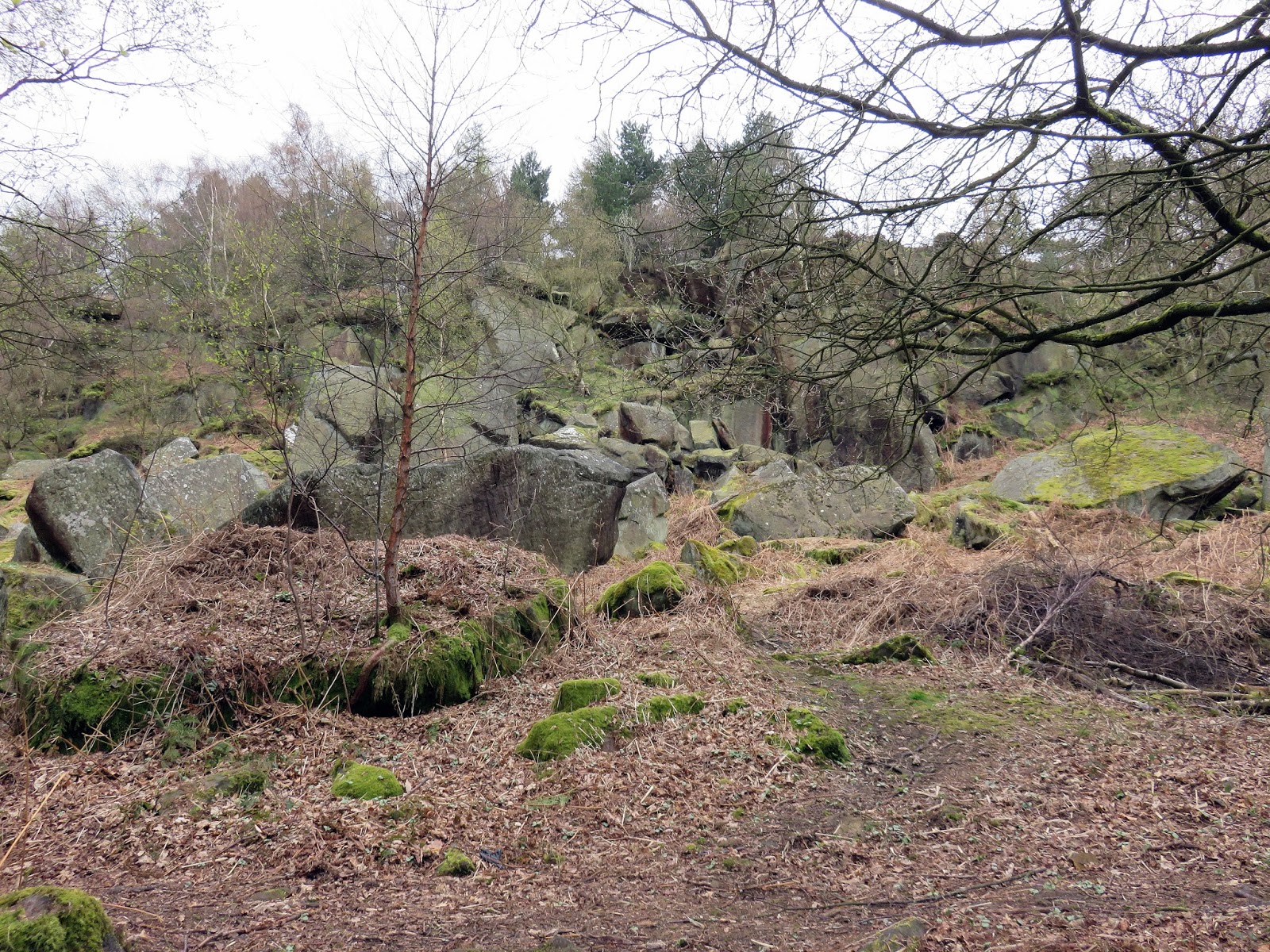The path climbs directly towards the top of The Chevin but we were intent on saving that for later. Instead we turned south east to cut across the hillside through Ritchies Wood to the crags of the disused East Chevin Quarry. The millstone rocks could have been lifted straight from Stanage Edge and its certainly a surprise to find something so dramatic so close to Leeds. The track follows the line of crags to reach one of many free car parks that are dotted around the Forest Park.