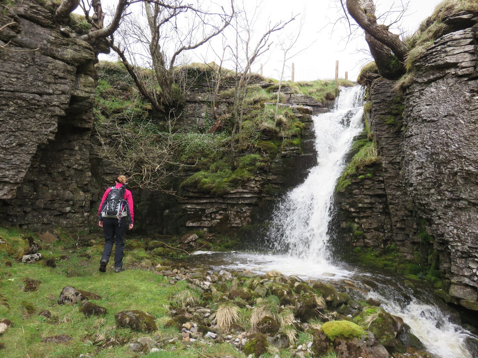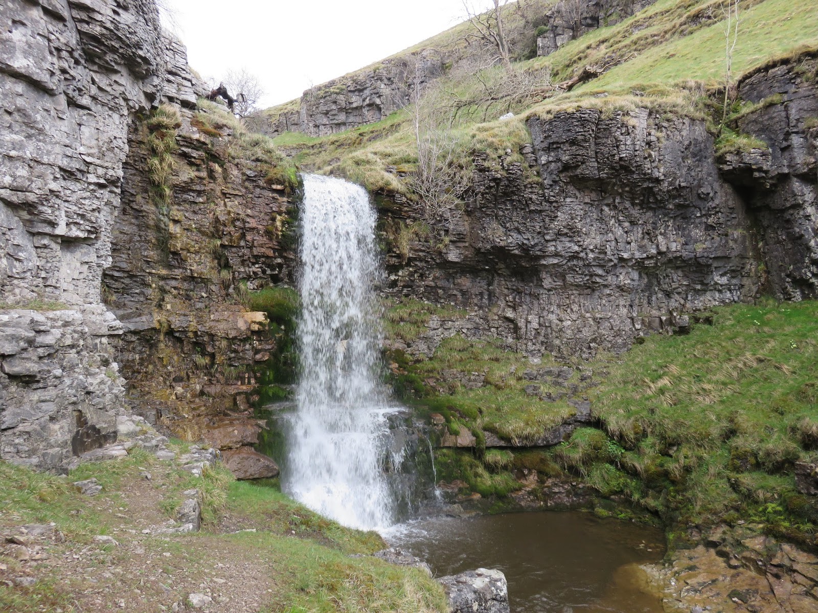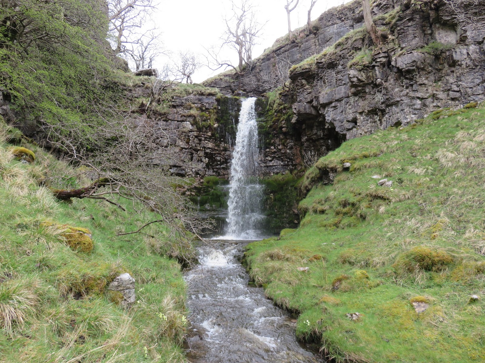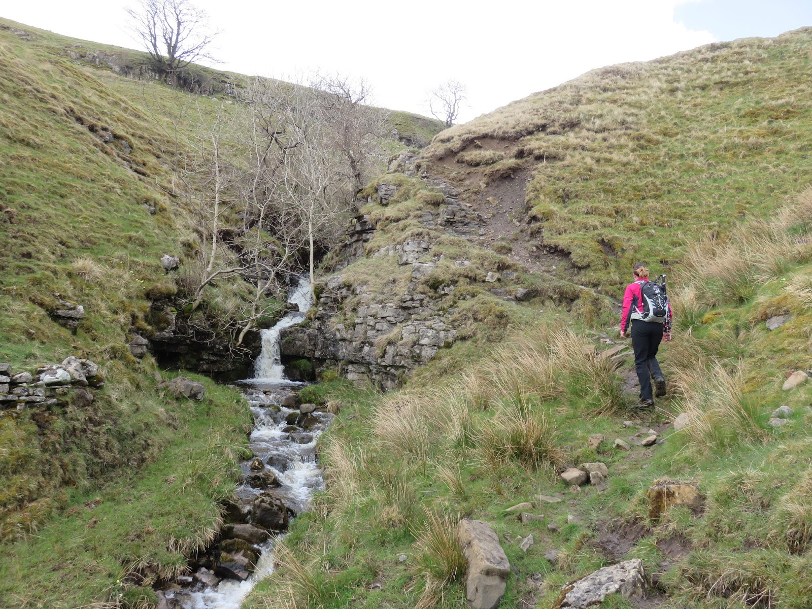Passing around The Buck pub, the narrow village lanes lead towards the opening of the valley of Buckden Beck. Once through a gate, a small path can be seen heading towards the small Yorkshire Water reservoir that serves the village, heading off up into the ravine beyond. After a short distance, a magnificent waterfall is reached, falling some 6 or 7 metres over a sheer wall of rock. Its great to be able to inspect it up close but, on first inspection, the route around it is not particularly clear.