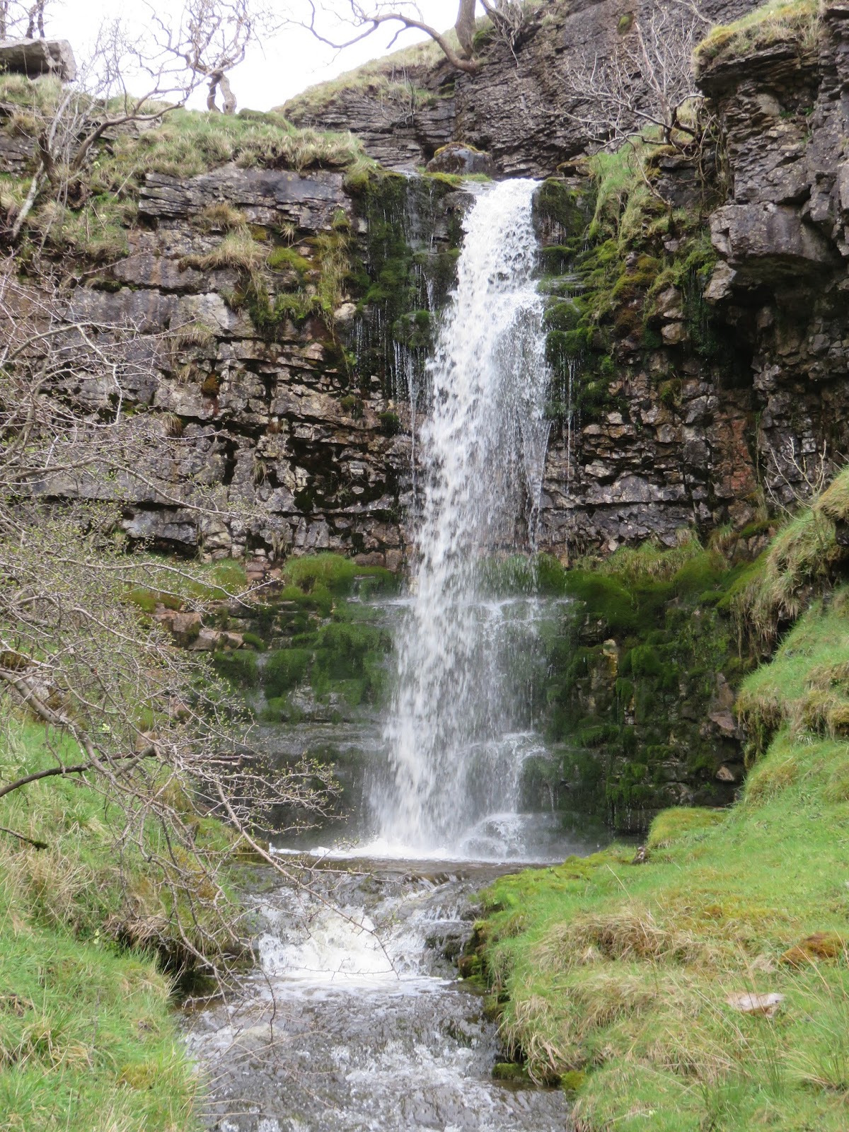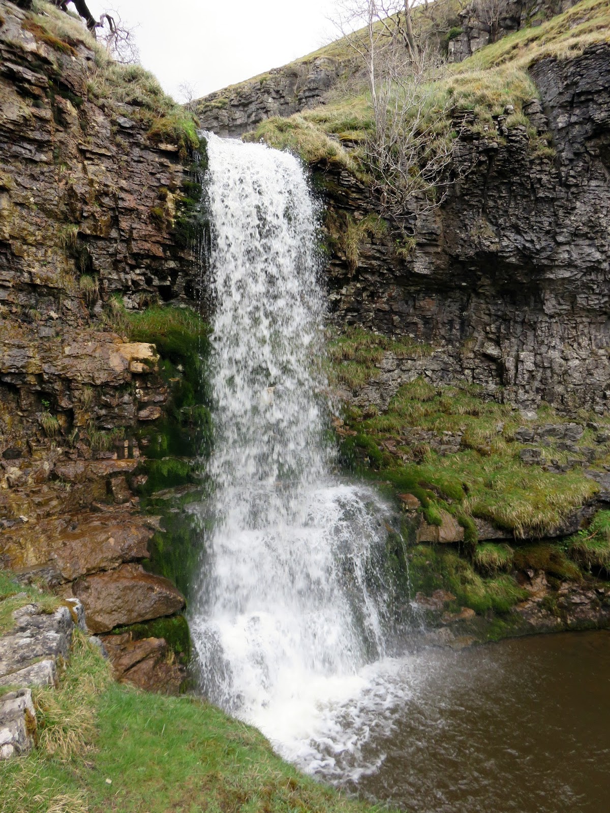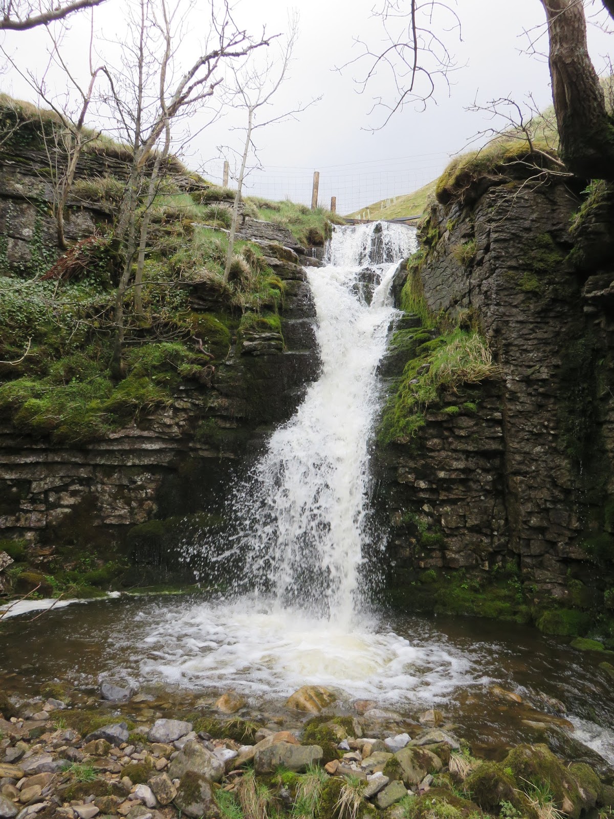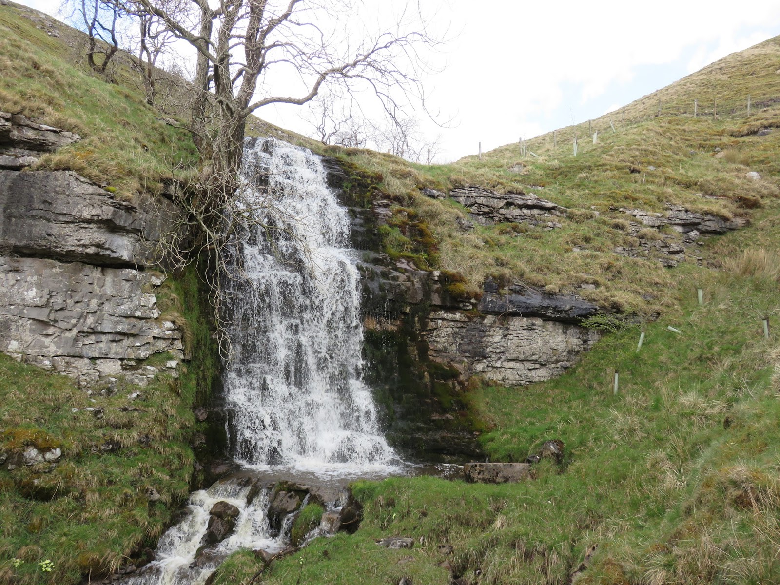 Passing around The Buck pub, the narrow village lanes lead towards the opening of the valley of Buckden Beck. Once through a gate, a small path can be seen heading towards the small Yorkshire Water reservoir that serves the village, heading off up into the ravine beyond. After a short distance, a magnificent waterfall is reached, falling some 6 or 7 metres over a sheer wall of rock. Its great to be able to inspect it up close but, on first inspection, the route around it is not particularly clear.