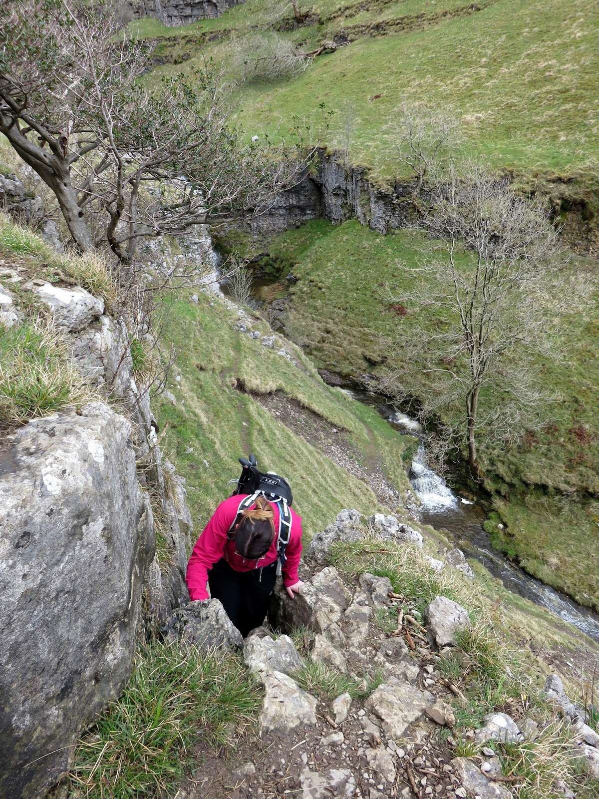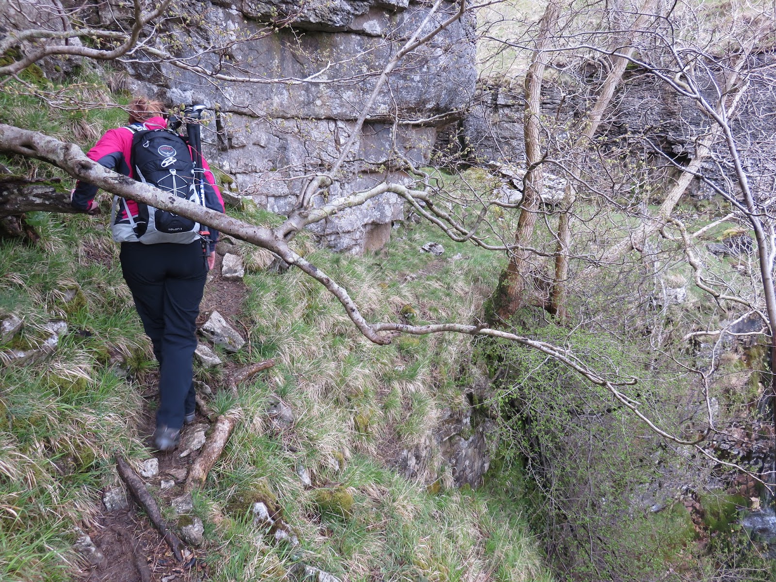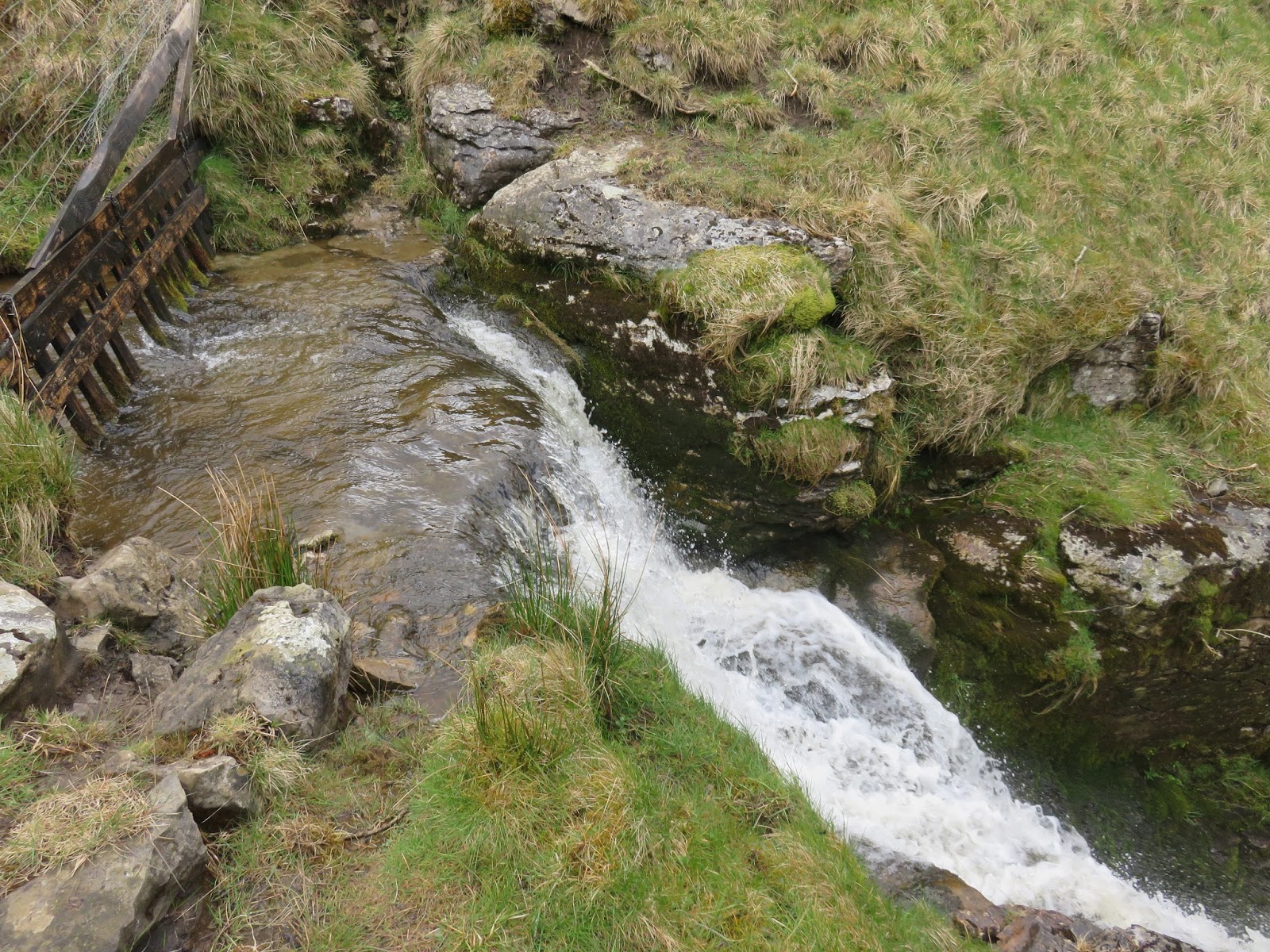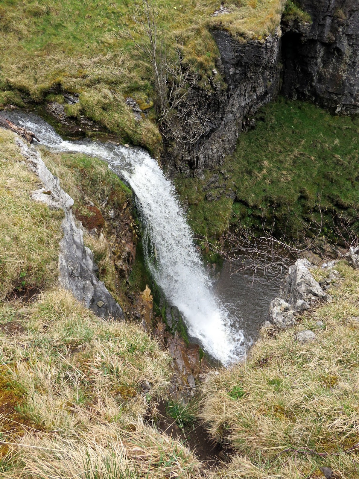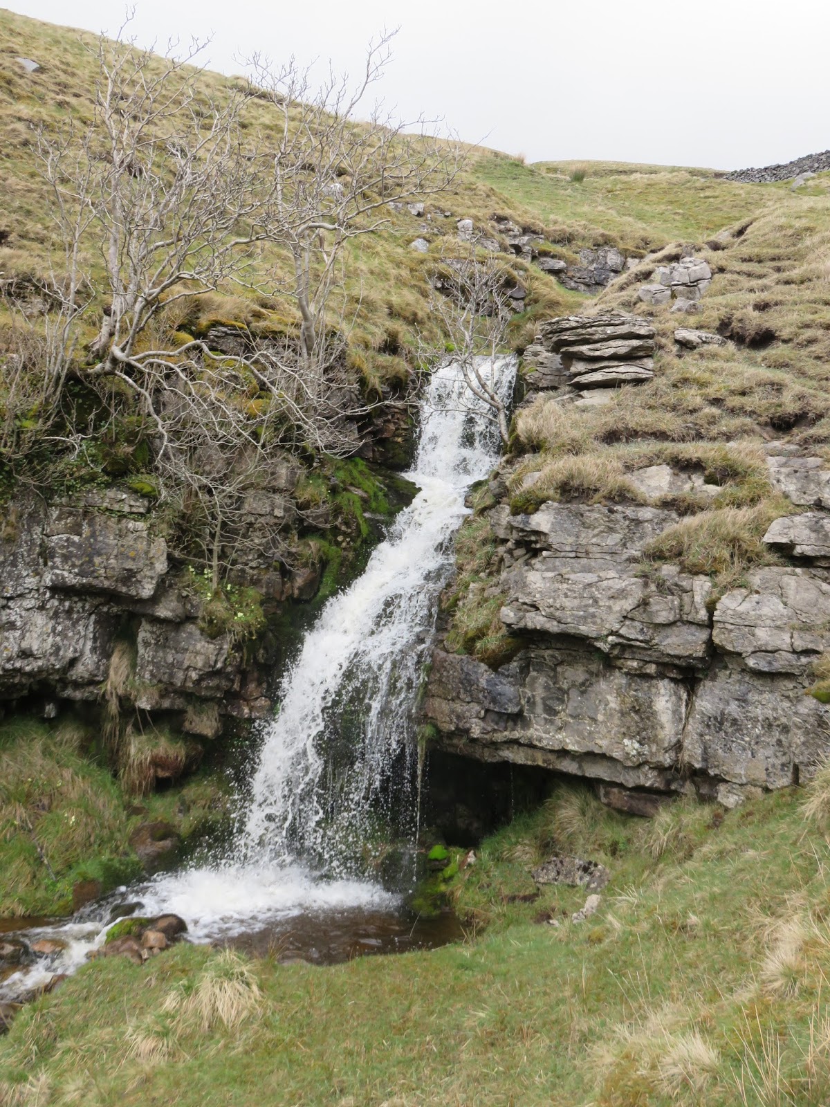 Passing around The Buck pub, the narrow village lanes lead towards the opening of the valley of Buckden Beck. Once through a gate, a small path can be seen heading towards the small Yorkshire Water reservoir that serves the village, heading off up into the ravine beyond. After a short distance, a magnificent waterfall is reached, falling some 6 or 7 metres over a sheer wall of rock. Its great to be able to inspect it up close but, on first inspection, the route around it is not particularly clear.