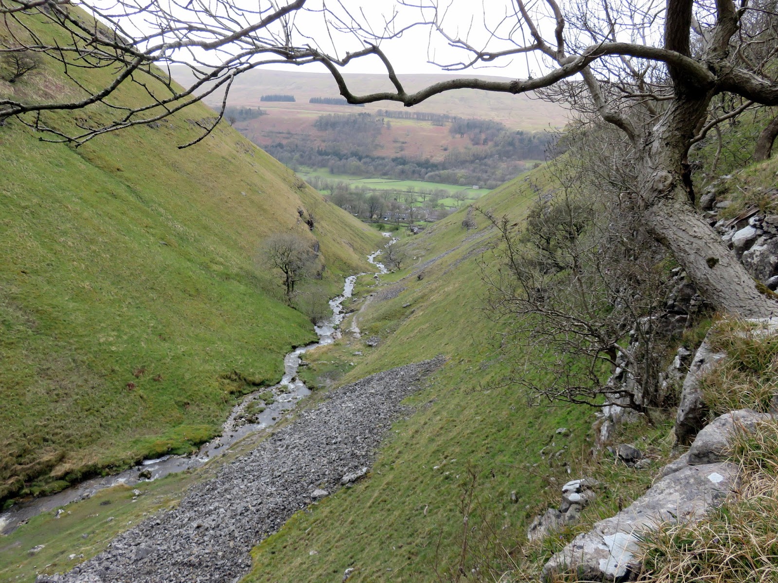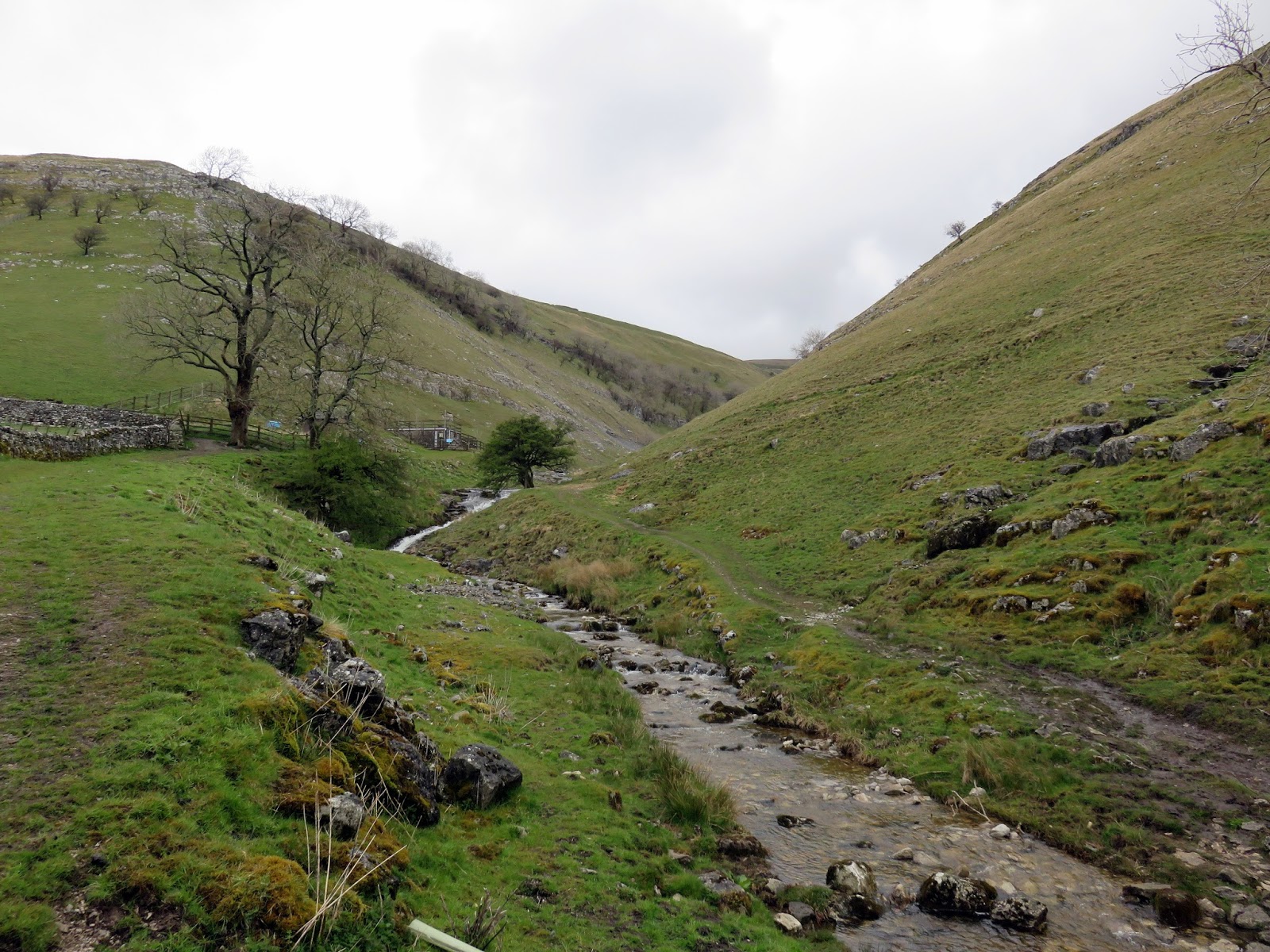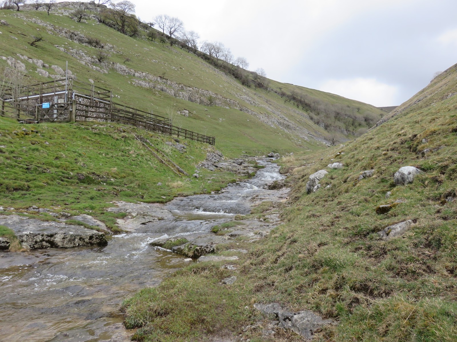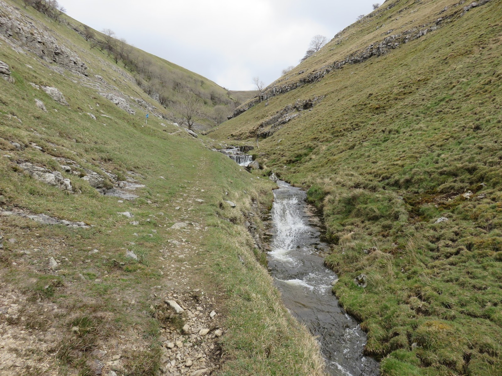 Passing around The Buck pub, the narrow village lanes lead towards the opening of the valley of Buckden Beck. Once through a gate, a small path can be seen heading towards the small Yorkshire Water reservoir that serves the village, heading off up into the ravine beyond. After a short distance, a magnificent waterfall is reached, falling some 6 or 7 metres over a sheer wall of rock. Its great to be able to inspect it up close but, on first inspection, the route around it is not particularly clear.