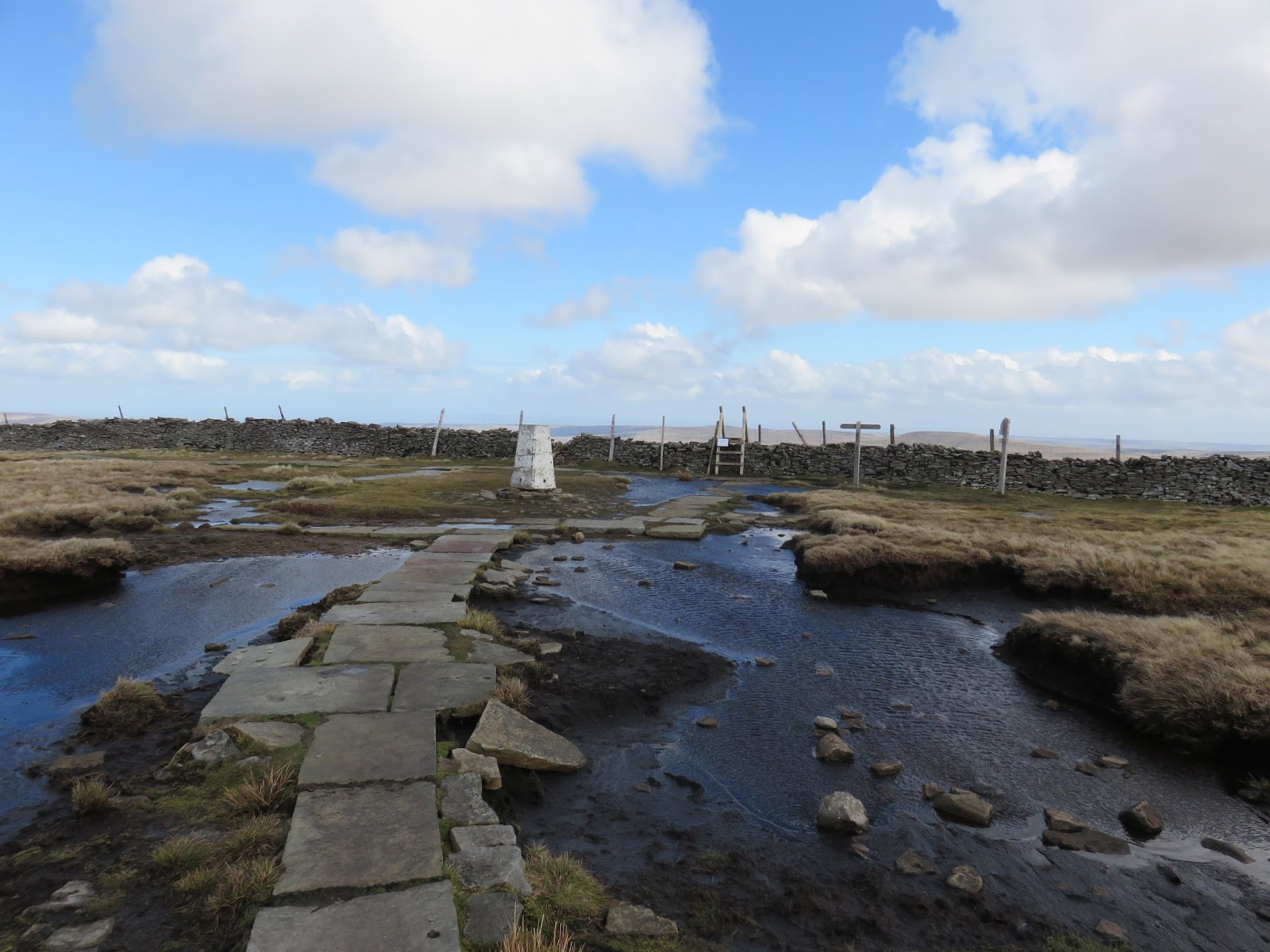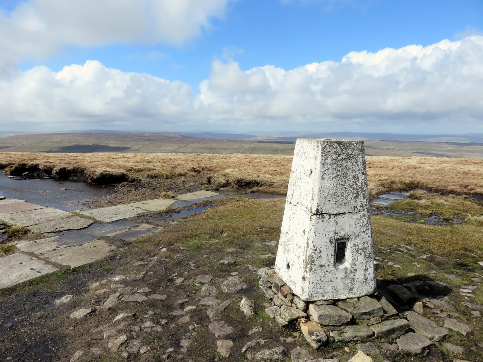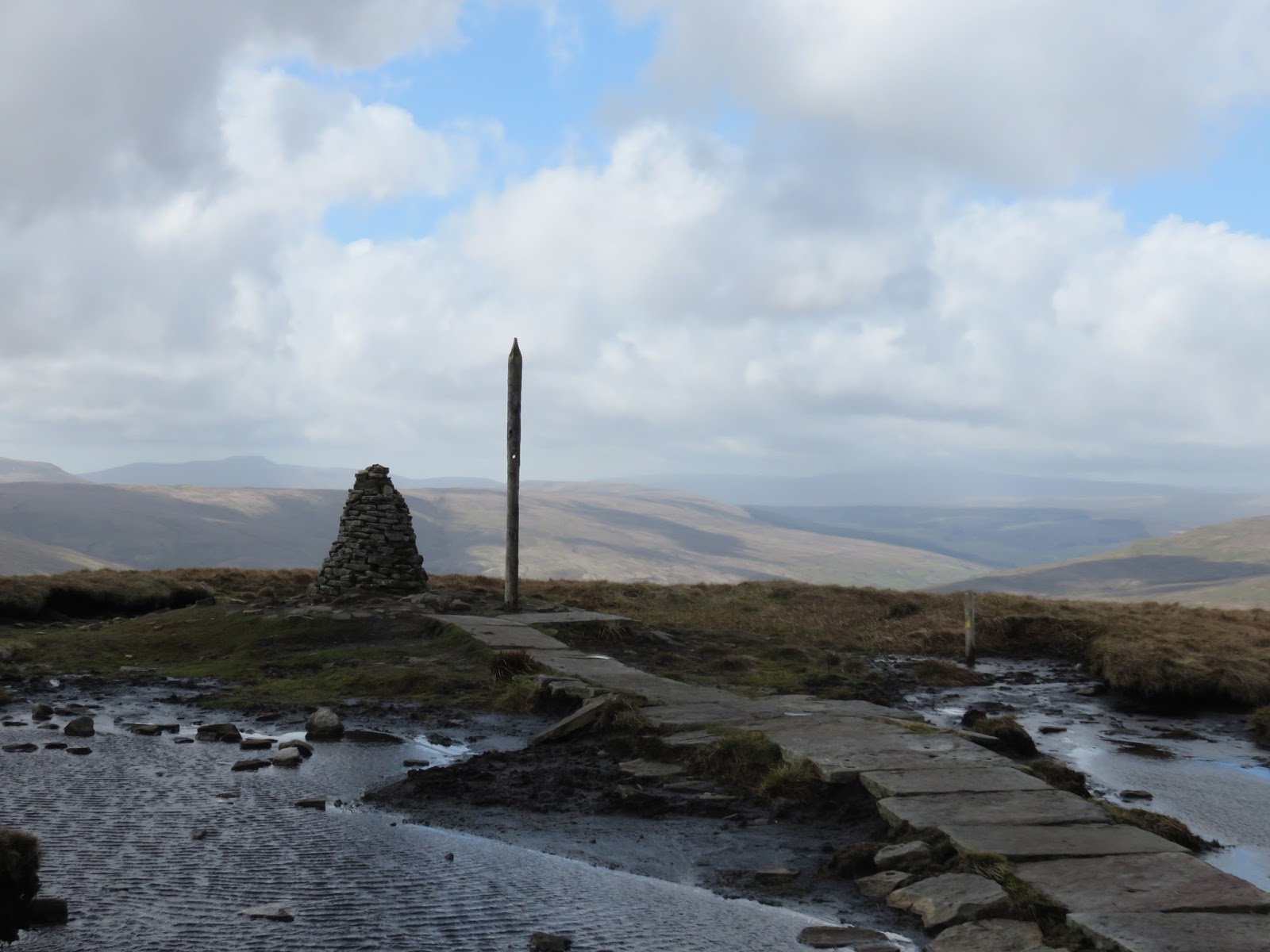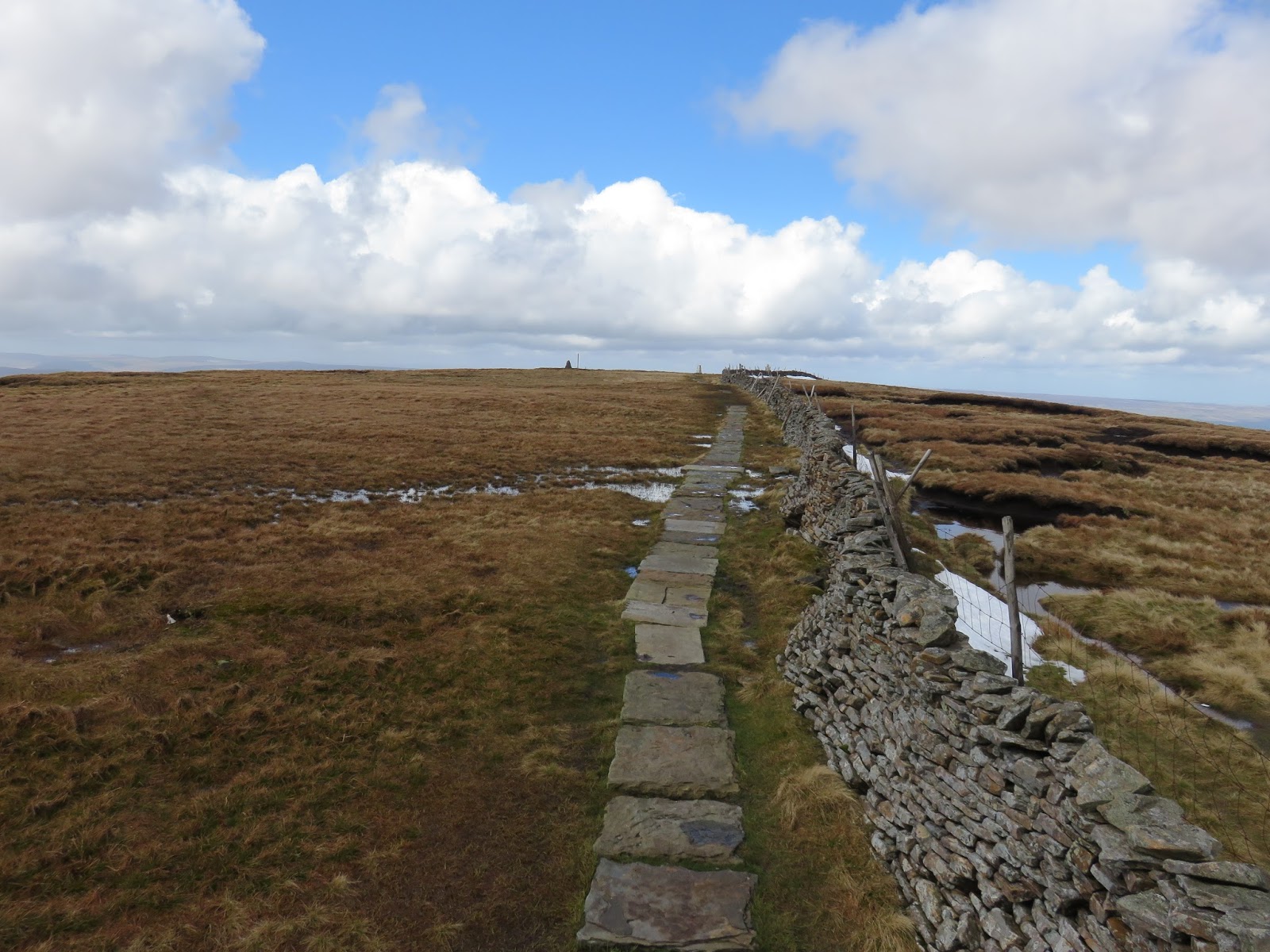 The steepness abates as the path reaches the broad ridge of Buckden Pike, the lies a short distance to the north after crossing a drystone wall. A white OS pillar sits proudly on top, accompanied by an odd cairn with a post some metres distant. The summit also benefits from some fairly recently laid stone slabs to avoid any boggy parts.