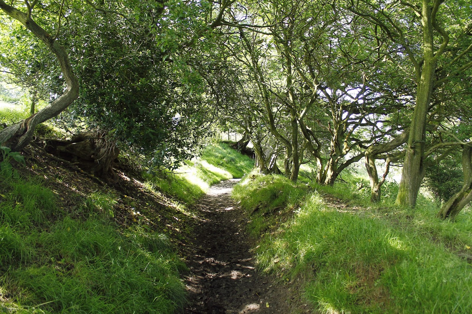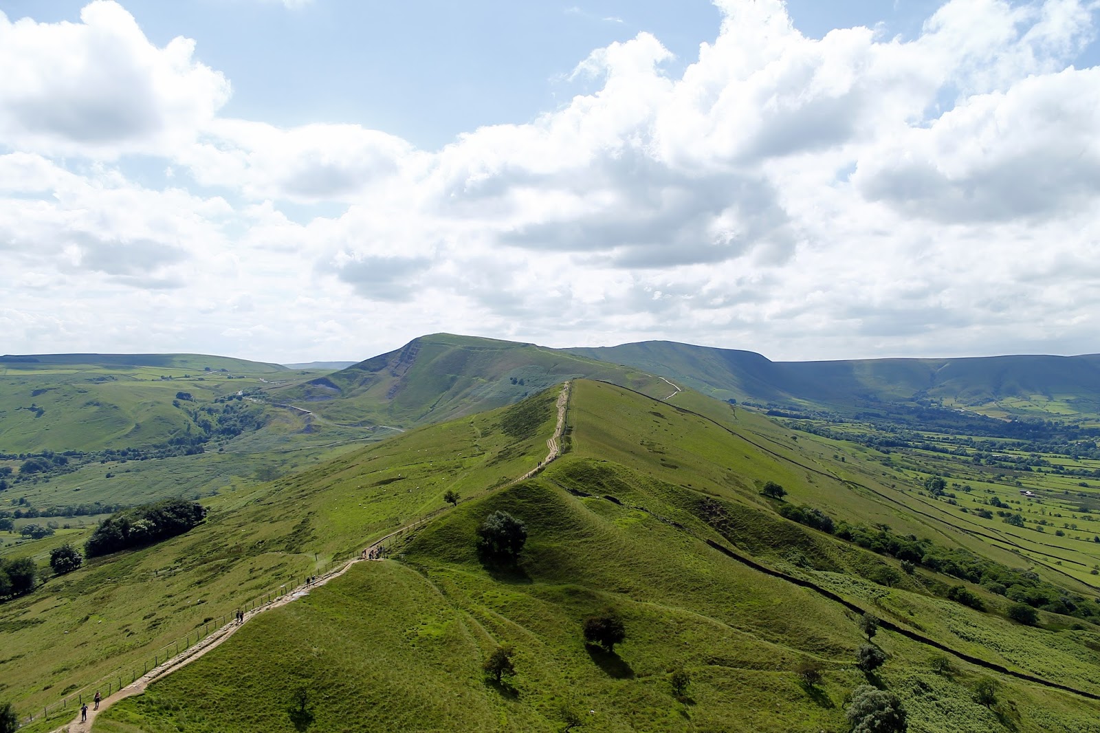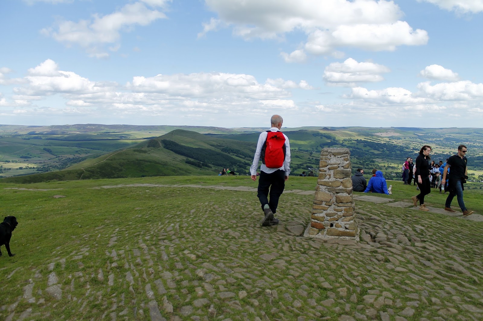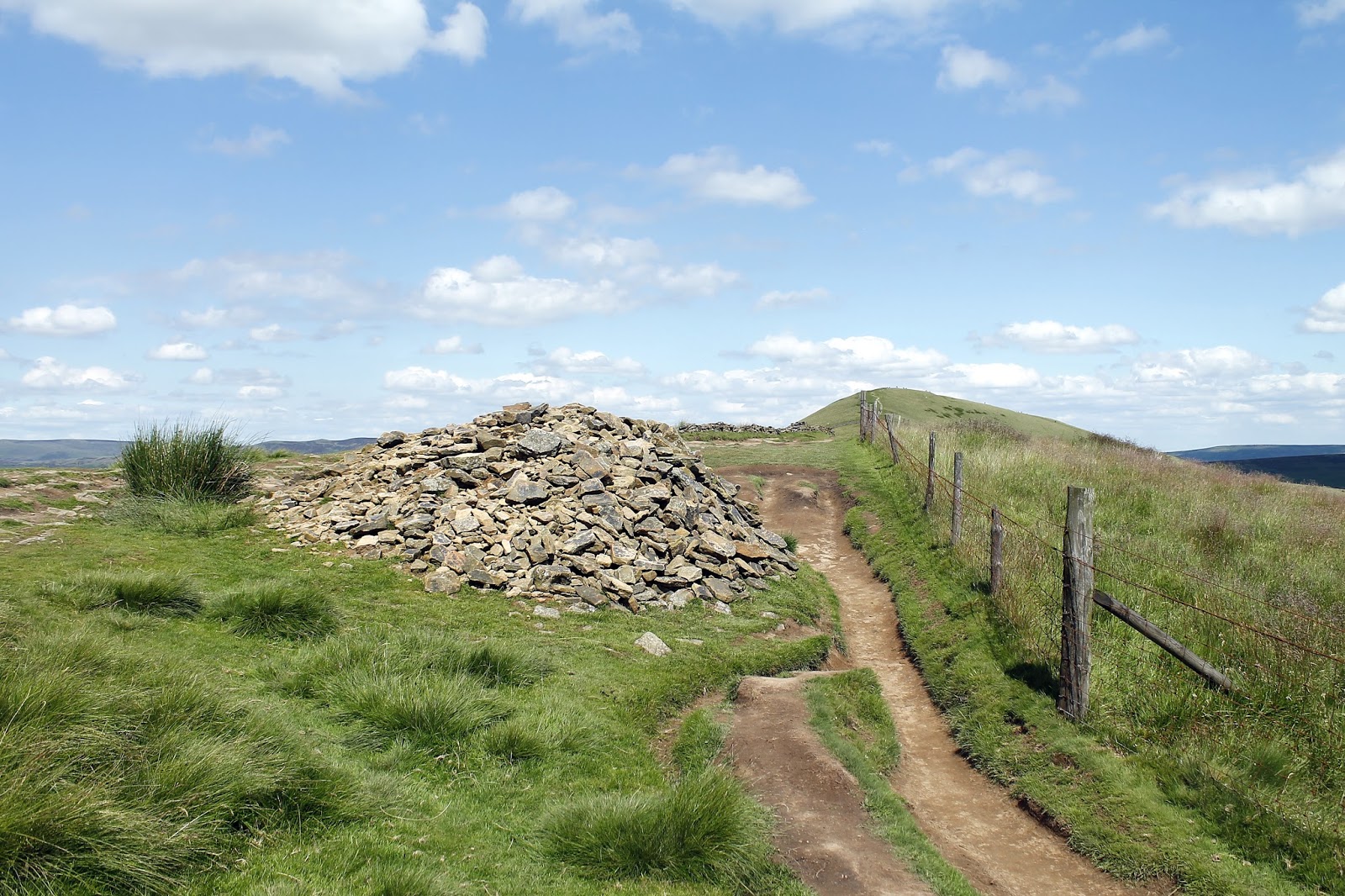 The path falls from Mam Tor to Hollins Cross, the lowest point on the ridge. It was also the traditional route from Castleton to Edale. Coffins from Edale were taken over Hollins Cross to Hope church until a church was constructed in Edale, leading to the nickname of the “coffin road” for this route. A cairn sits in Hollins Cross, a memorial to Tom Hyett, erected in his memory by his walking club.