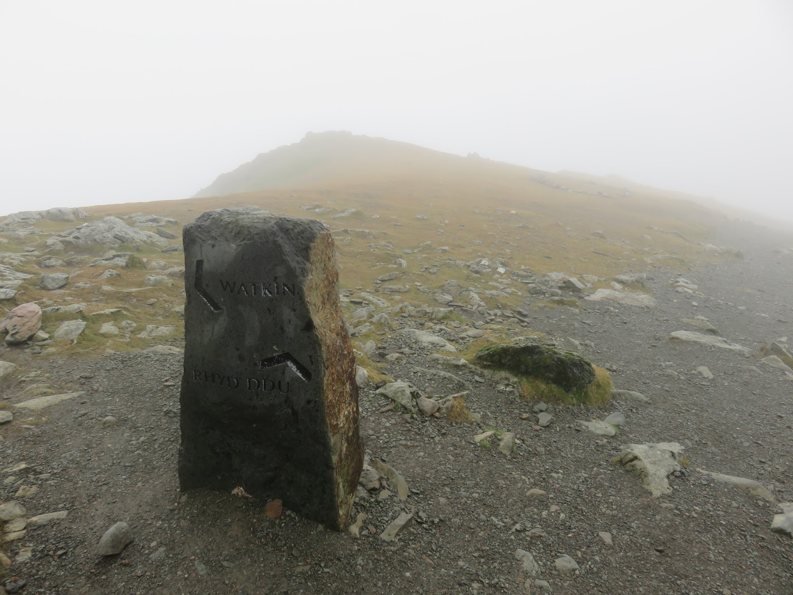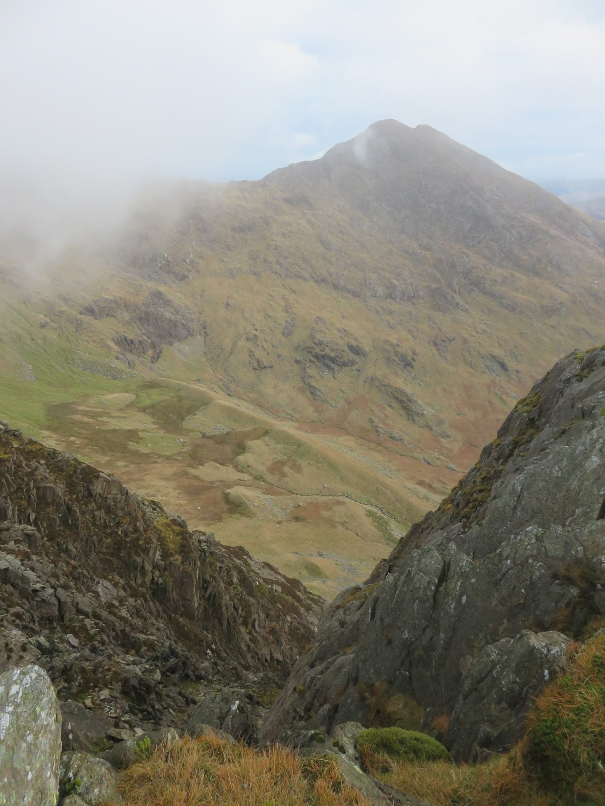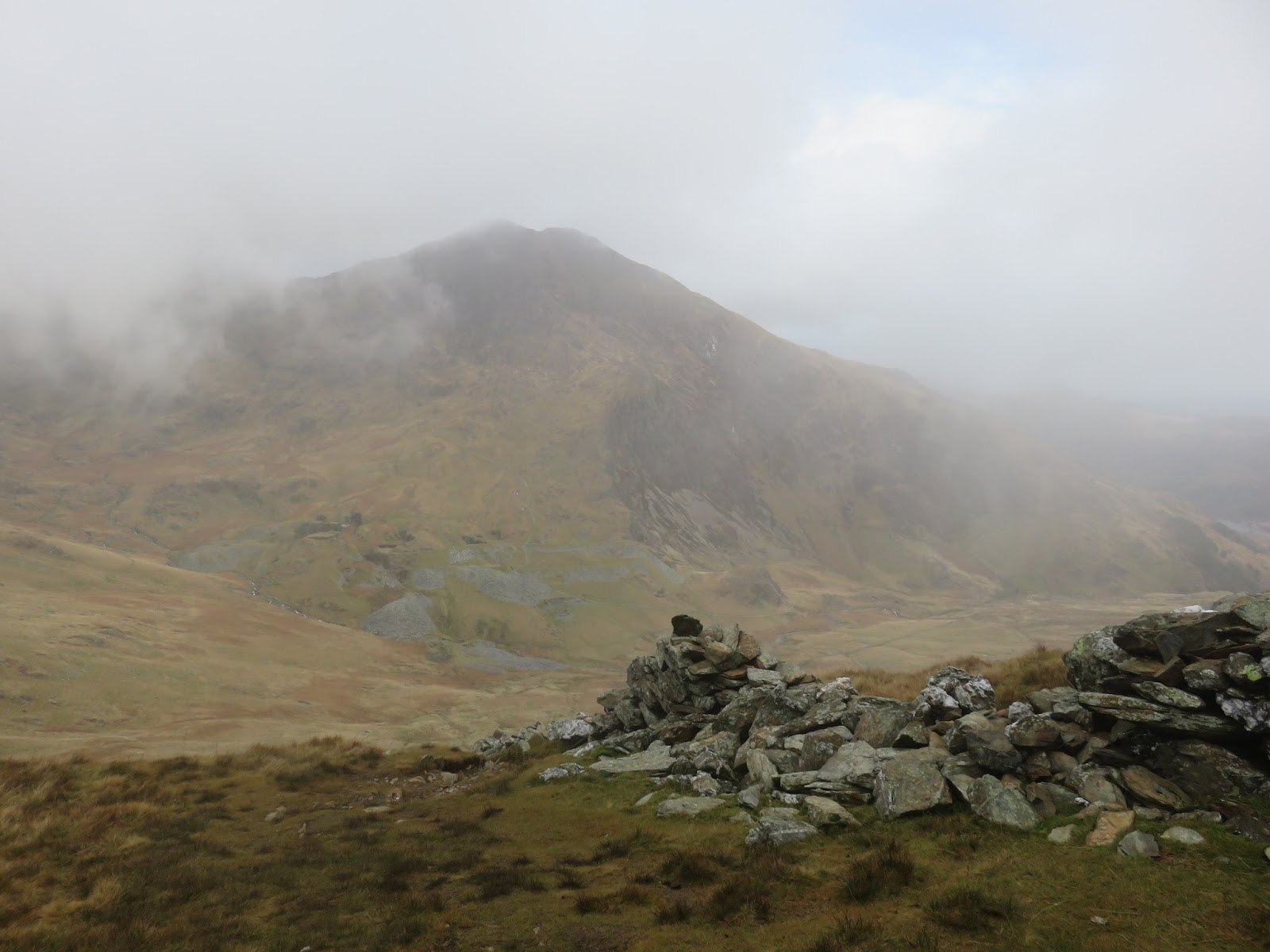 As it was early, I decided to make the climb up Yr Aran, which stands alone to the south of Snowdon. Clouds were swirling around the summit and it’s a pretty steep climb in places. The path follows a drystone wall to Yr Aran’s east ridge before turning at a right angle to gain the summit. No views today, so, it was quickly back down to the path and Bwlch Cwm Llan. All in all, the diversion to Yr Aran and back took me around an hour.