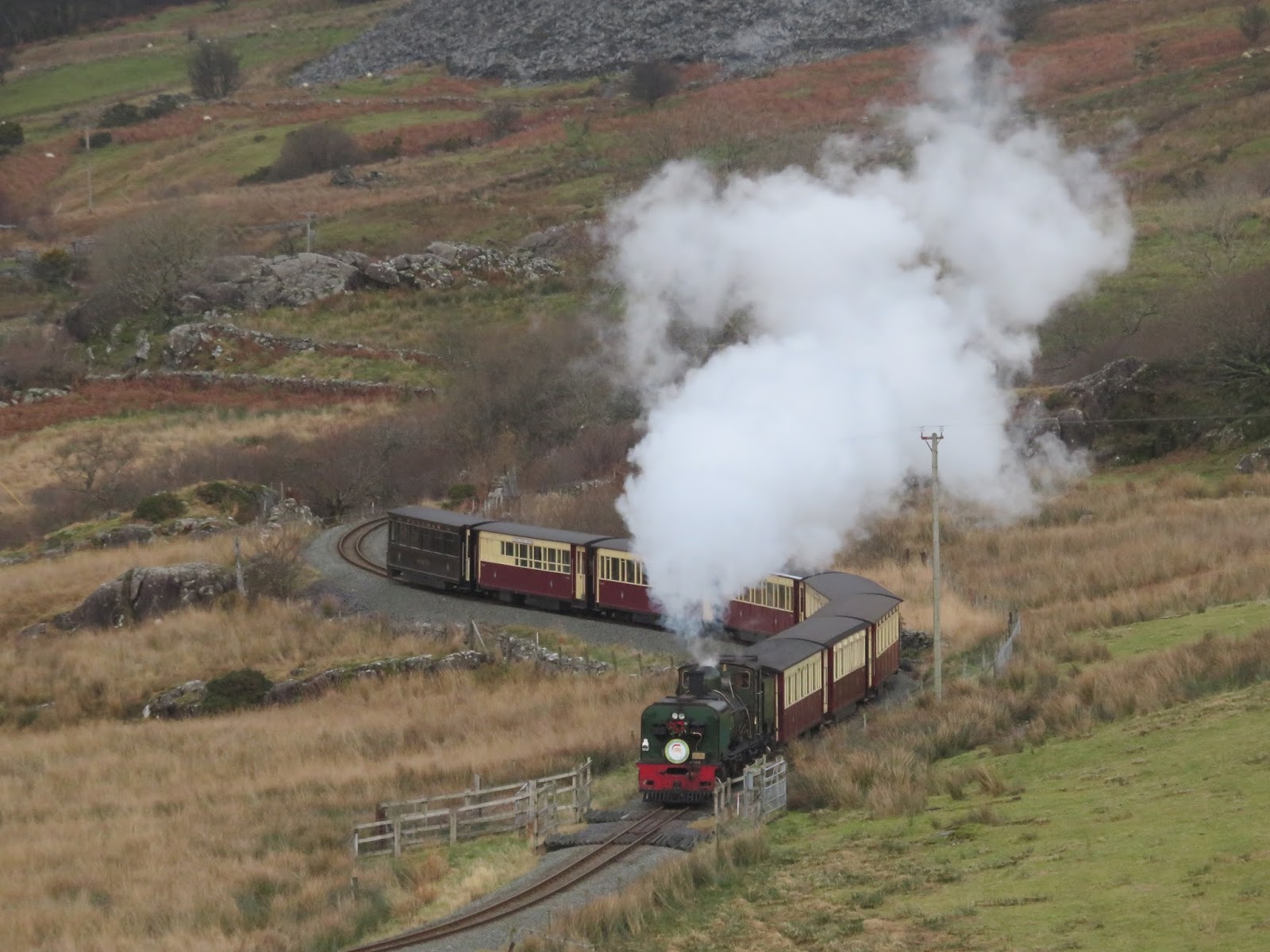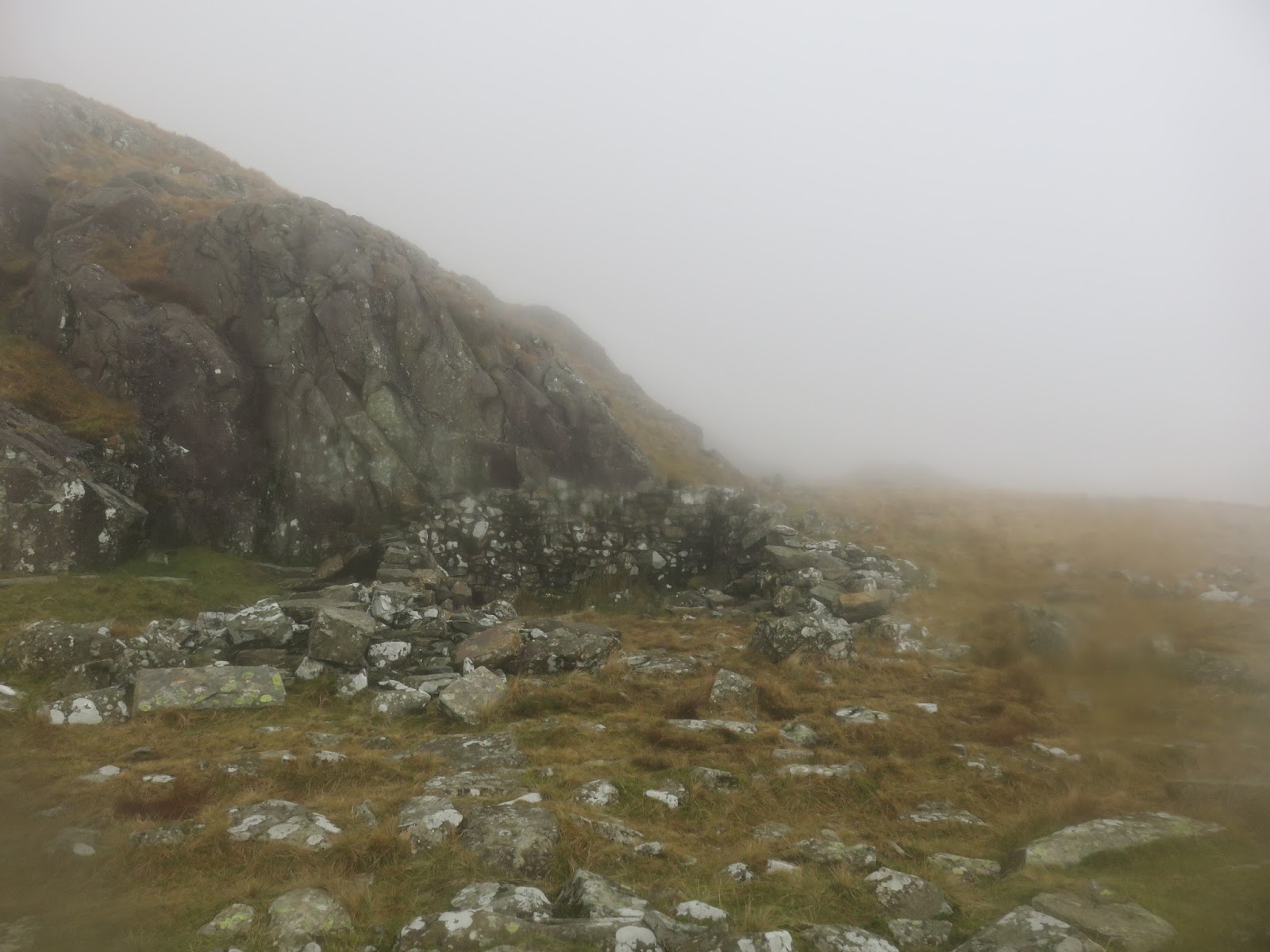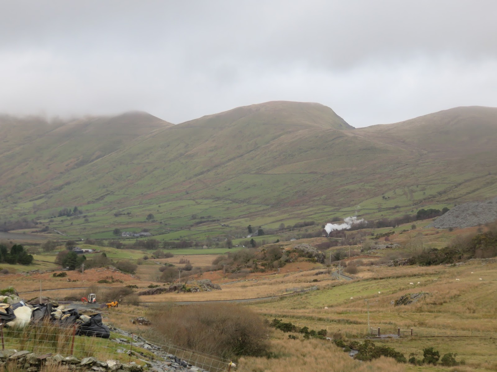 Descending still, the Rhyd-Ddu path crosses some largely monotonous terrain, especially in the cloud, however, it is easy to follow and falls at a pleasant gradient. I eventually found the bottom of the clouds, located around the small ruins at Rhos Boeth, a short distance from the crossroad of Pen ar Lôn. The return to the car was along the path I had climbed earlier in the day, leaving time to spy the Welsh Highland Railway as the train stopped at the station to turn around.
