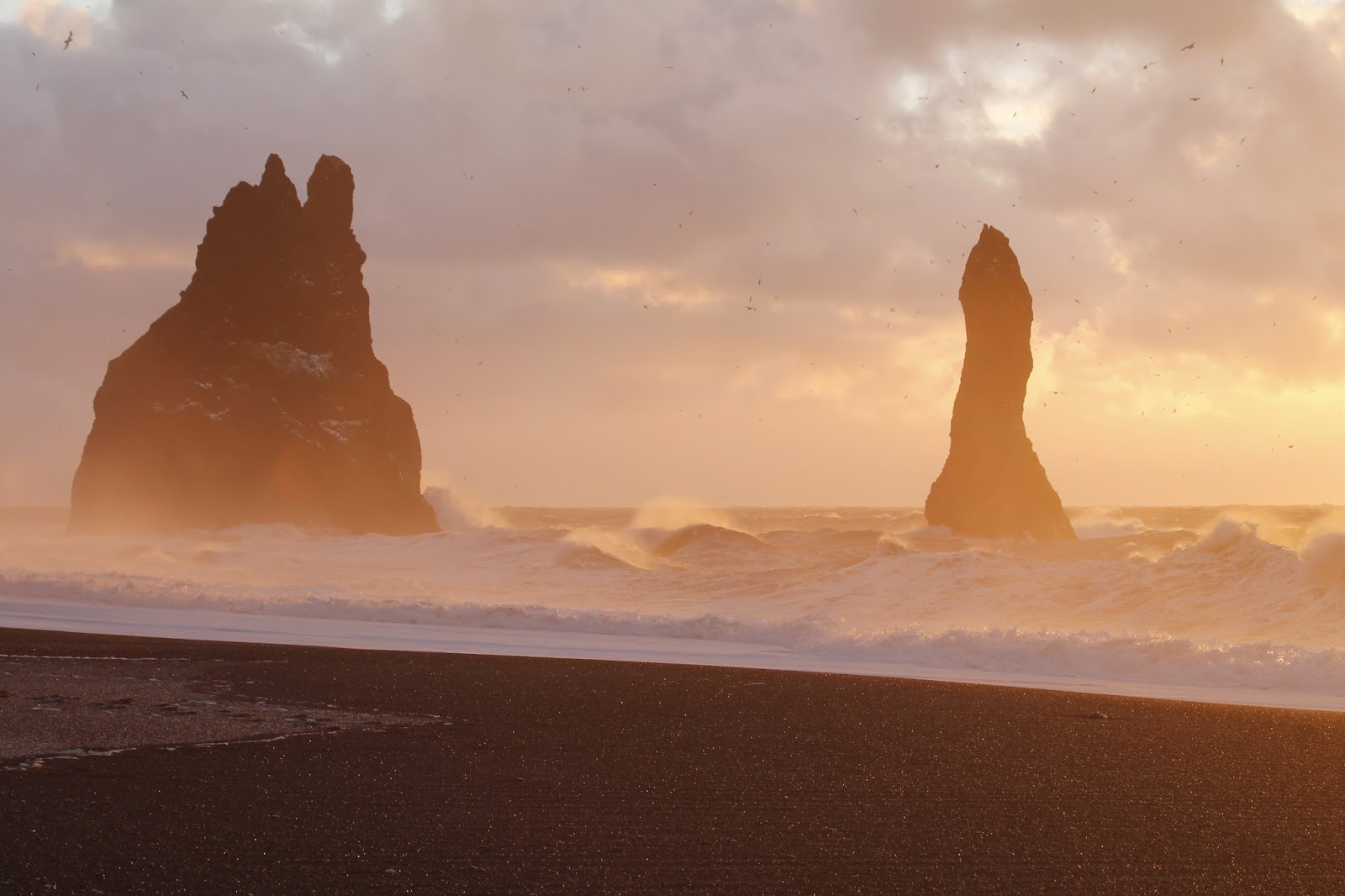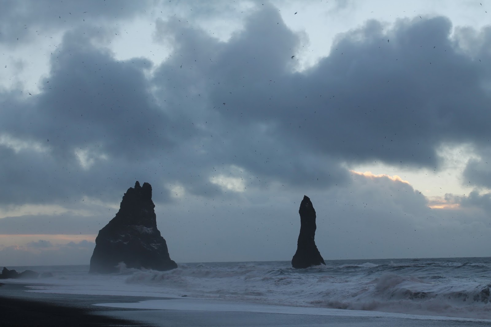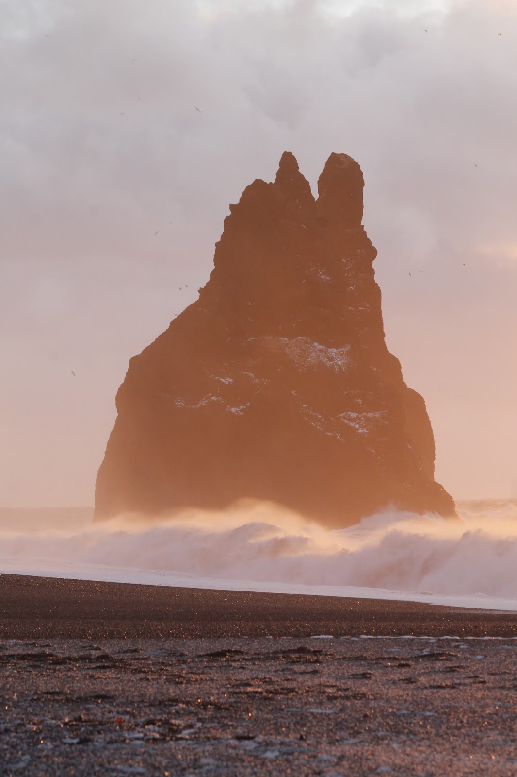 Our visit coincided with the sunrise which dramatically lit the restless sea and the eerie basalt sea stacks of Reynisdrangar which stand a short distance off shore.