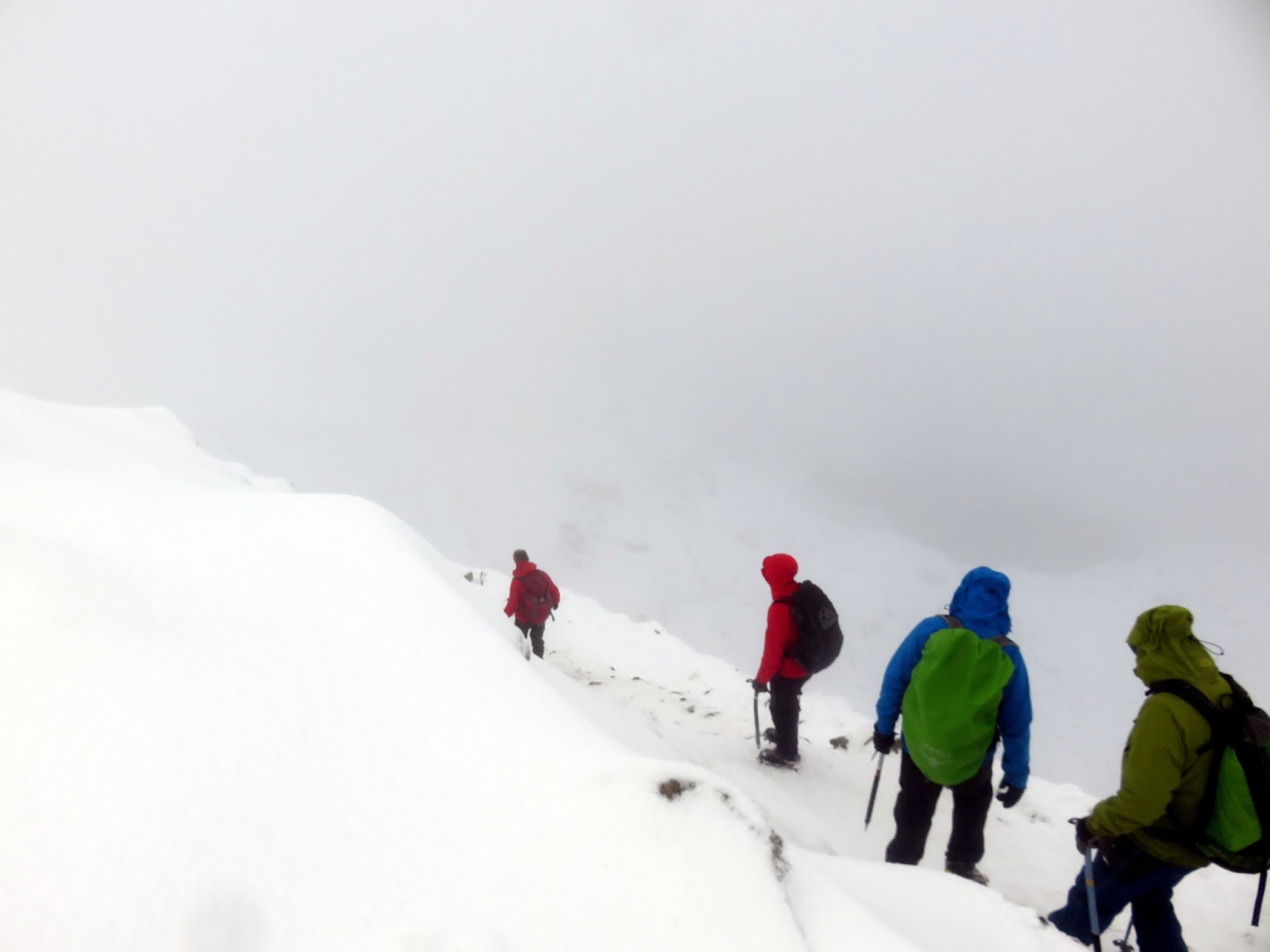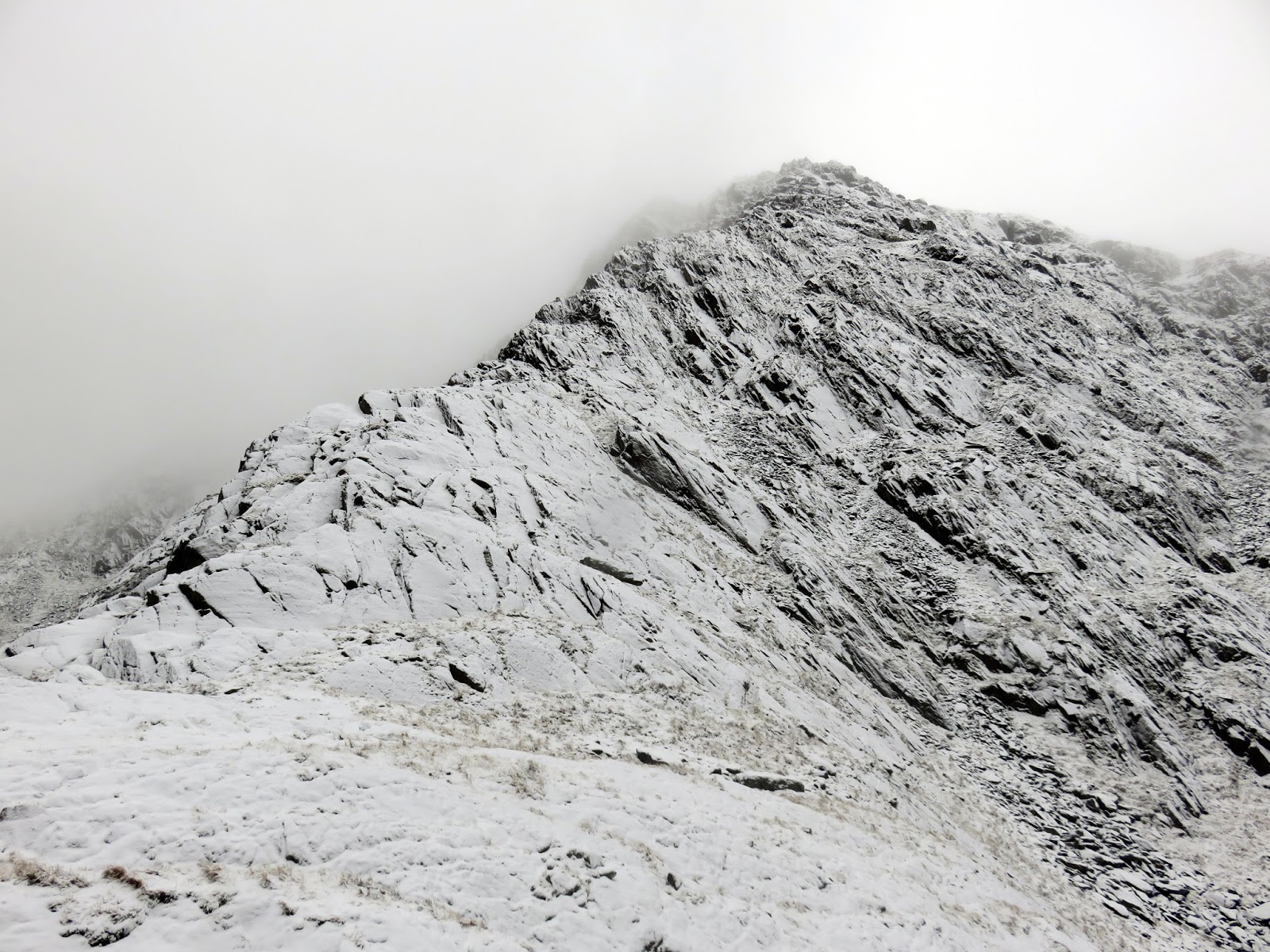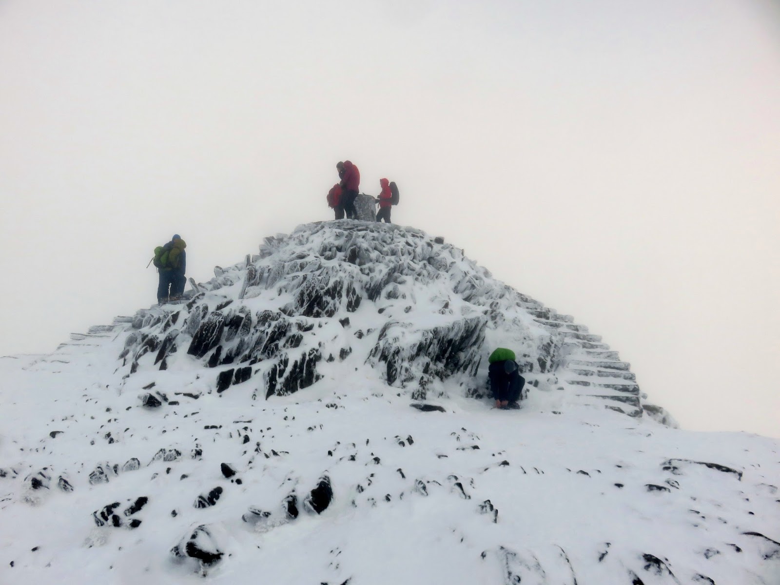 By the time we had reached Bwlch y Saethau, between Y Lliwedd and Snowdon, it had stopped snowing but the clouds stubbornly refused to lift. After donning our crampons and having a bite to eat, we spent the next hour or so making the final climb directly to the summit, up the steep slope above Clogwyn y Garnedd, rather than following the Watkin Path.