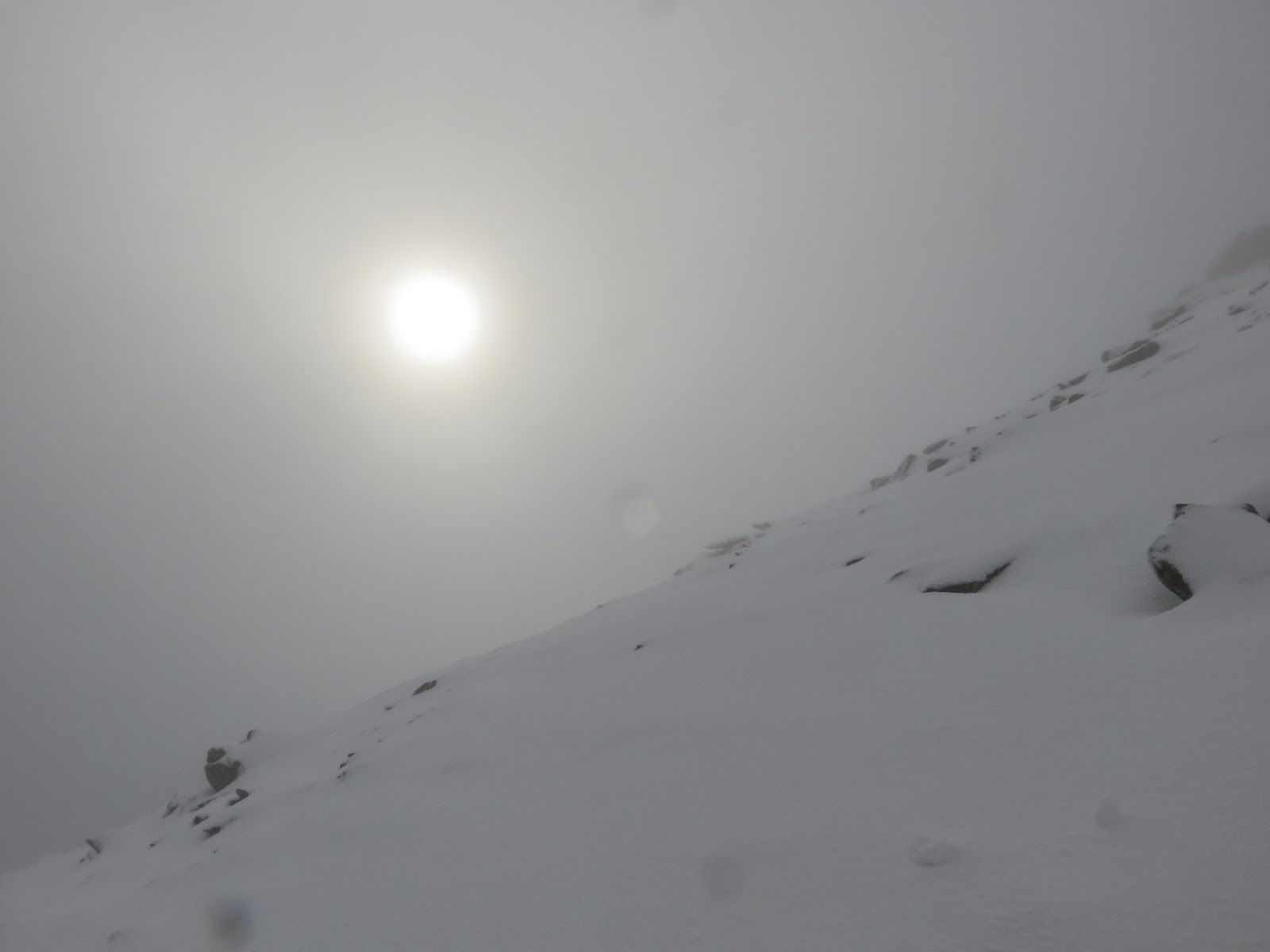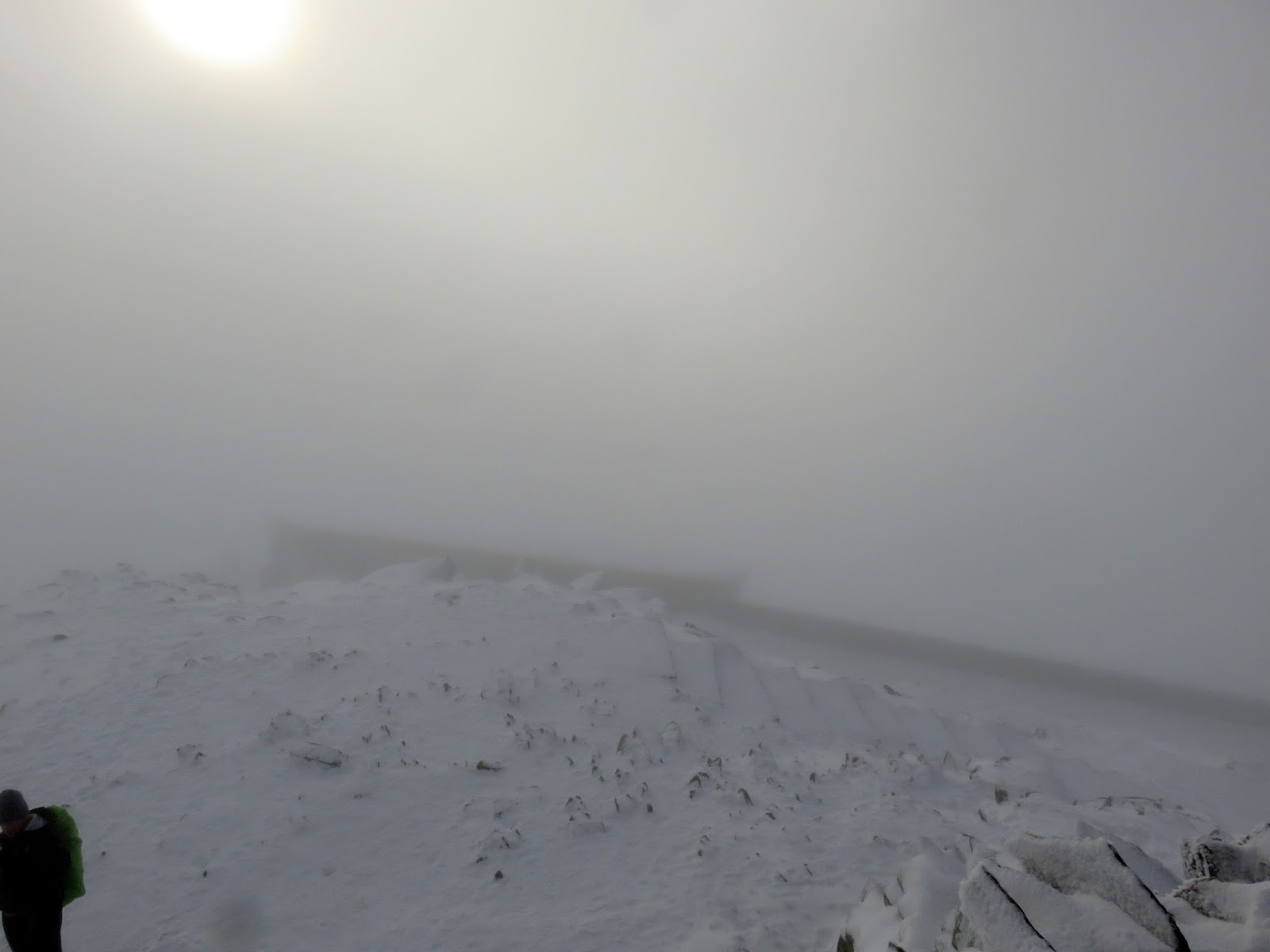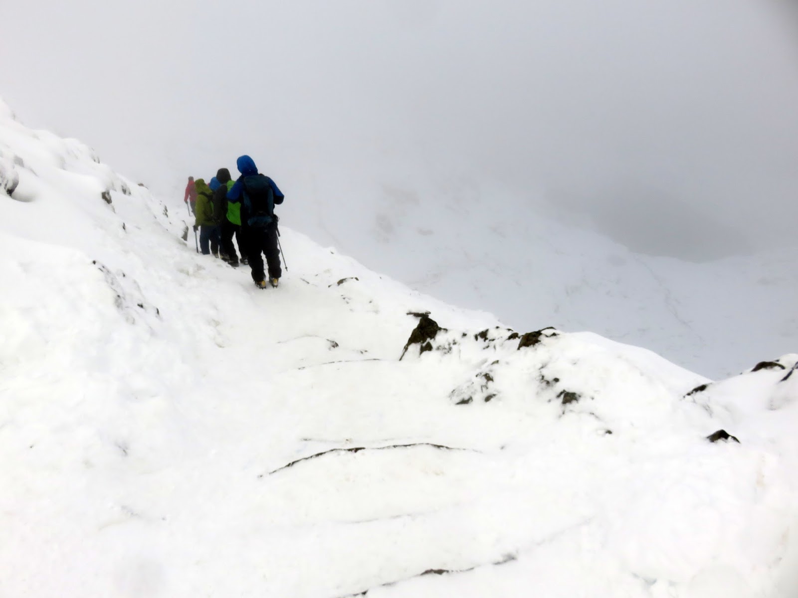 By the time we had reached Bwlch y Saethau, between Y Lliwedd and Snowdon, it had stopped snowing but the clouds stubbornly refused to lift. After donning our crampons and having a bite to eat, we spent the next hour or so making the final climb directly to the summit, up the steep slope above Clogwyn y Garnedd, rather than following the Watkin Path.