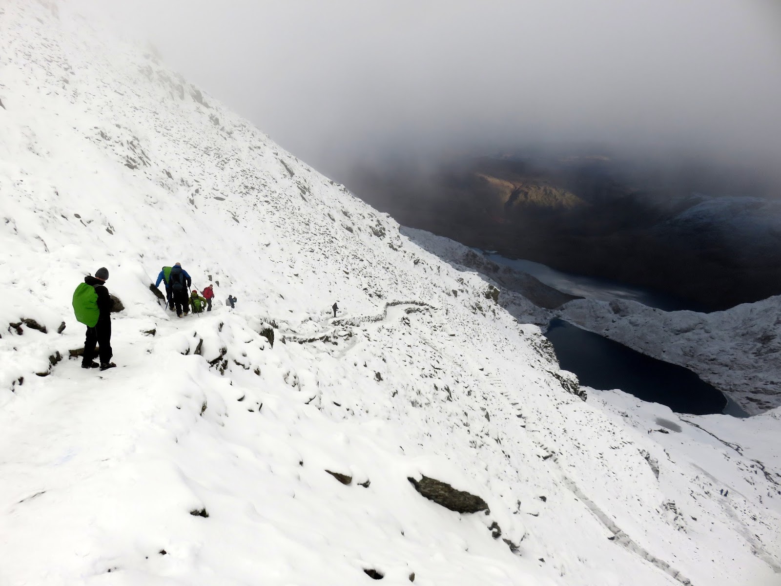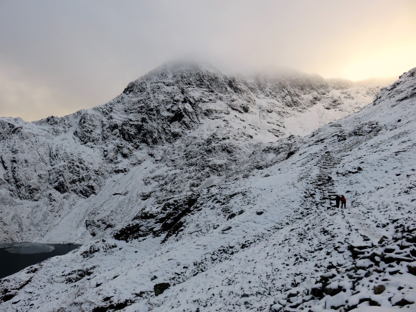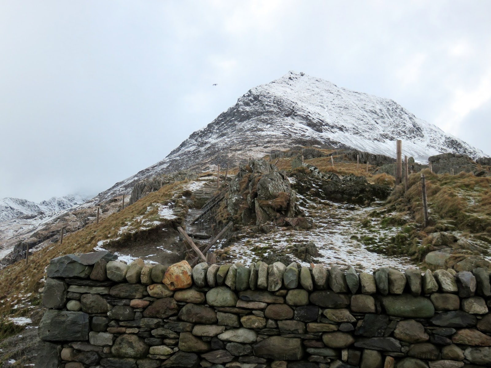 We followed the Pyg Track down beneath the slopes of Crib Goch until the path became suitably snow-free as to stop and remove our winter equipment. The Pyg Track remains high above Llyn Llydaw to reach the twin stile at Bwlch y Moch (pass of the pigs) which is one of the possible sources of the Pyg Track’s name (though it’s generally regarded to come from the Pen y Gwyrd Hotel).
