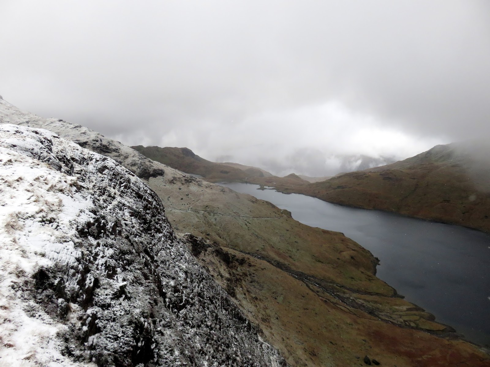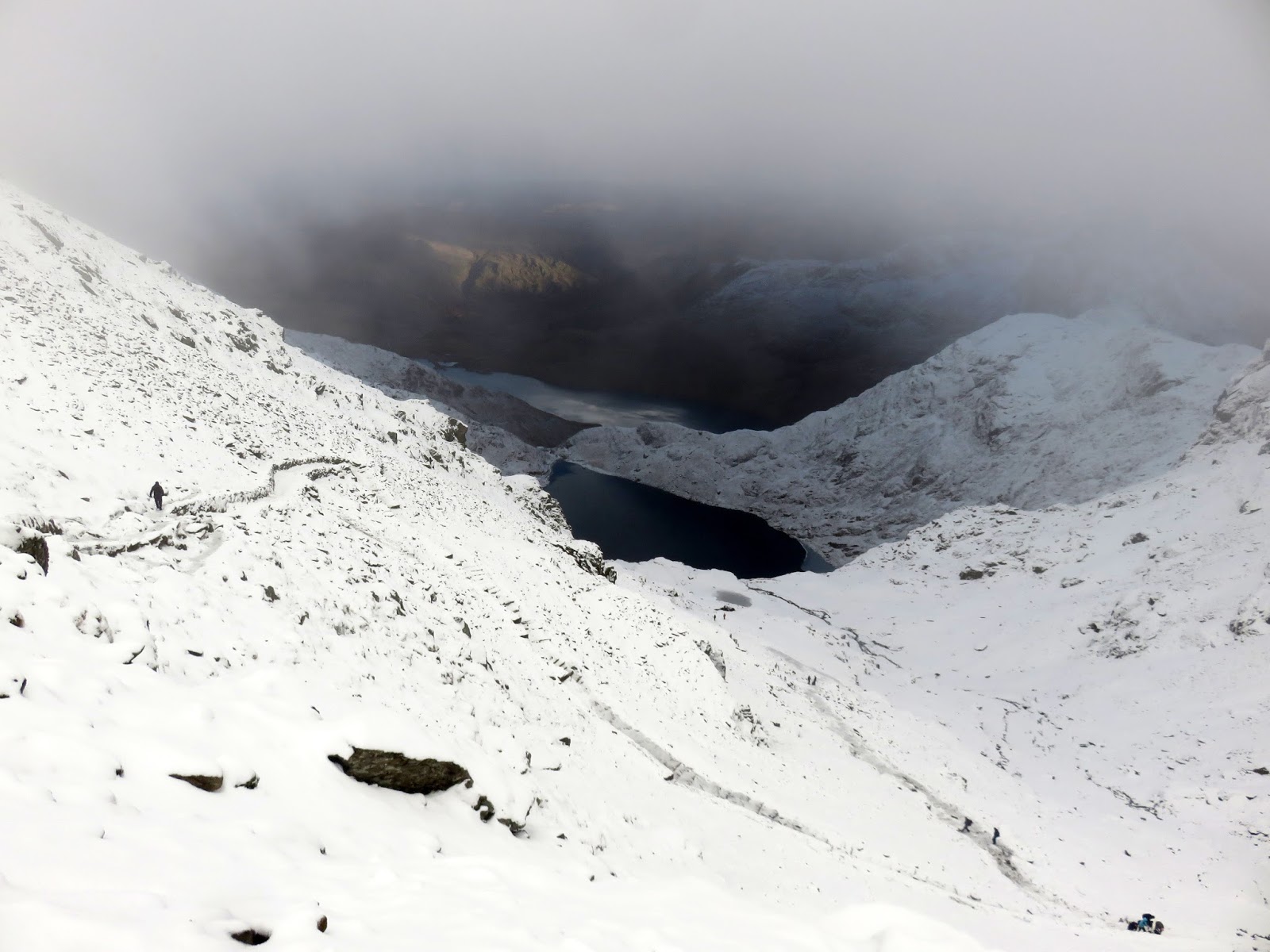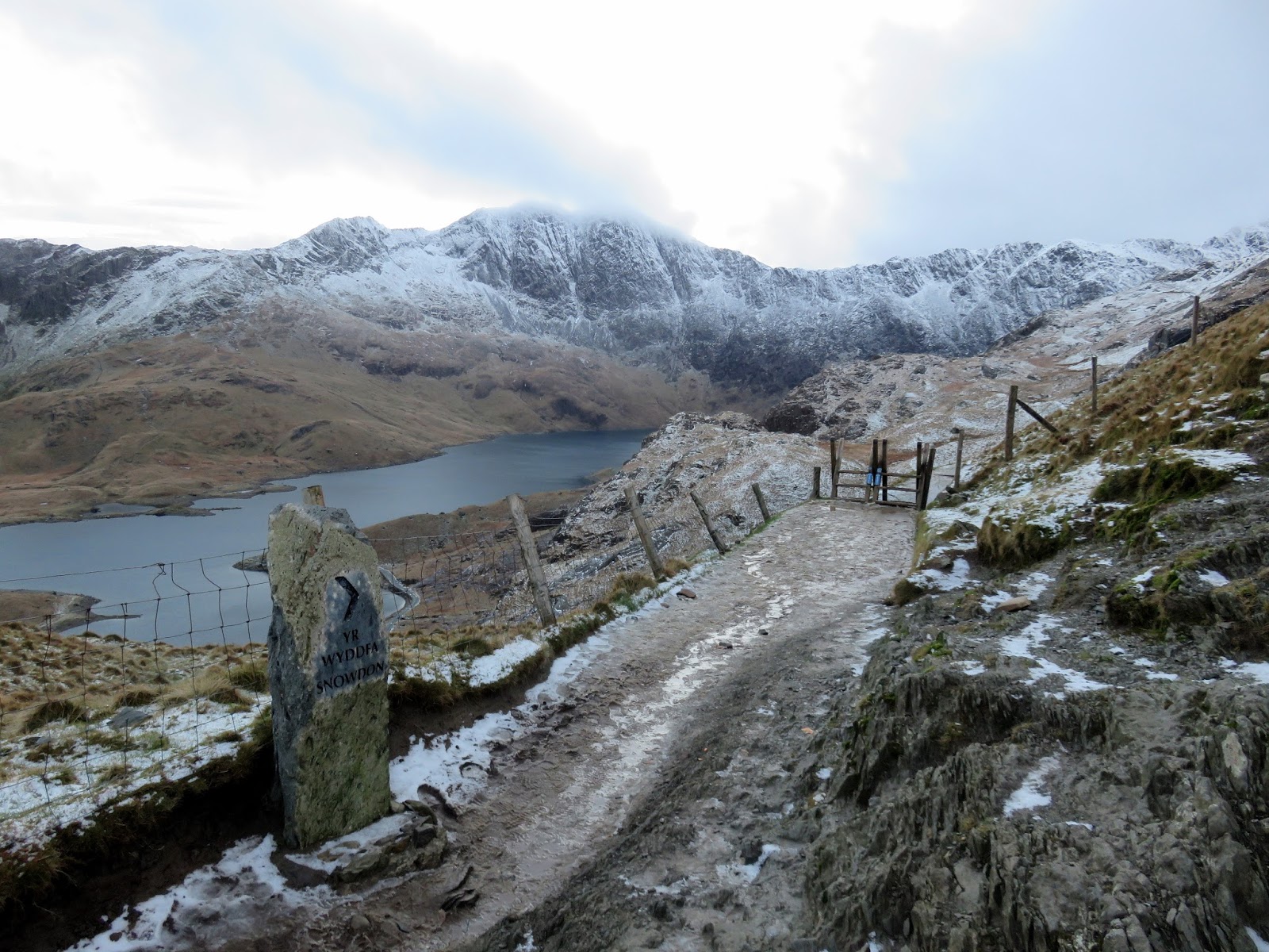 We followed the Pyg Track down beneath the slopes of Crib Goch until the path became suitably snow-free as to stop and remove our winter equipment. The Pyg Track remains high above Llyn Llydaw to reach the twin stile at Bwlch y Moch (pass of the pigs) which is one of the possible sources of the Pyg Track’s name (though it’s generally regarded to come from the Pen y Gwyrd Hotel).