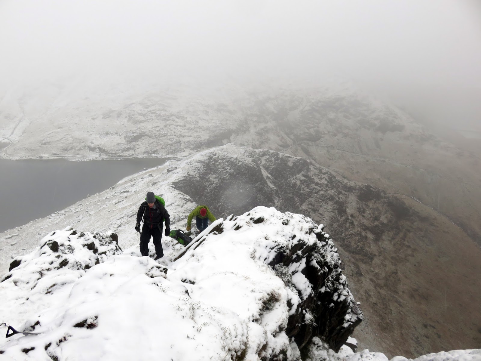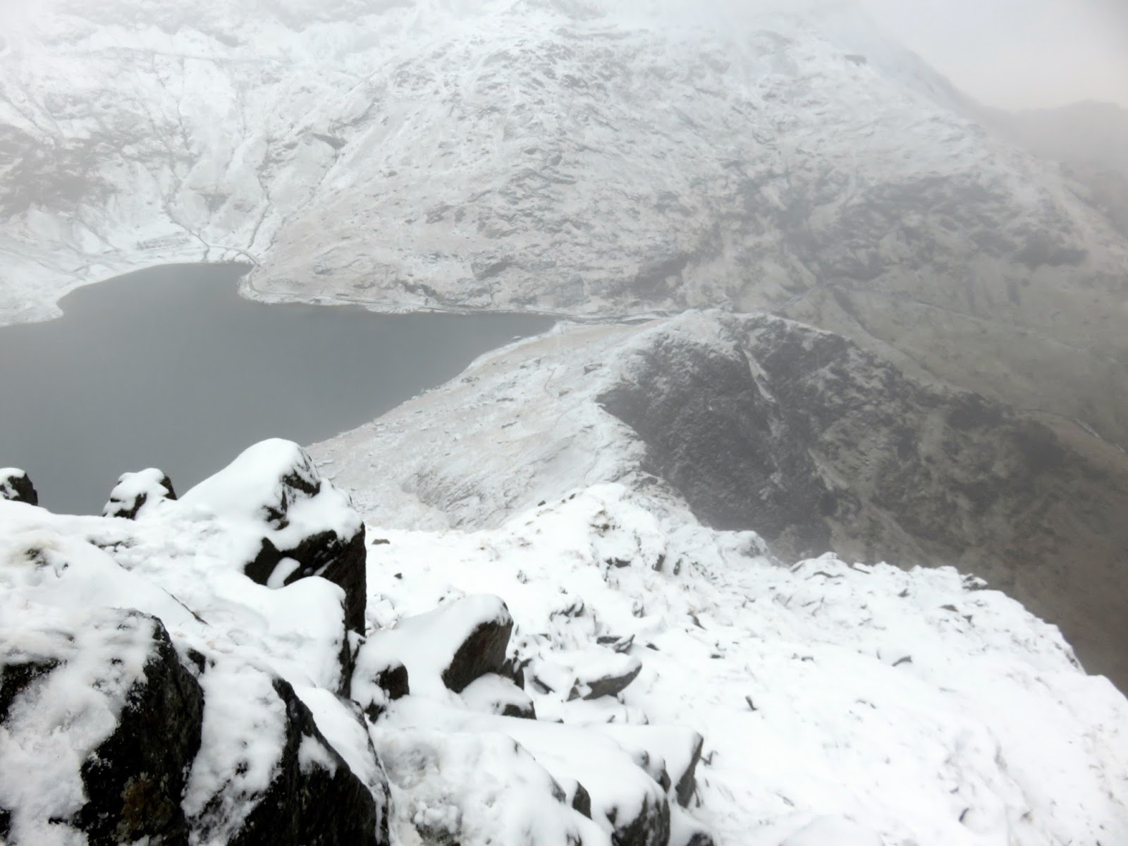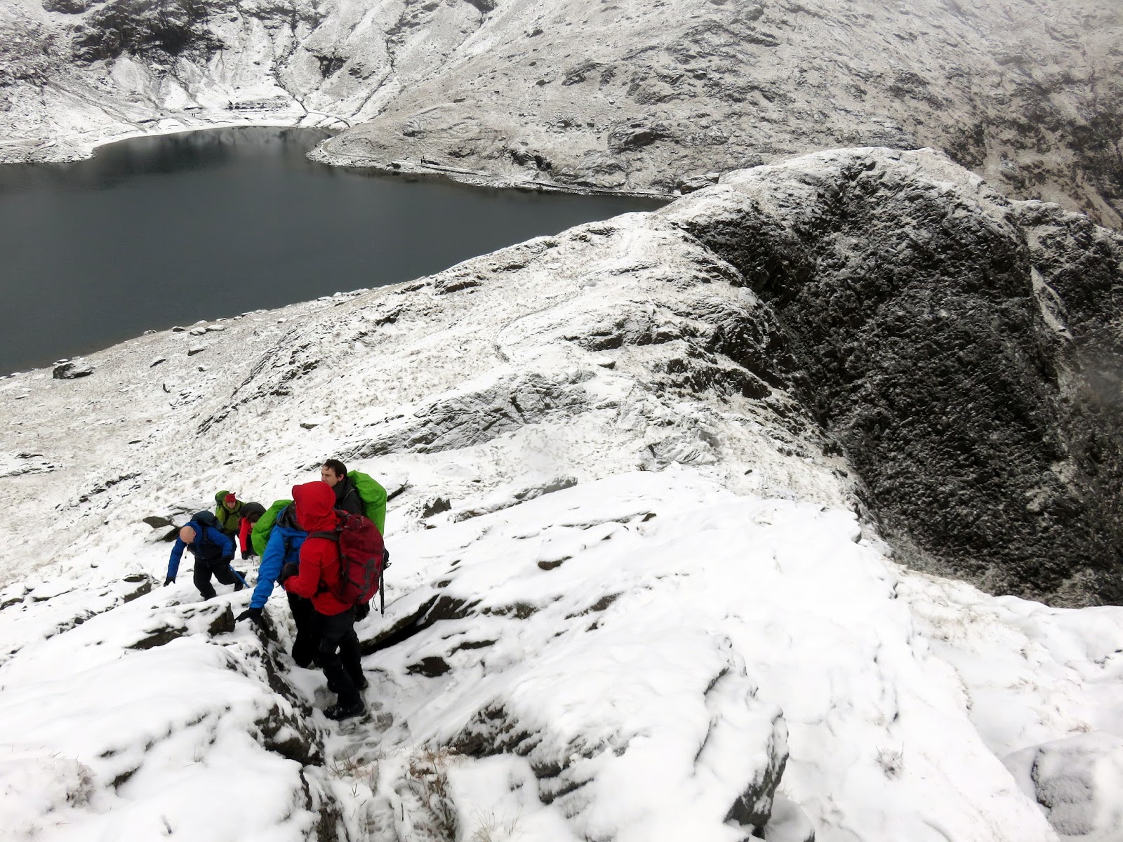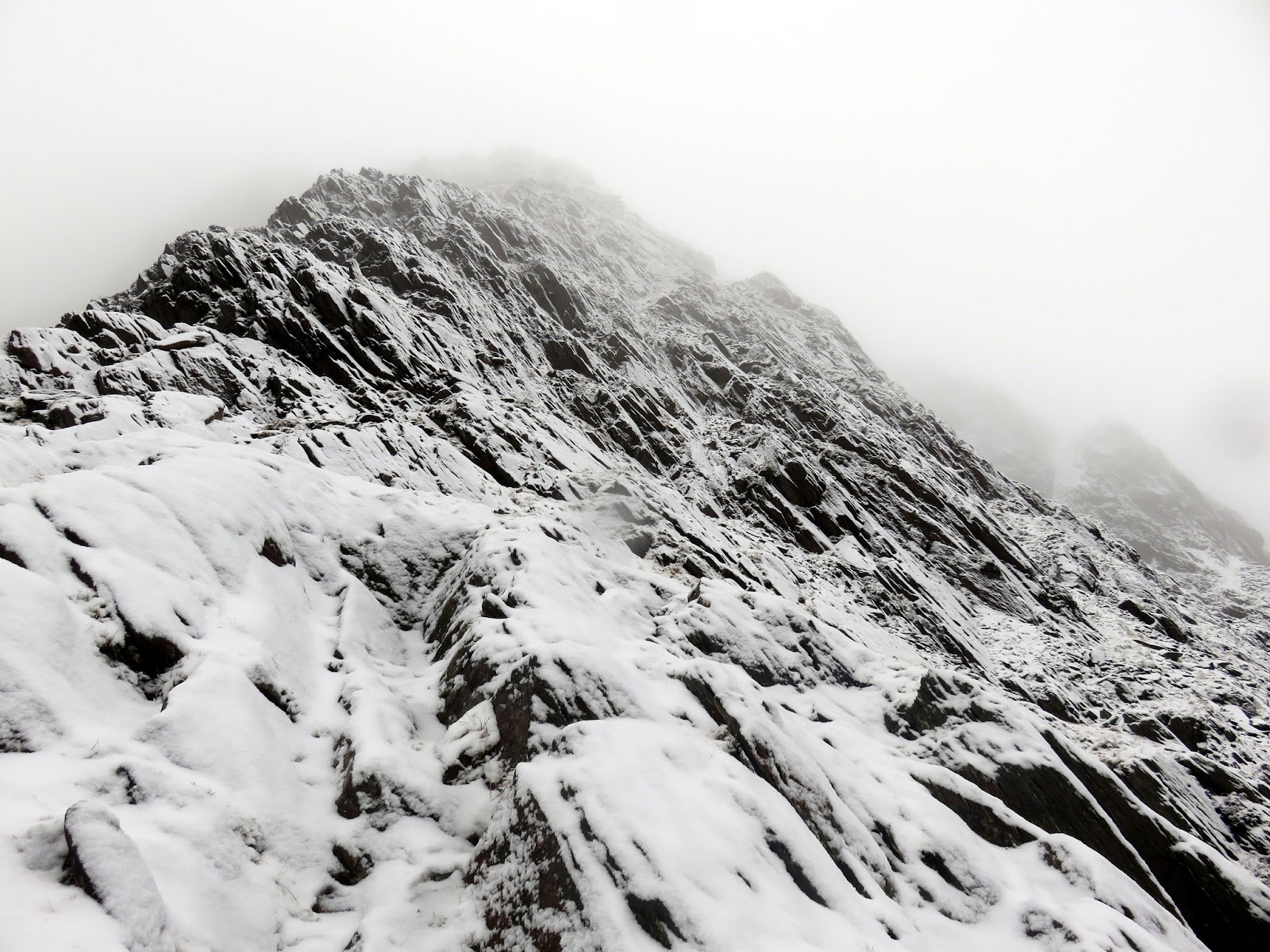 With the rain turning to snow, we left the Miner’s Track at Glaslyn to start making our way up Y Gribin which climbs some 200m up to Bwlch y Saethau. With fresh, slippery snow underfoot it was slow going but we made it in one piece. Y Gribin is probably best compared to Tryfan’s north ridge, lots of big blocks and a few tricky little scrambles but nothing that should put off a confident walker.
