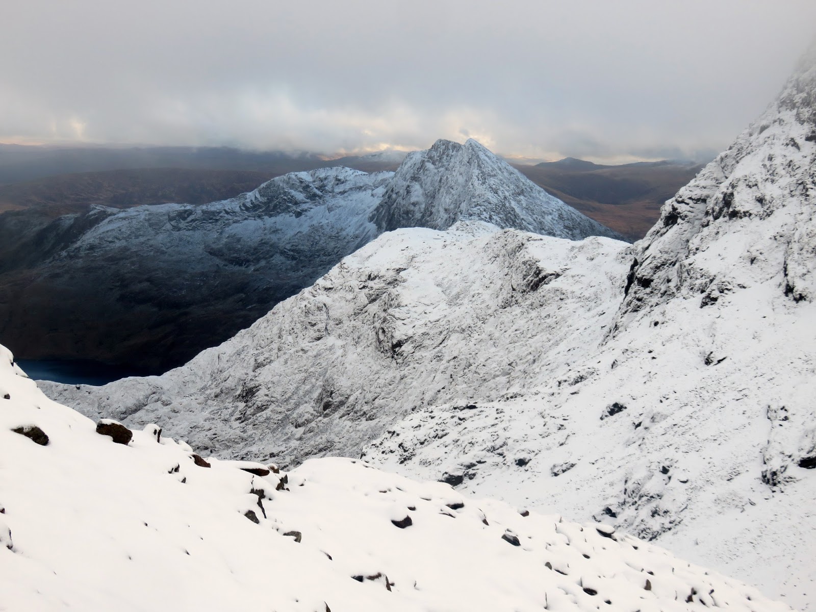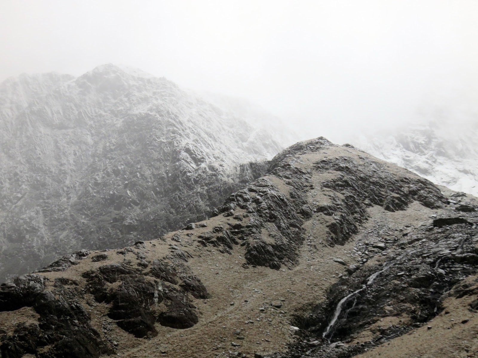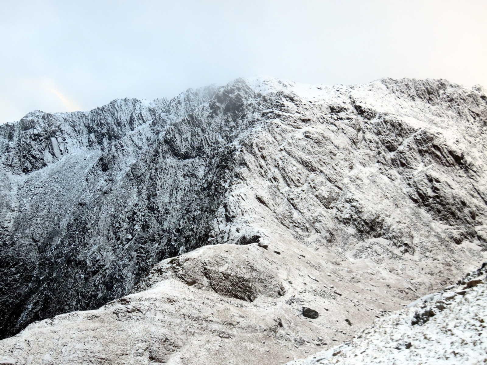 With the rain turning to snow, we left the Miner’s Track at Glaslyn to start making our way up Y Gribin which climbs some 200m up to Bwlch y Saethau. With fresh, slippery snow underfoot it was slow going but we made it in one piece. Y Gribin is probably best compared to Tryfan’s north ridge, lots of big blocks and a few tricky little scrambles but nothing that should put off a confident walker.