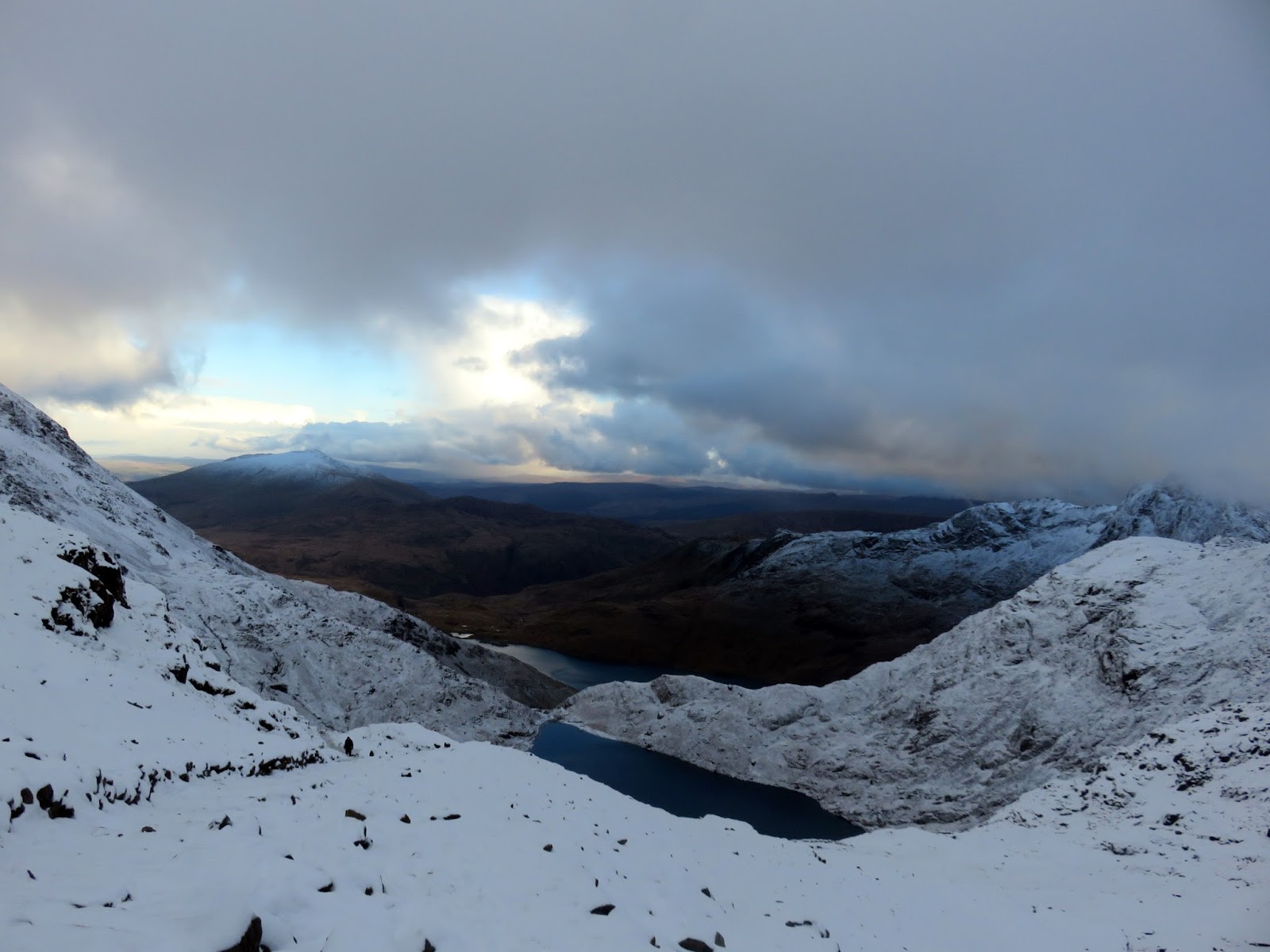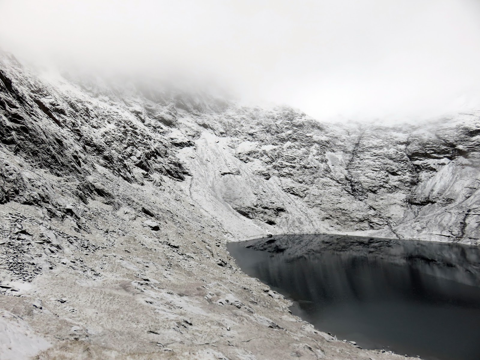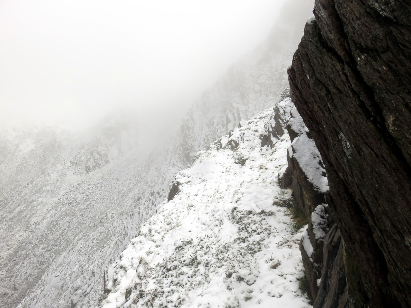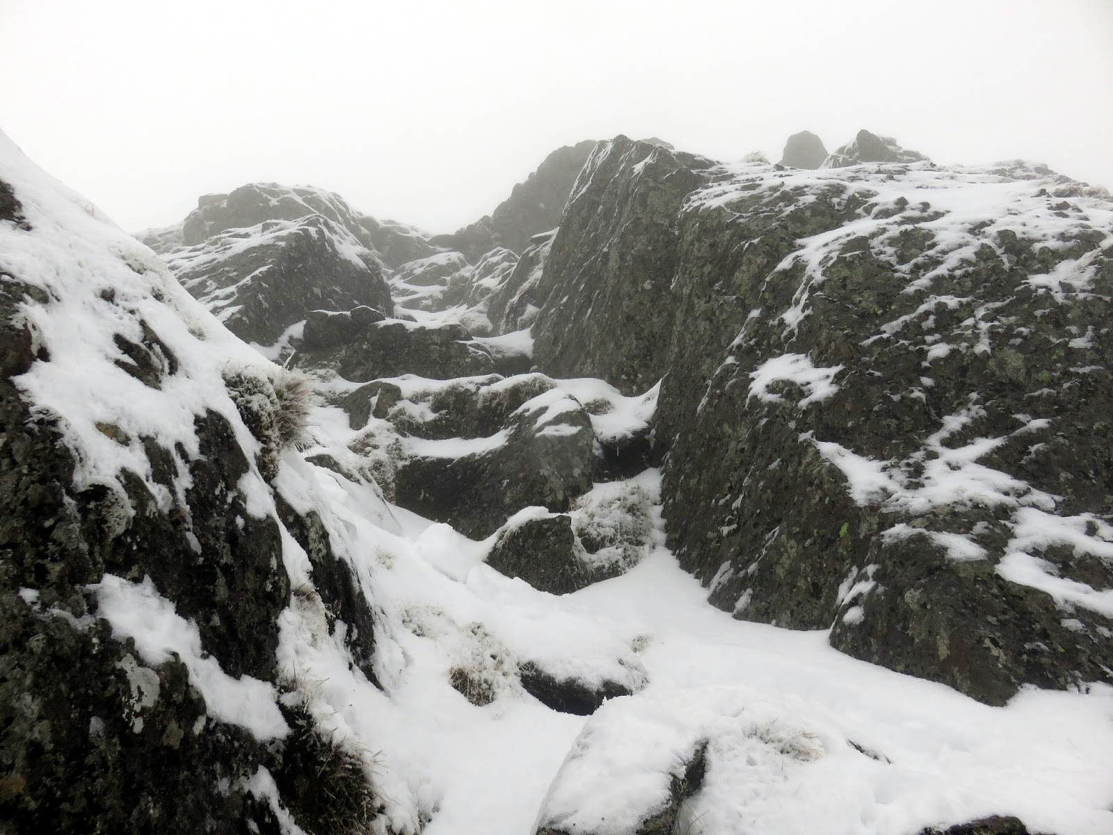 With the rain turning to snow, we left the Miner’s Track at Glaslyn to start making our way up Y Gribin which climbs some 200m up to Bwlch y Saethau. With fresh, slippery snow underfoot it was slow going but we made it in one piece. Y Gribin is probably best compared to Tryfan’s north ridge, lots of big blocks and a few tricky little scrambles but nothing that should put off a confident walker.