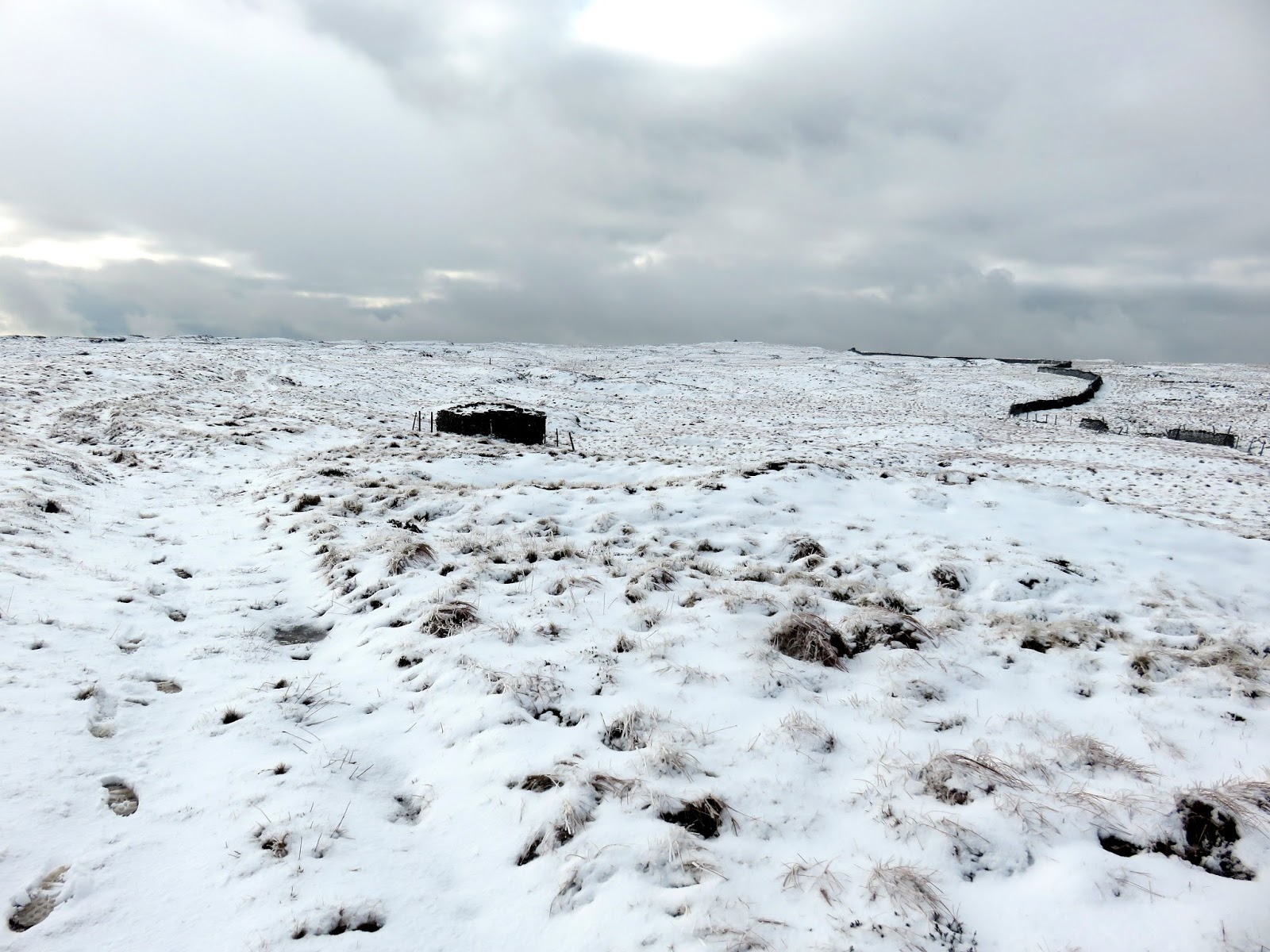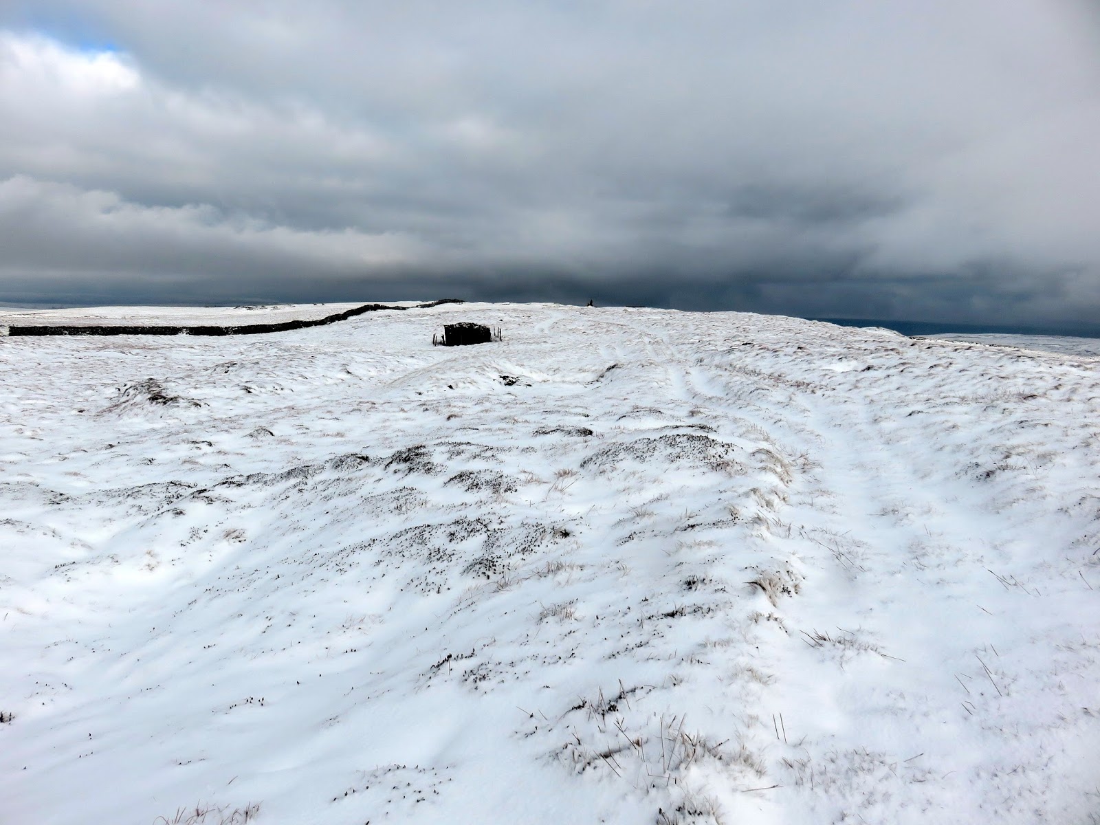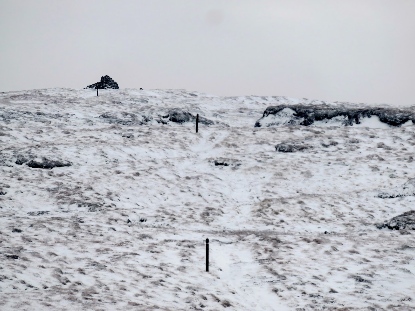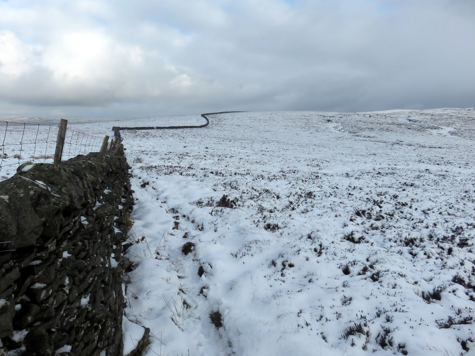I followed a drystone wall much of the way until I decided to cut a corner and head for Darnbrook’s summit. In hindsight, following the wall would have taken me to the summit anyway but the area lies on a separate map sheet to the one I was carrying so I wasn’t sure. The kilometre or so of walking through snow covered heather was challenging, to say the least.