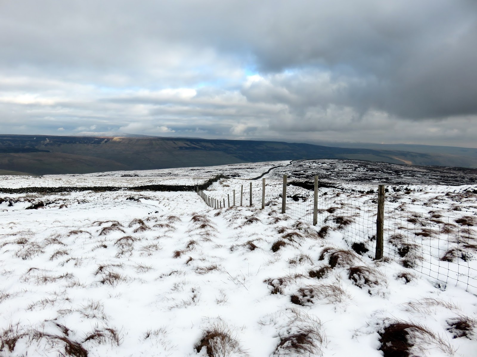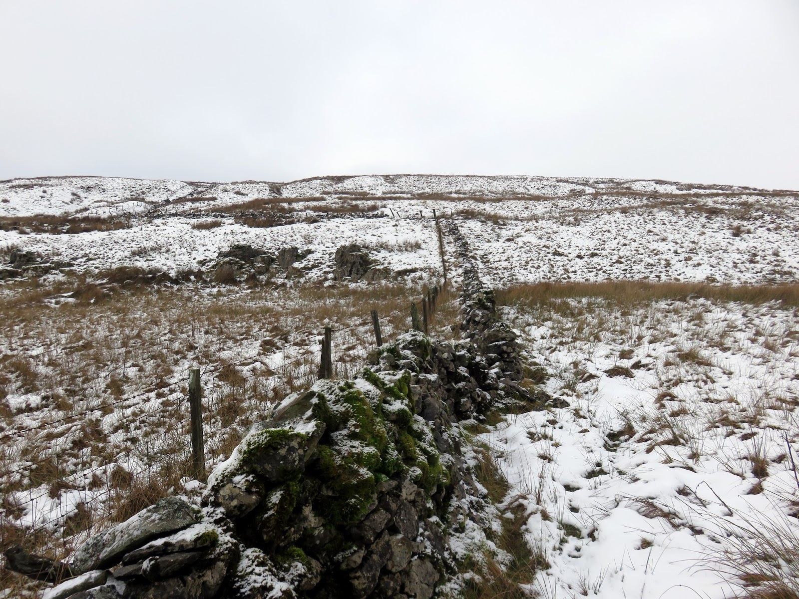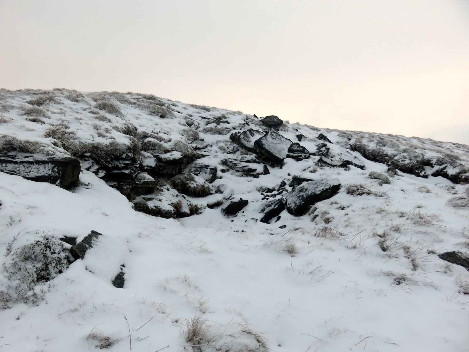 I followed a drystone wall much of the way until I decided to cut a corner and head for Darnbrook’s summit. In hindsight, following the wall would have taken me to the summit anyway but the area lies on a separate map sheet to the one I was carrying so I wasn’t sure. The kilometre or so of walking through snow covered heather was challenging, to say the least.