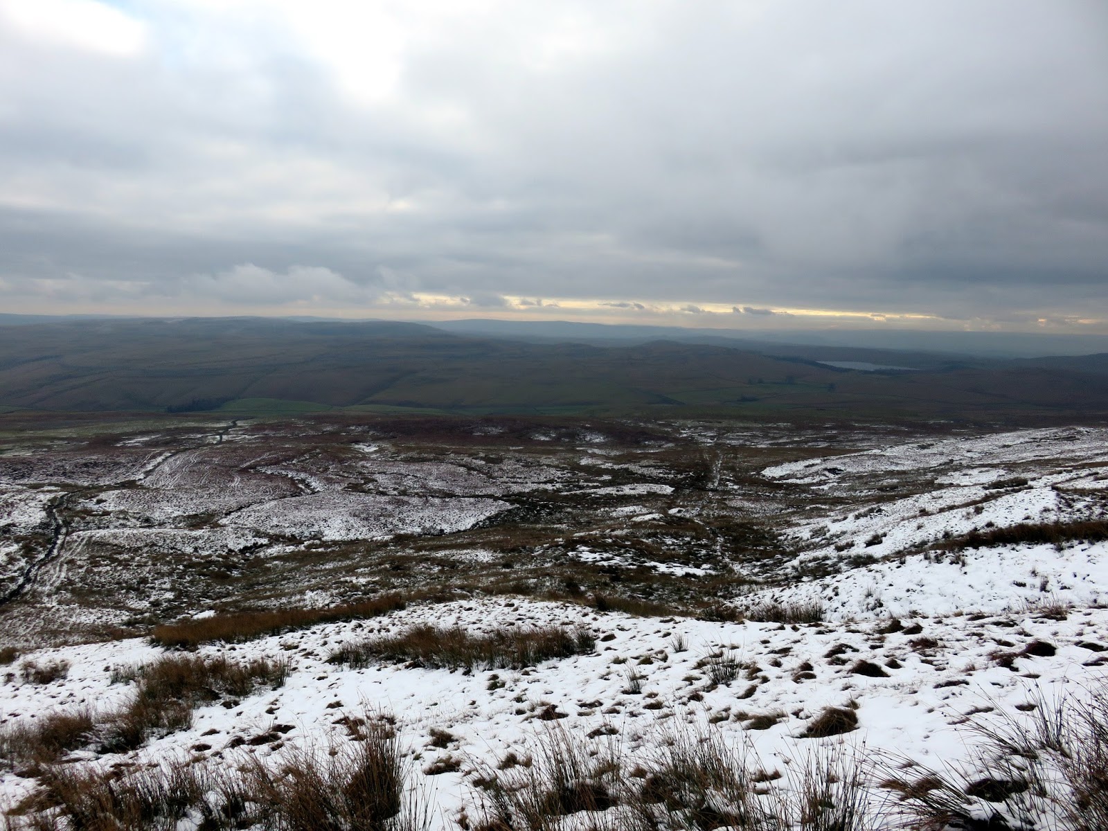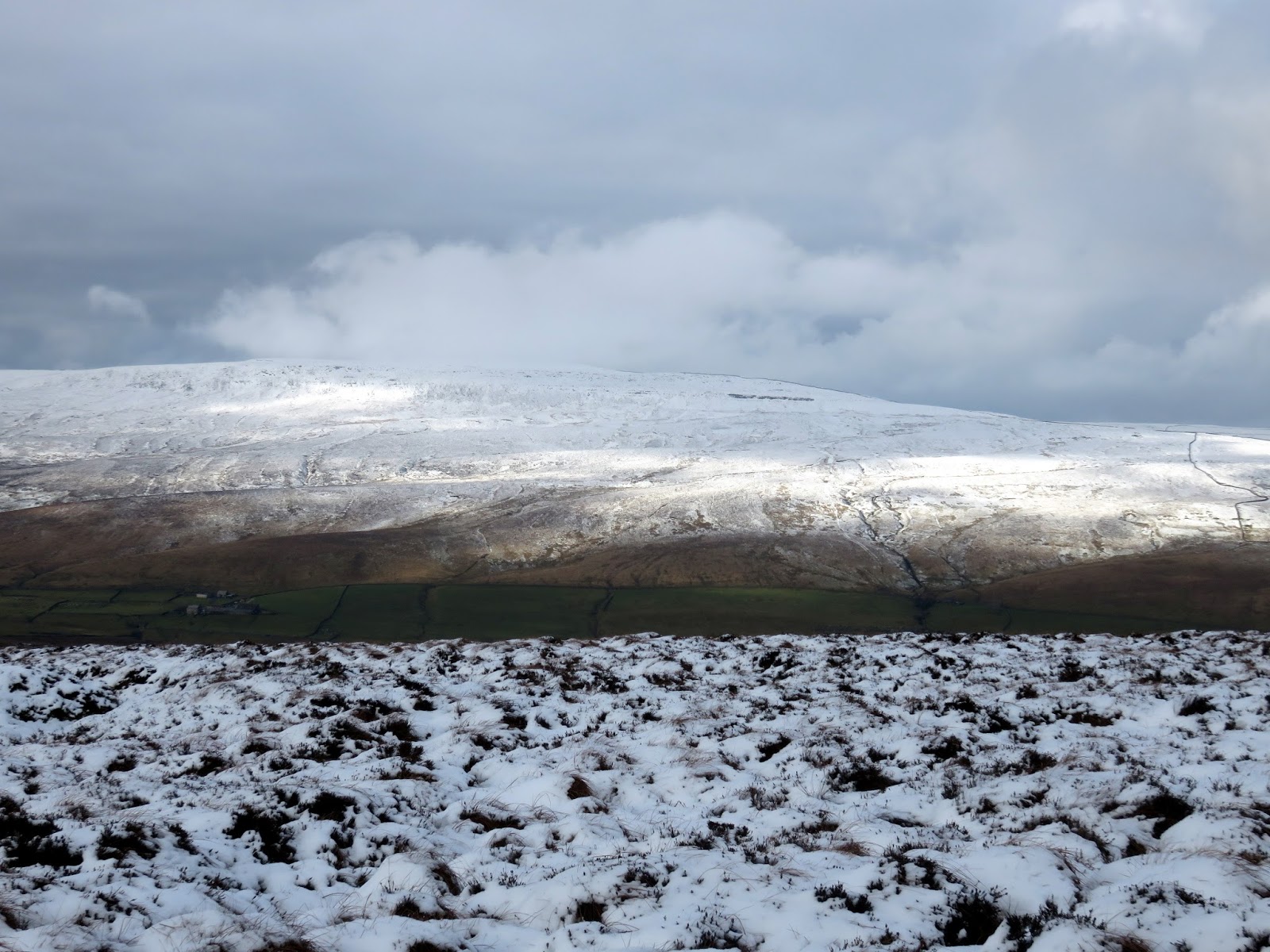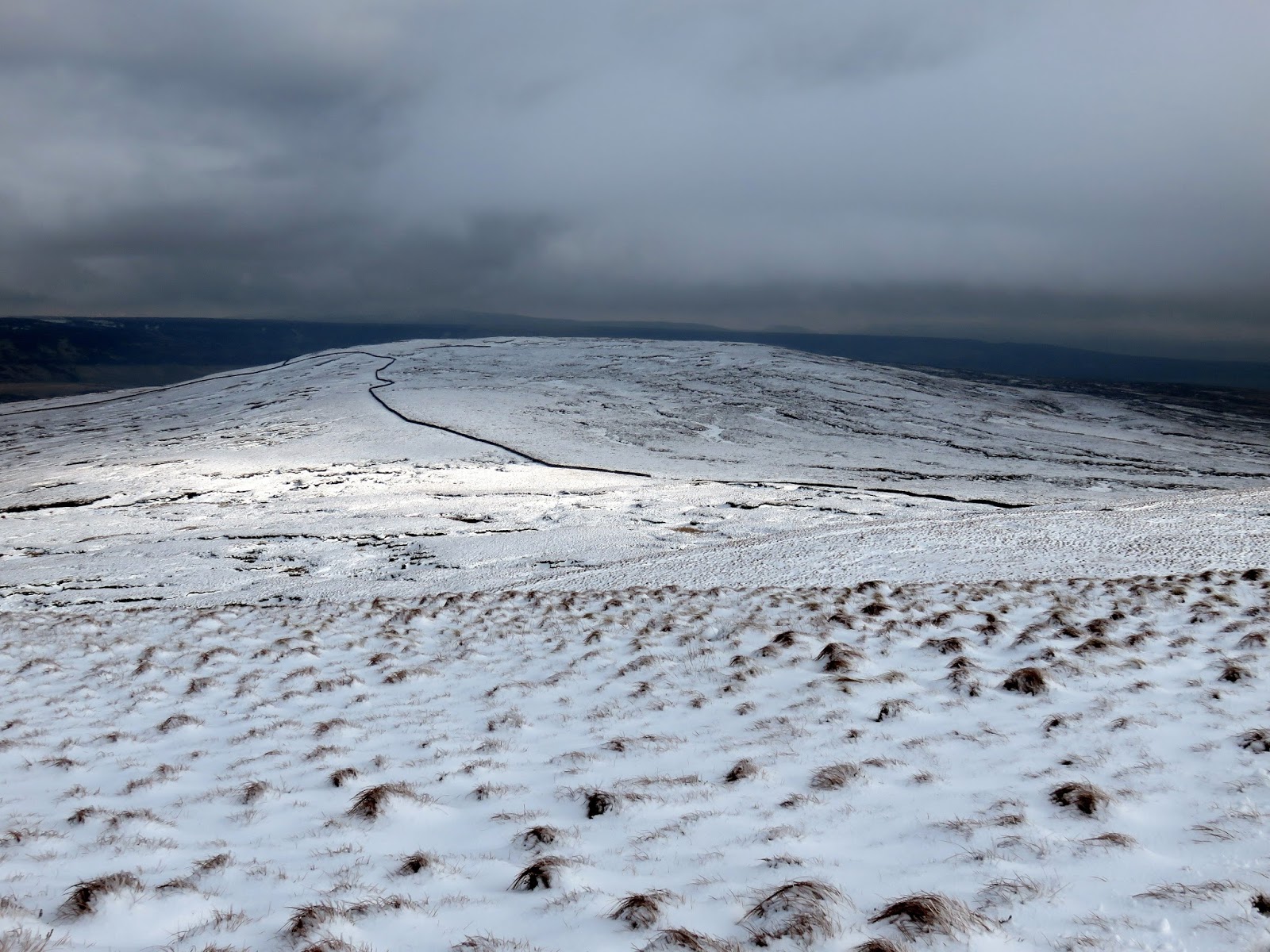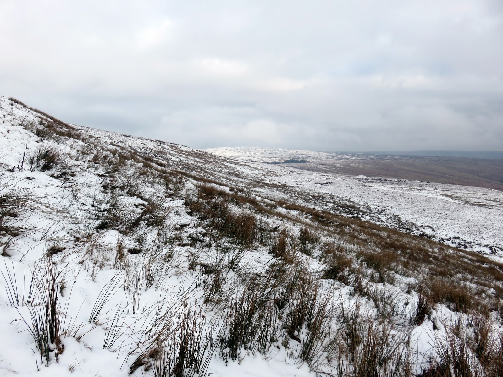 I followed a drystone wall much of the way until I decided to cut a corner and head for Darnbrook’s summit. In hindsight, following the wall would have taken me to the summit anyway but the area lies on a separate map sheet to the one I was carrying so I wasn’t sure. The kilometre or so of walking through snow covered heather was challenging, to say the least.