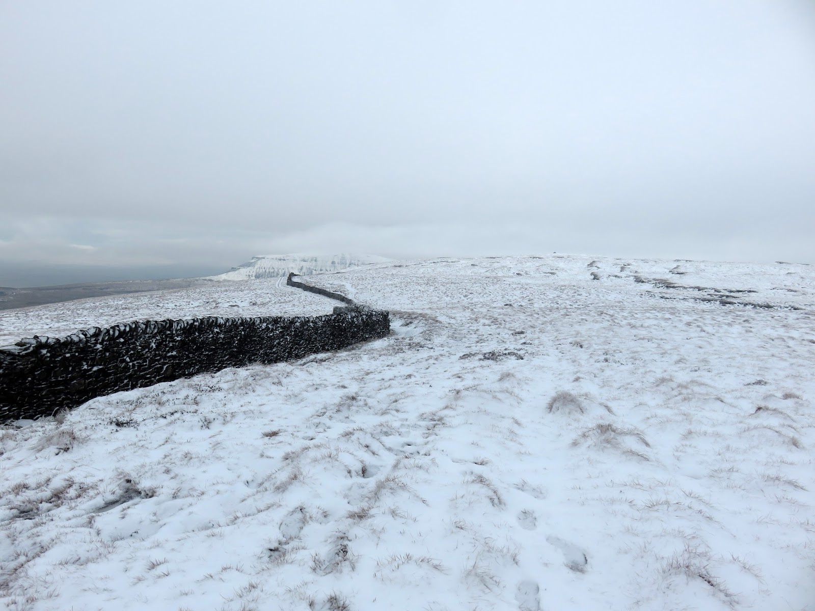 There are two main summits on Fountains Fell, the summit proper and a second, southerly top, which I’d be visiting first. The Pennine Way heads through the yard of Tennant Gill Farm before climbing the fellside, reaching the snowline after a short distance. At Tennant Gill, I diverted away from the Pennine Way to make a direct ascent of the slope following the line of a drystone wall and the gill itself. This would be the steepest climb of the day but would gain the ridge of the fell.