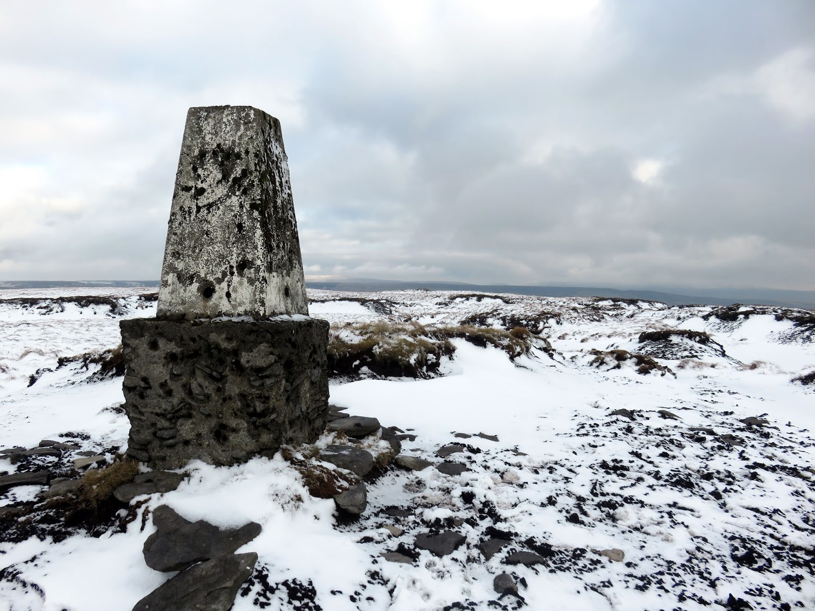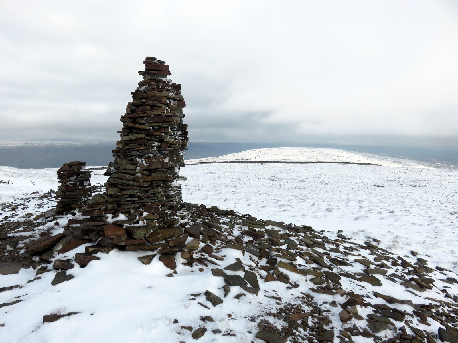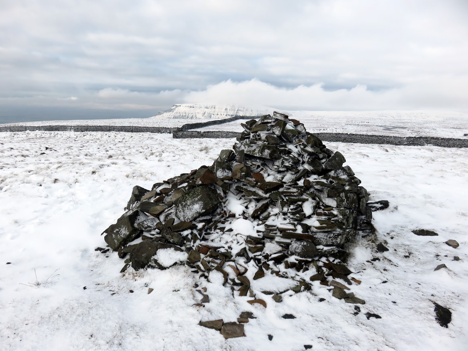 The summit is marked by a much larger cairn though views are a bit limited due to the wide plateau of the moor. The name Fountains derives from ownership of the land in the 13th century by the monks of Fountains Abbey who used it for sheep grazing and used to walk long distances to various pastures across this area of the Yorkshire Dales. Nowadays, the Pennine Way crosses the fell a short distance from the summit – the locating marked by a thin, elegant cairn. From here, the route would follow the ridge line to Darnbrook. Given the covering of snow, I have no idea if a path exists along this section but, in clear weather, the objective is obvious.
