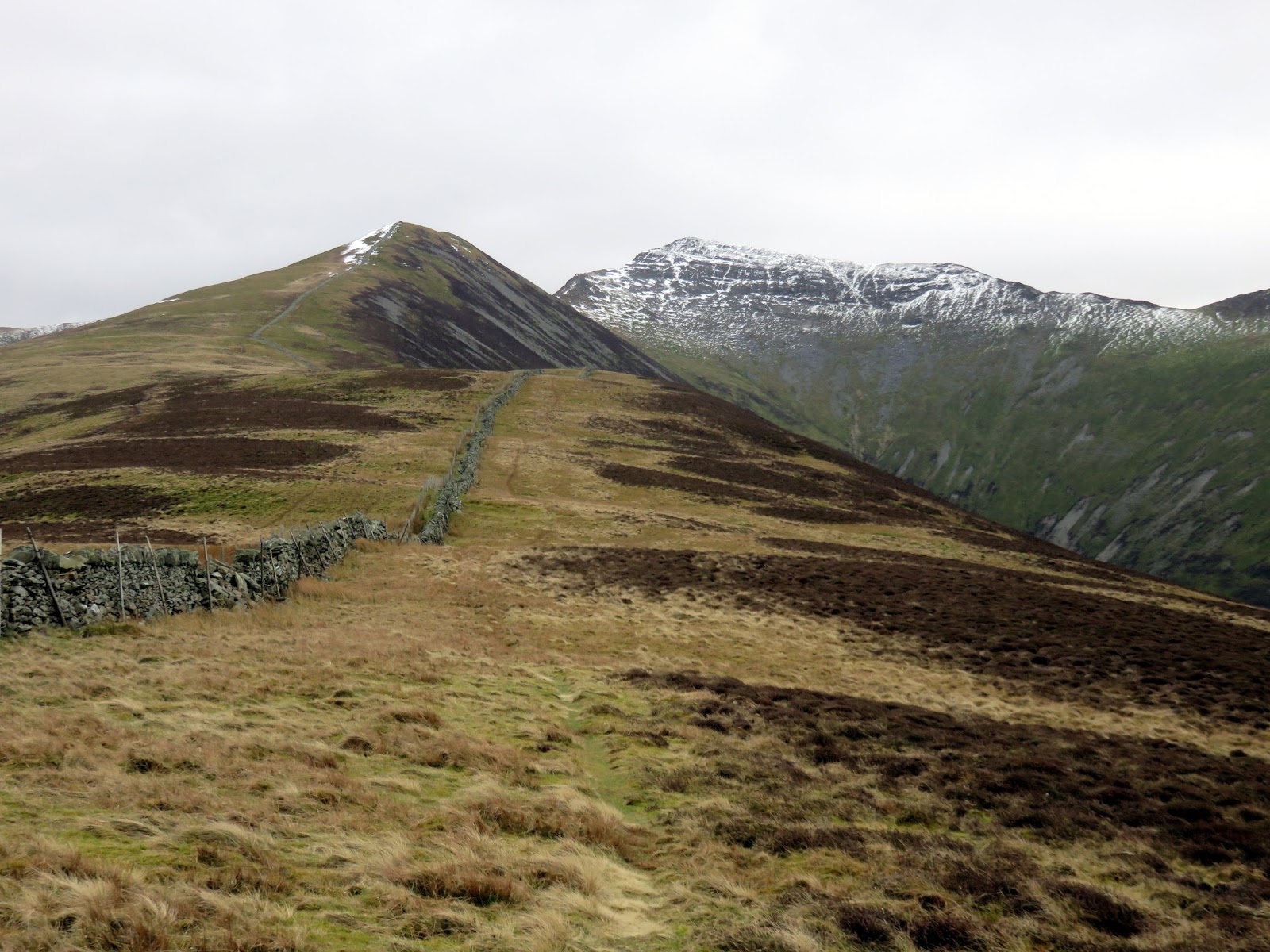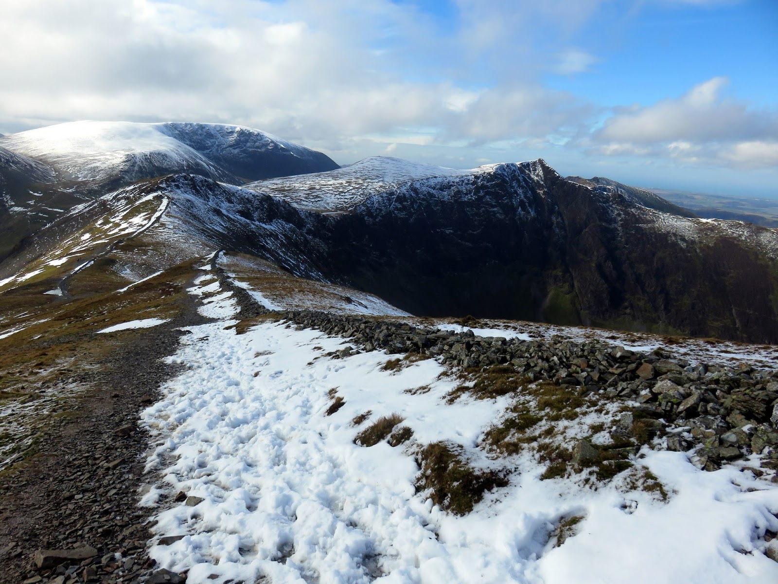 The ridge from Grisedale Pike to Hopegill Head is exciting, clinging to the rim of Hobcarton Crag as it swings round the west. Precipitous views are on offer into the Hobcarton valley, made all the more impressive by the late winter sun and snow.