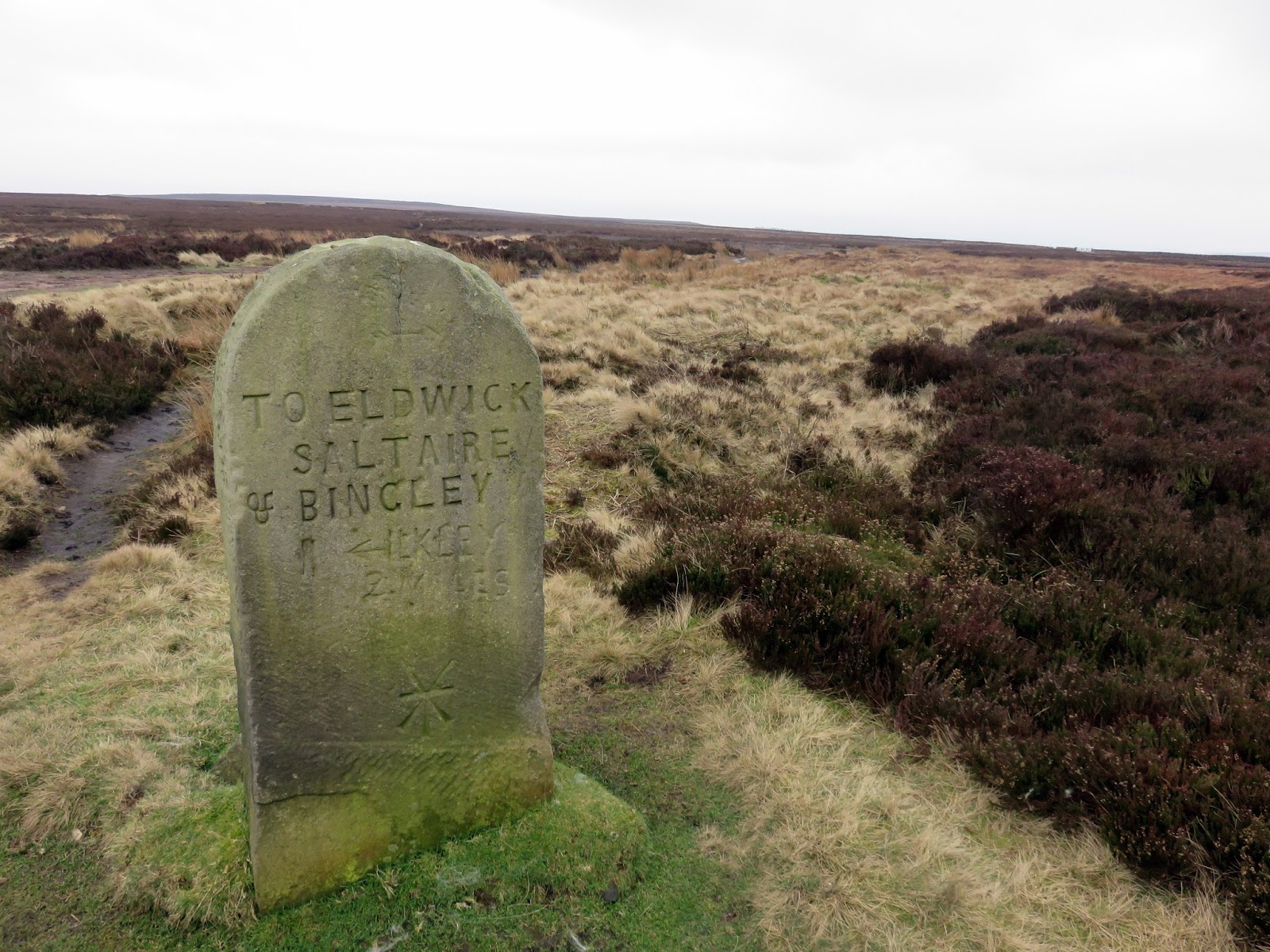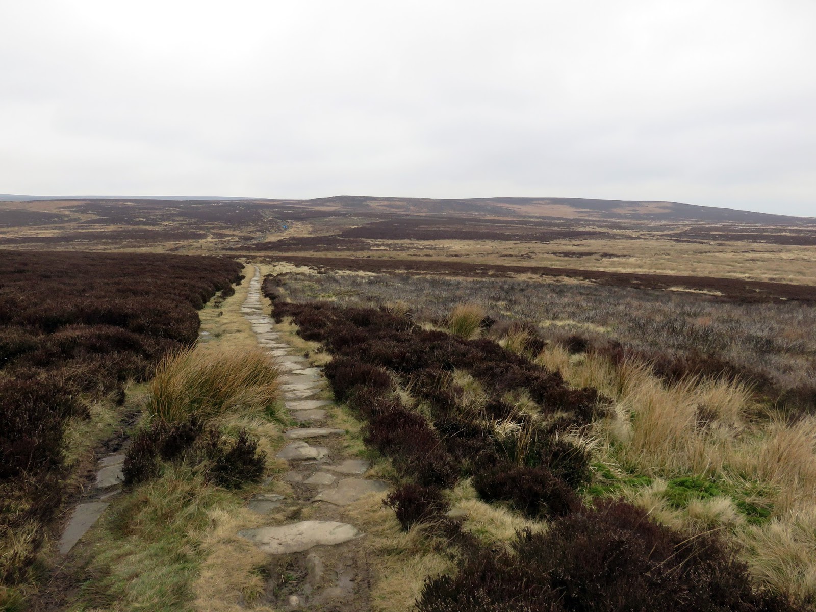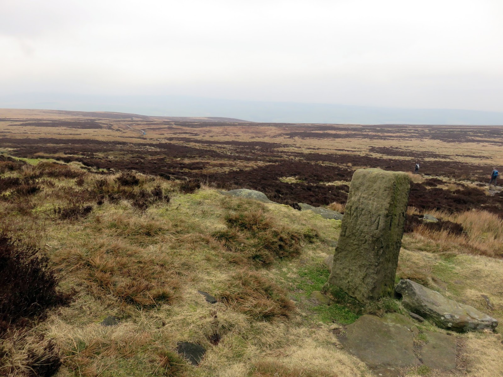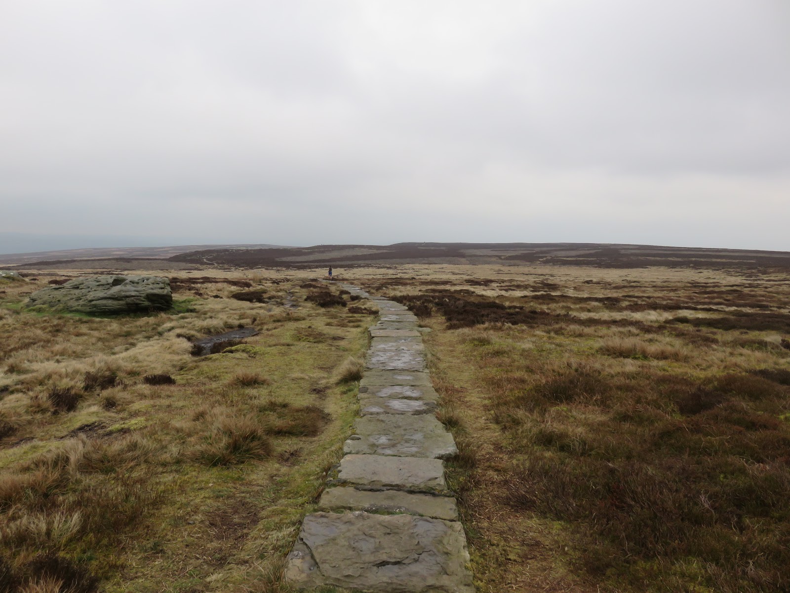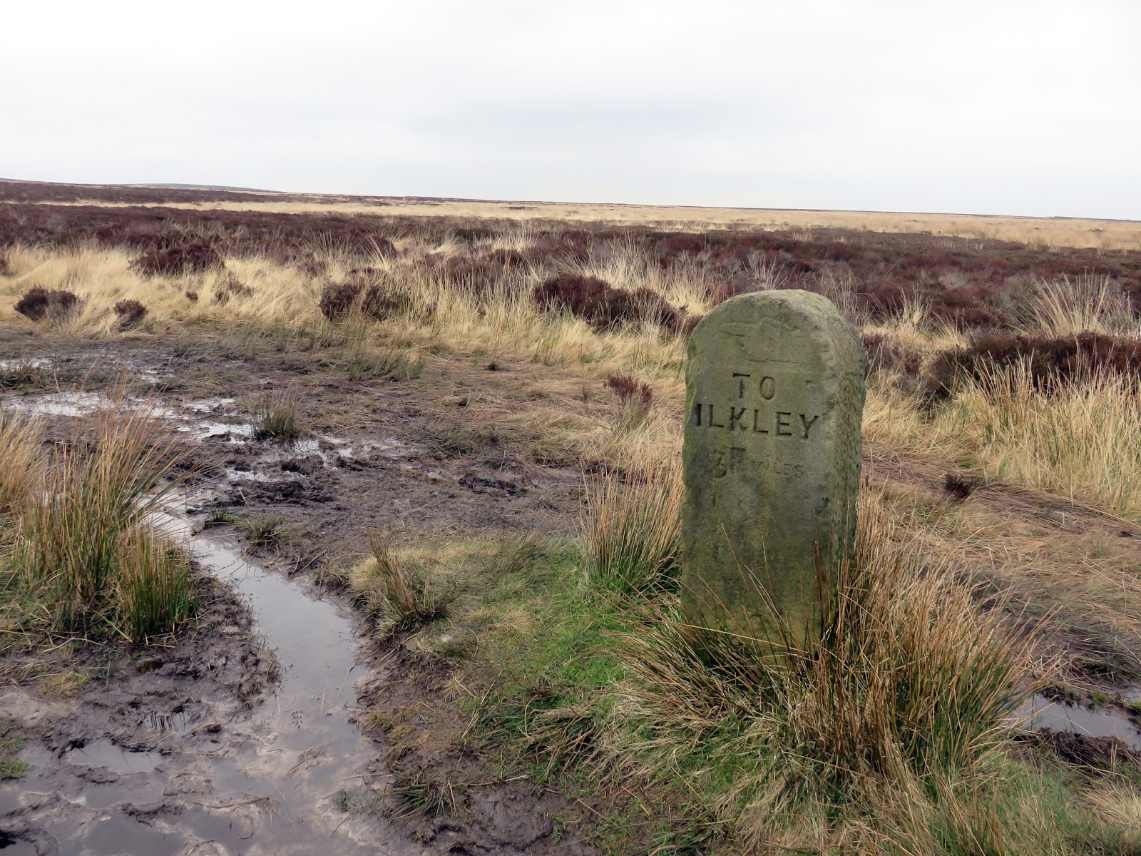 Heading to the summit is a path reminiscent of many across the Pennines – large blocks of stone floating atop a peaty bog. The shallow slopes around the summit limit the views though the radars of RAF Menwith Hill are visible on a clear day. A short distance from the summit is Lanshaw Lad, a vertical block of stone that marked the 19th Century boundary between Burley and Ilkley.