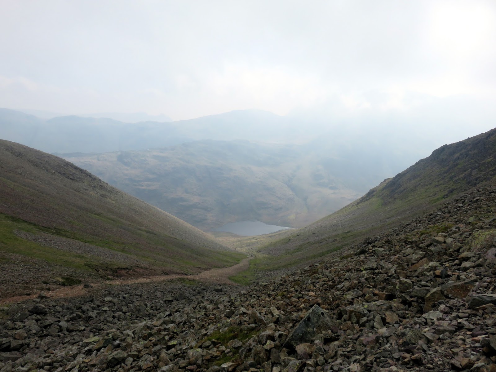 | Looking down Aaron Slack to Sty Head Tarn |
